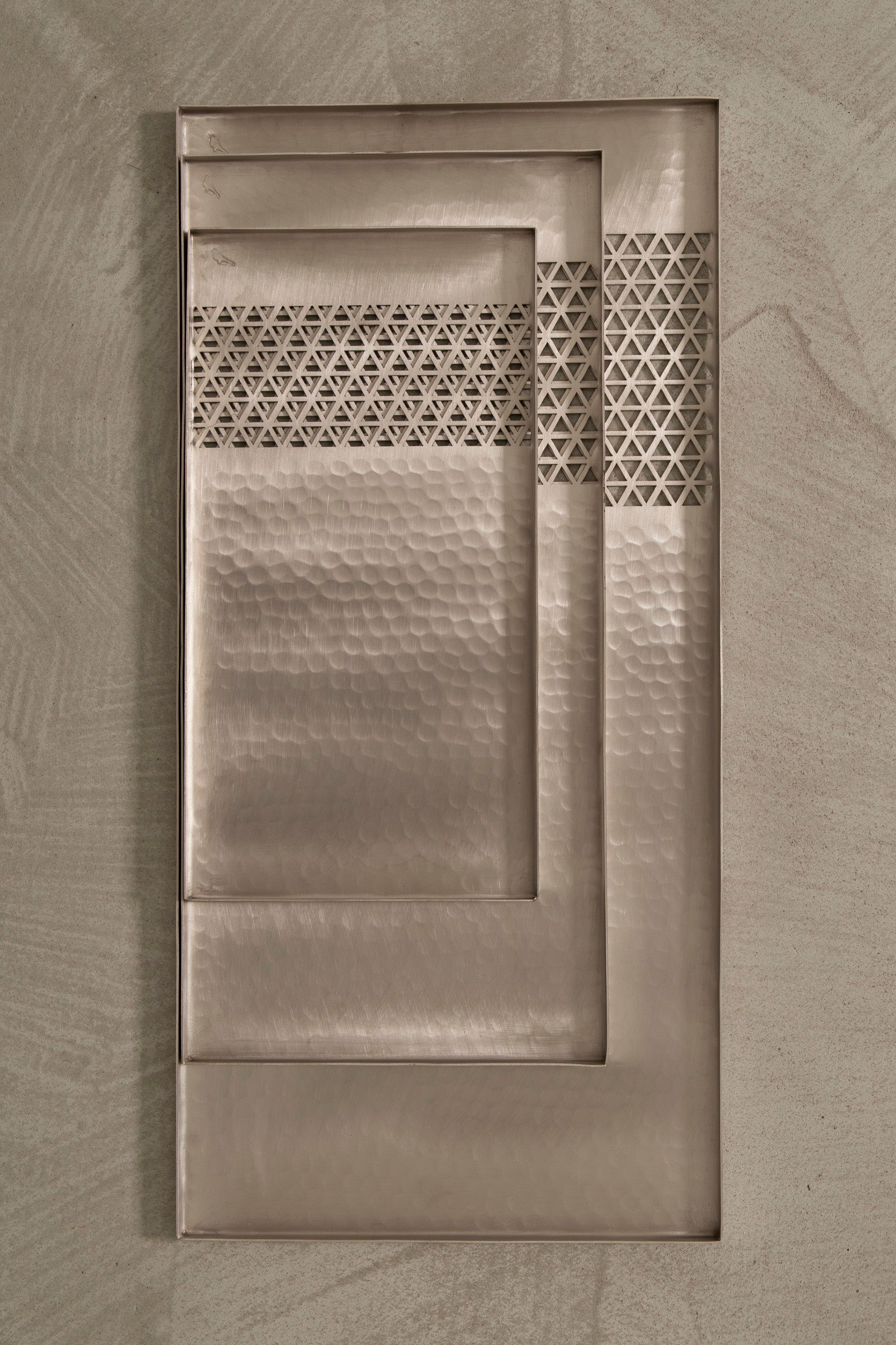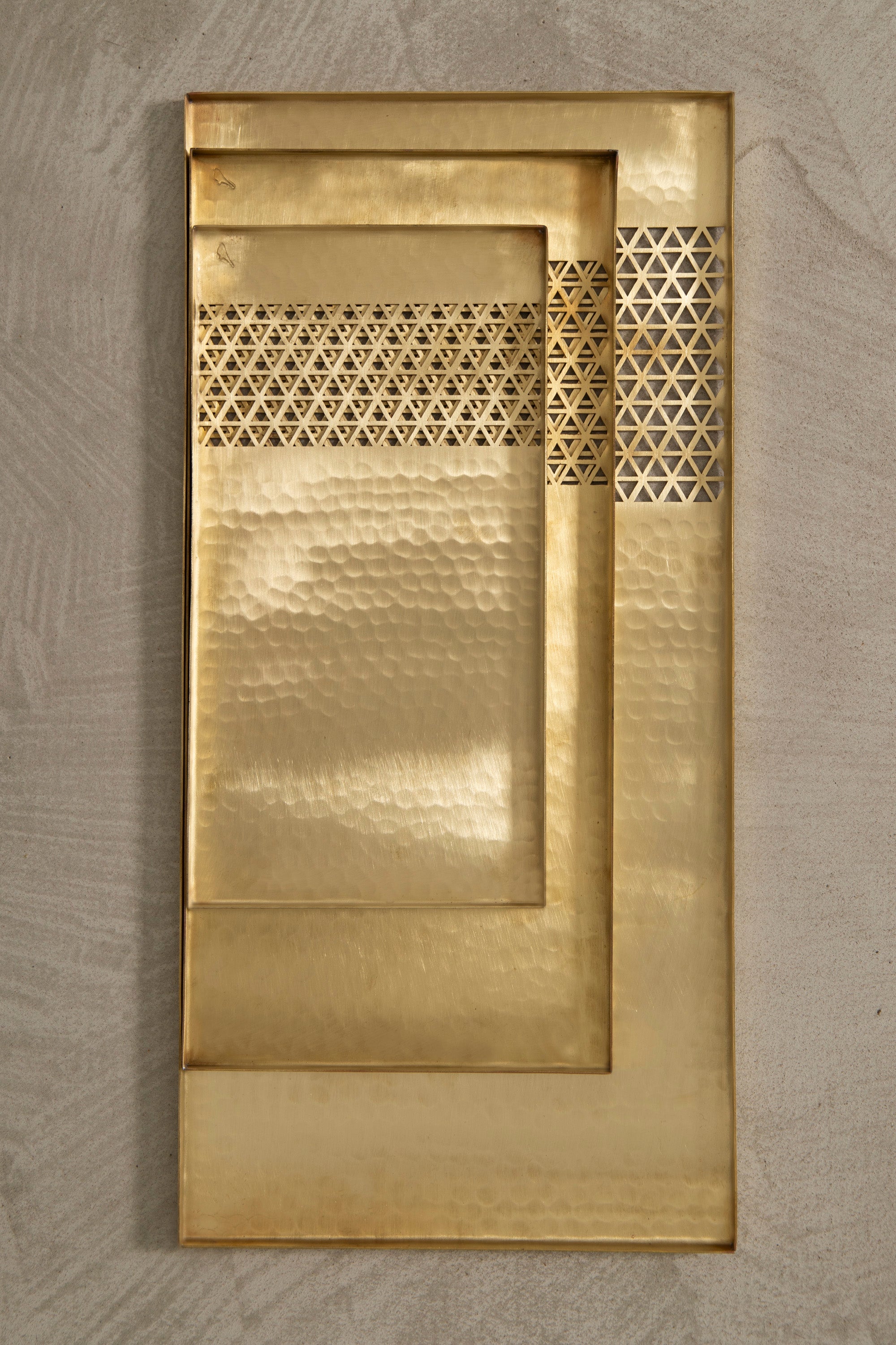 A refined trio of rectangle trays featuring hand-hammered surfaces and a signature Arabesque cutout detail. Available in tinned or brushed brass, each piece is crafted to serve or display with timeless elegance.