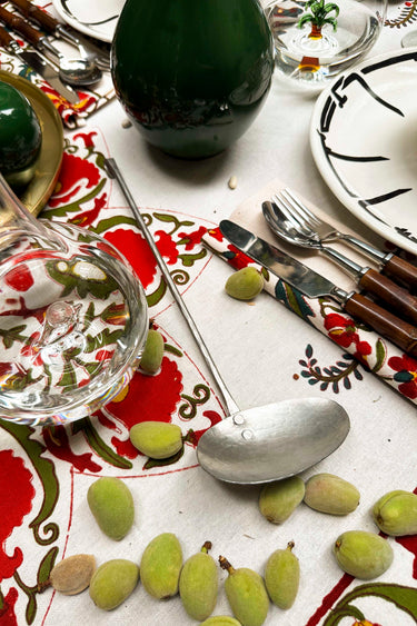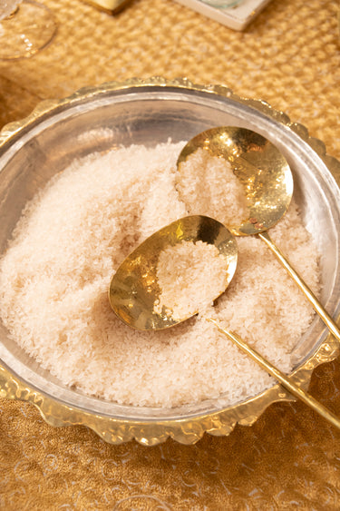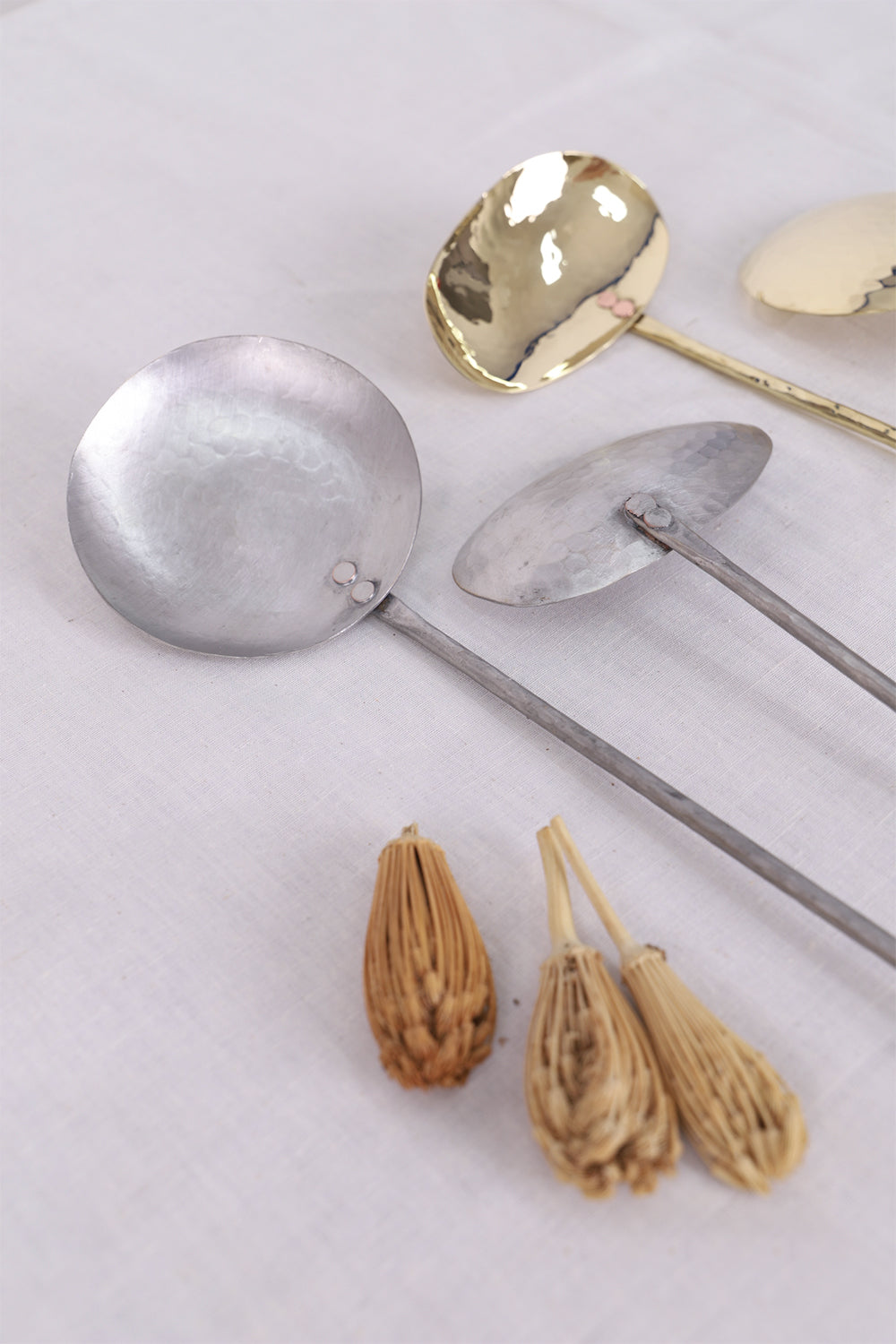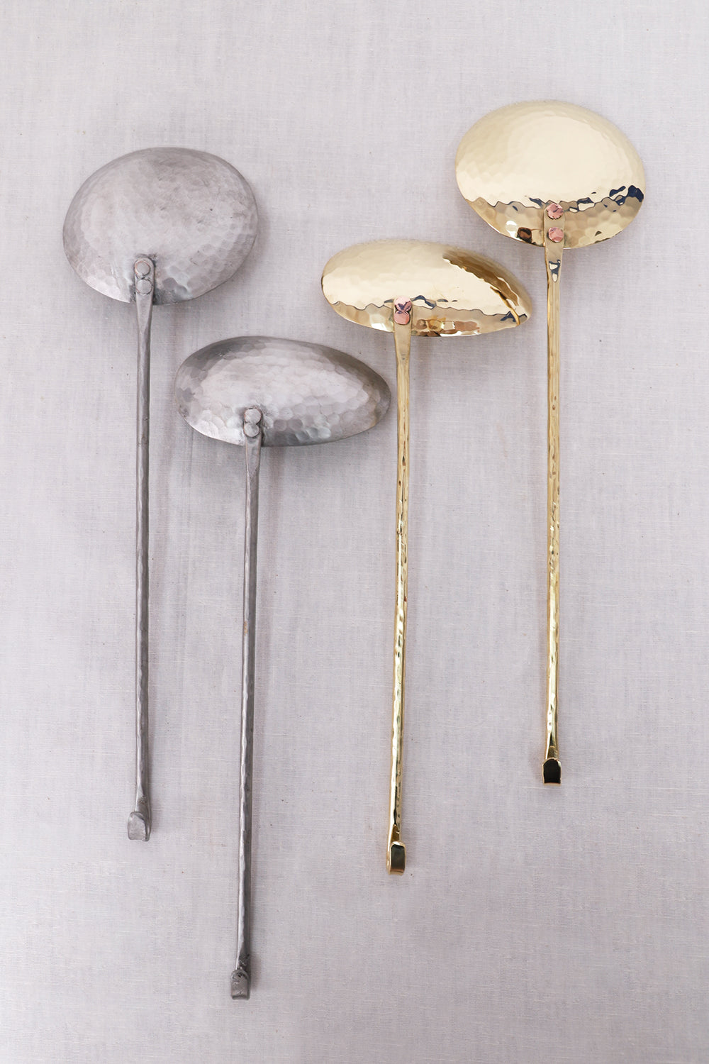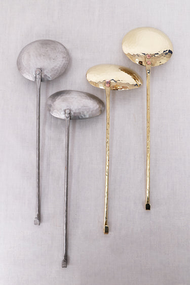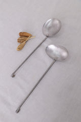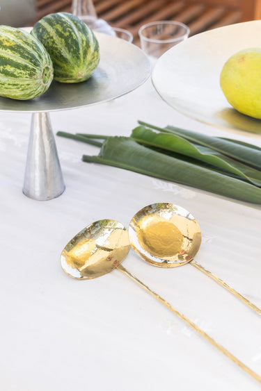 This set of two handmade brass serving spoons is perfect for serving any dish. Their oval uneven shape makes them easy to scoop.
