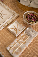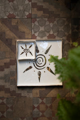 Minimalist yet striking, these square ceramic plates feature hand-painted symbols—an abstract sun and an all-seeing eye. Each plate combines clean lines with symbolic artistry, making them ideal for decorative use or elegant serving.