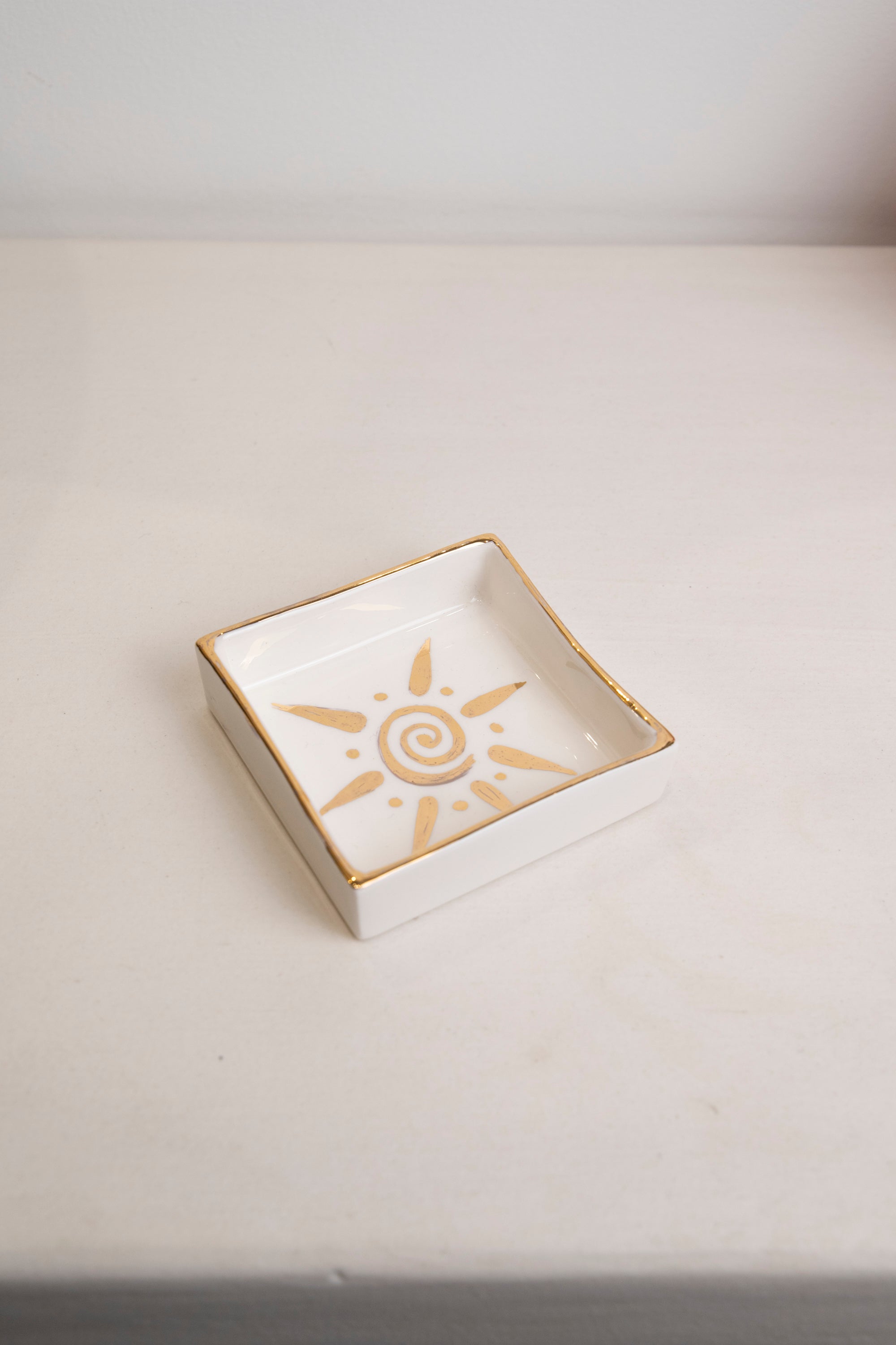 Description: Square ceramic plate with hand-painted sun or eye motif and metallic edging