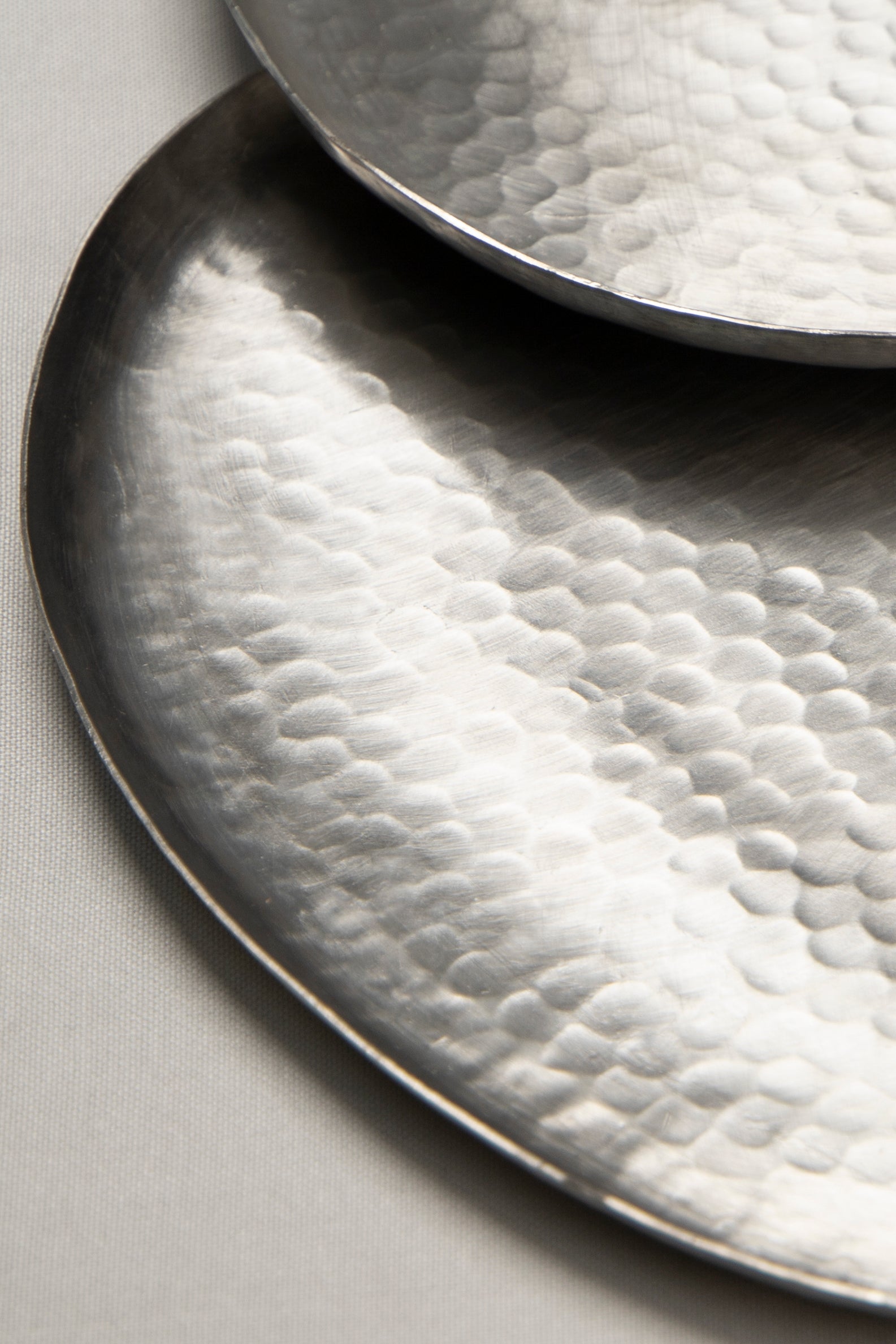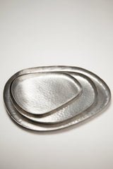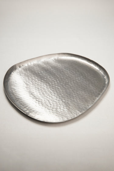 A sculptural hand-hammered brass tray with an organic silhouette and embossed texture, available in brushed brass for a warm gold finish or tinned brass for a cool silver tone. Perfect for serving or as an understated decorative piece.
