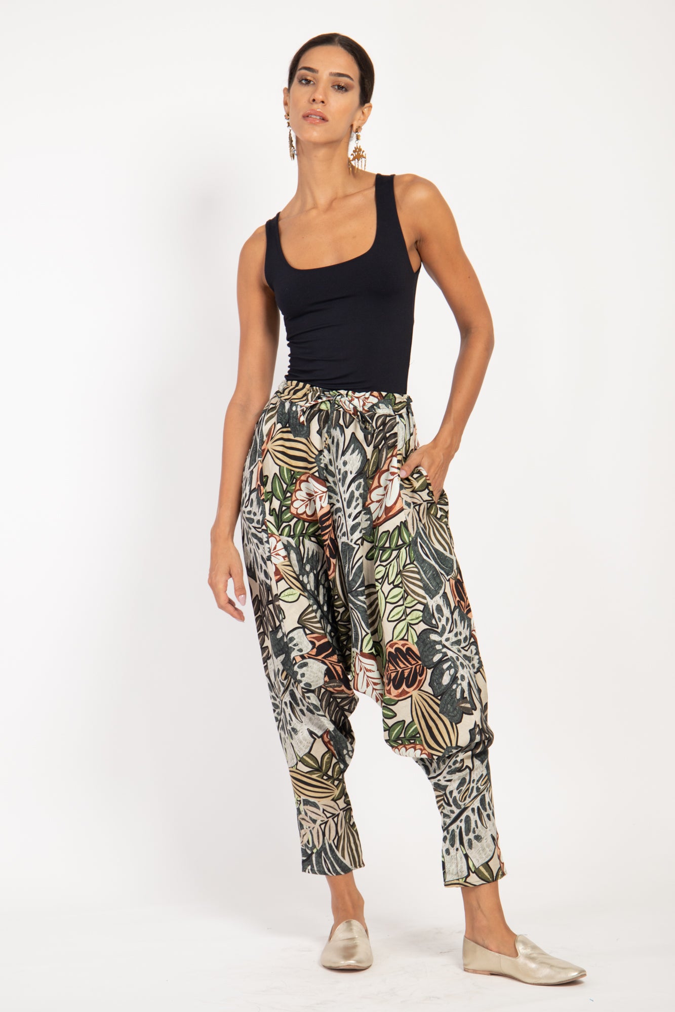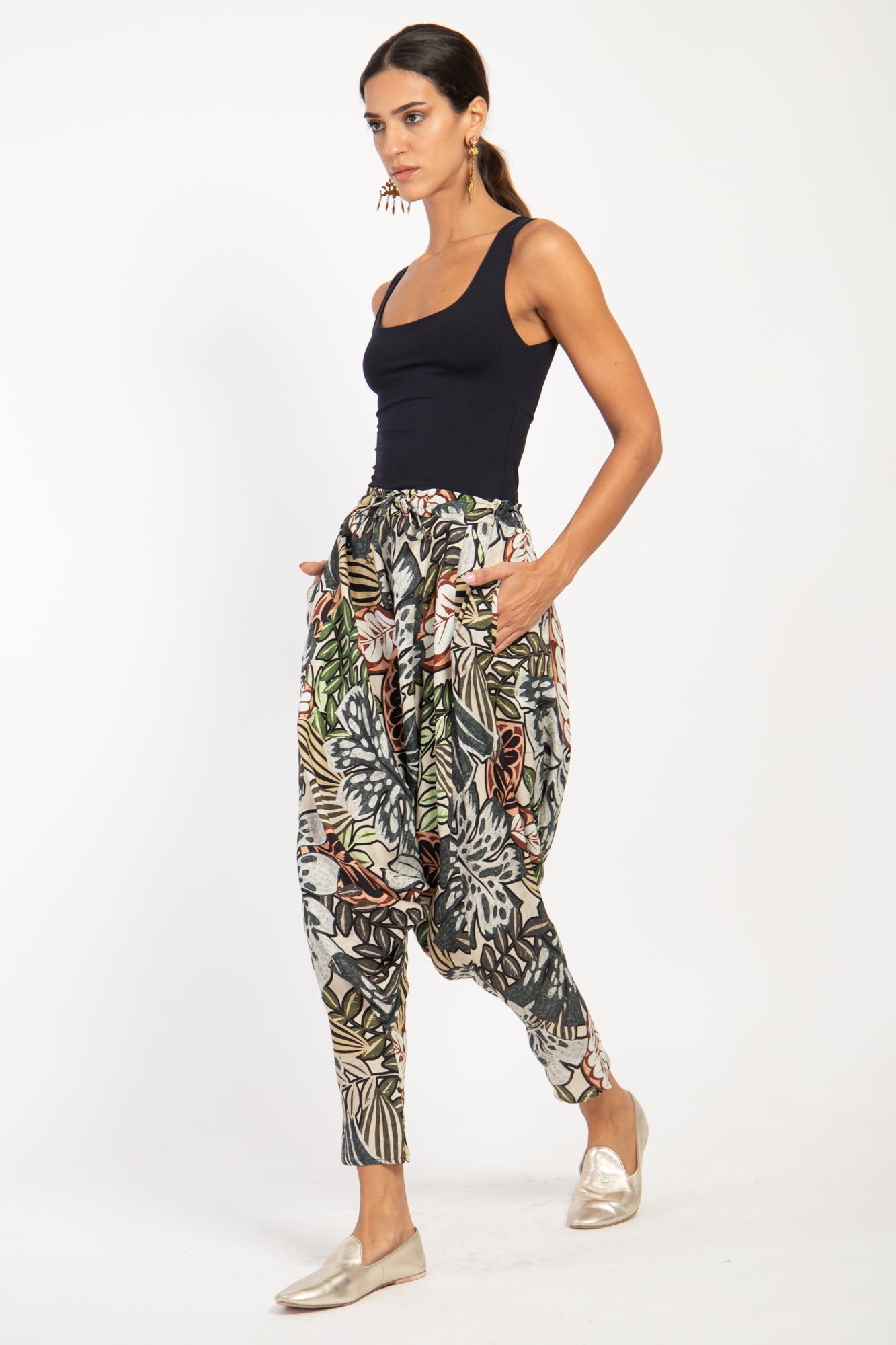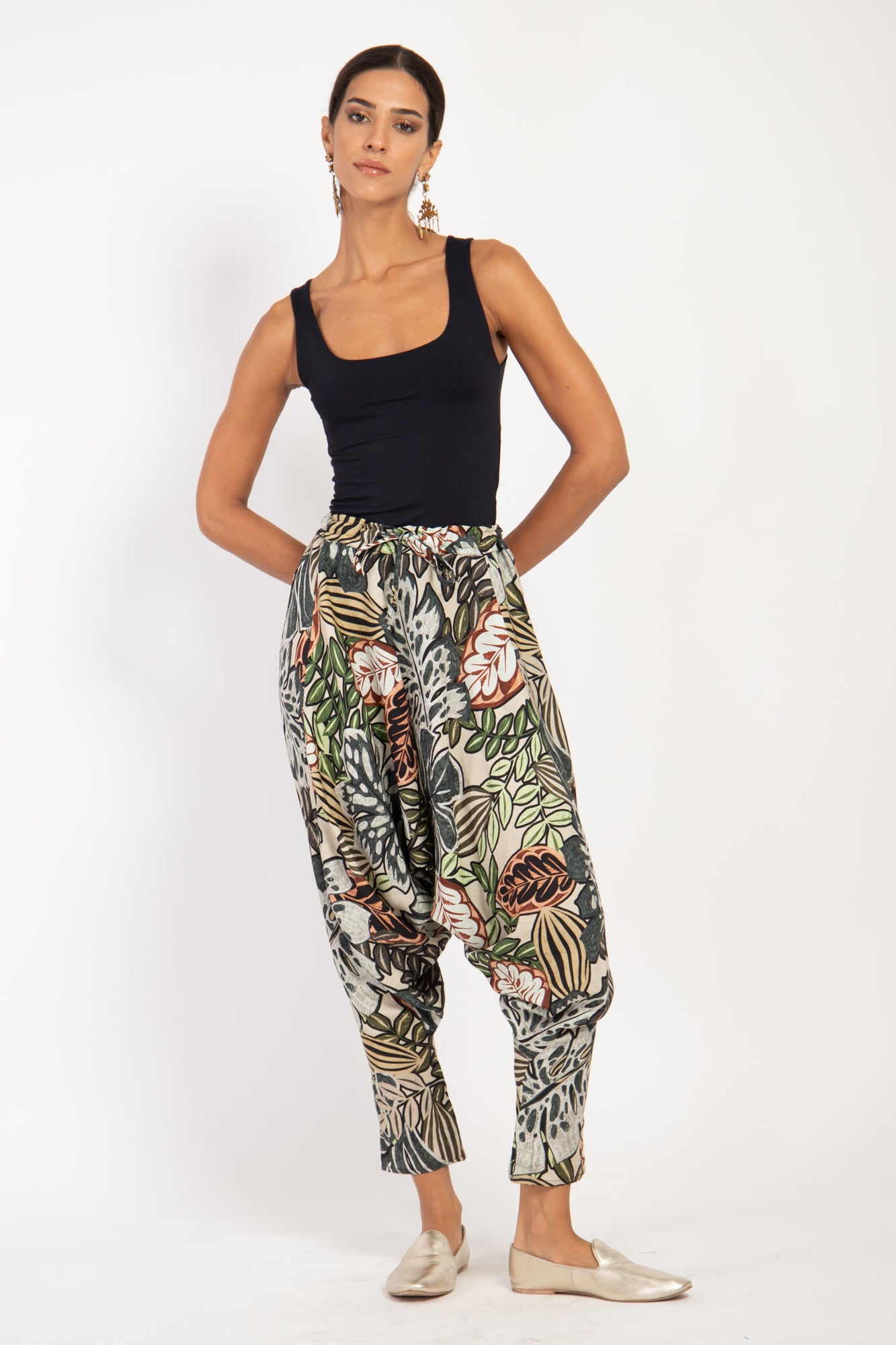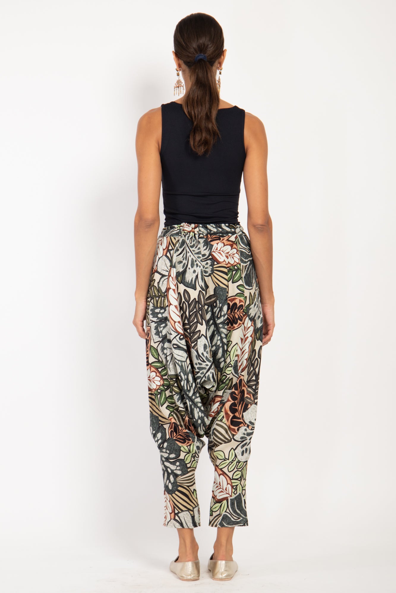 This style is gathered at the front and features concealed buttons on the ankles.