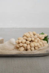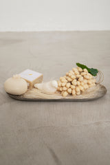 An elegant ensemble of artisanal soaps presented on a bed of natural dried loofah fibers. This curated set features a square soap, a bird-shaped soap, a pomegranate soap, and our signature grape cluster soap—each crafted to evoke the charm of nature and tradition.