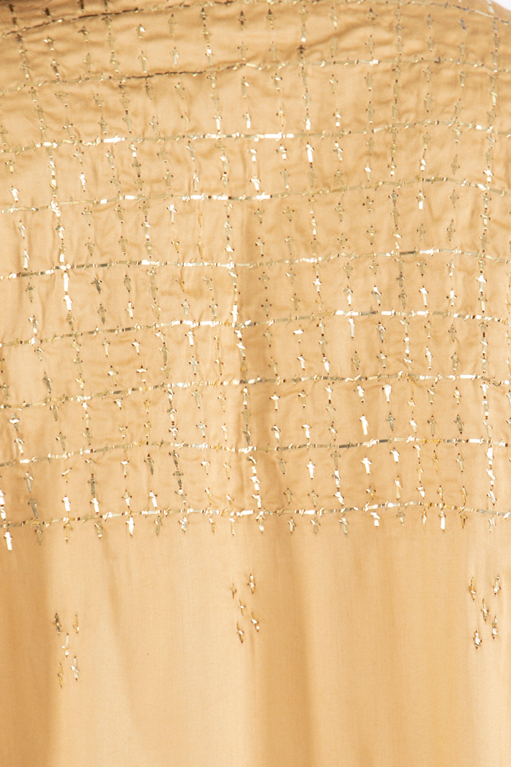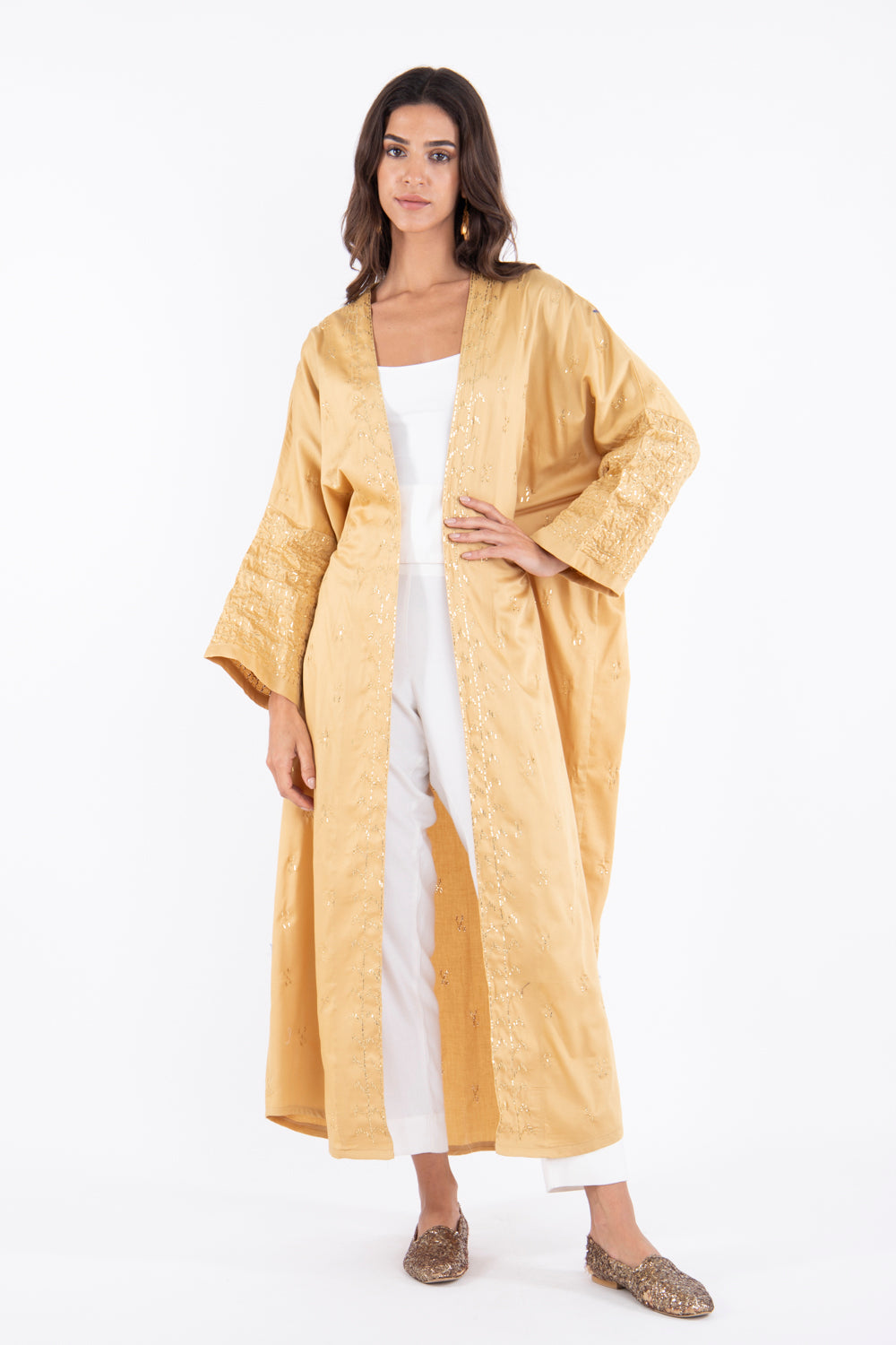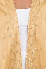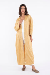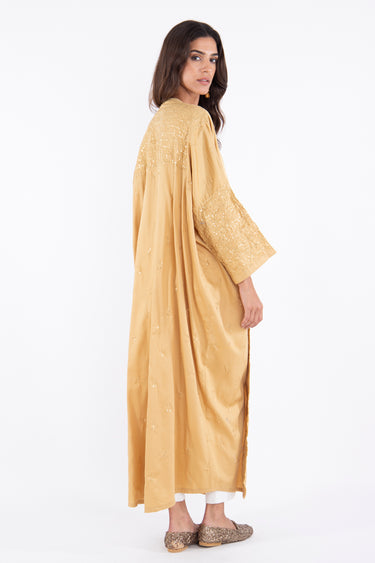 Crafted with a luxurious glaze cotton fabric, this Tarek Abaya features an elegant gold-on-gold geometric pattern hand embroidery with traditional hand-hammered metal threads from the Bekaa region in Lebanon. Sumptuously crafted using pure cotton, this sophisticated and timeless piece will grace your wardrobe for years to come.
