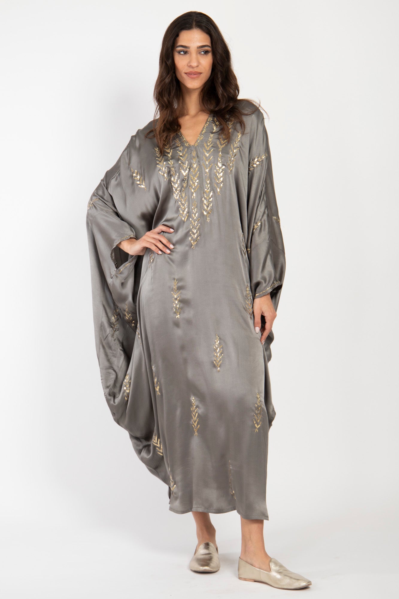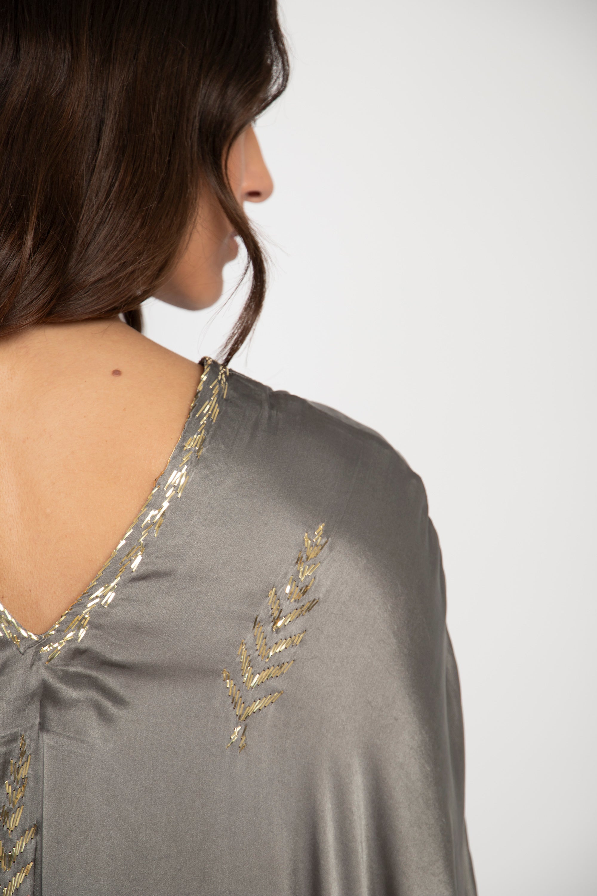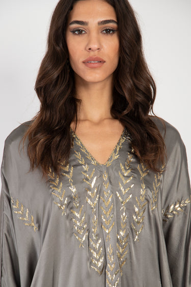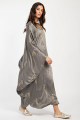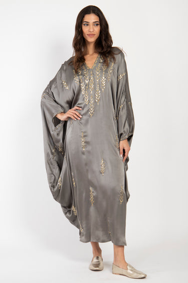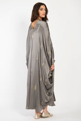 Crafted from luxurious silk, our Tareq Dress exudes an air of refinement and opulence. The silver grey fabric adds a touch of indulgence and sophistication.
