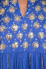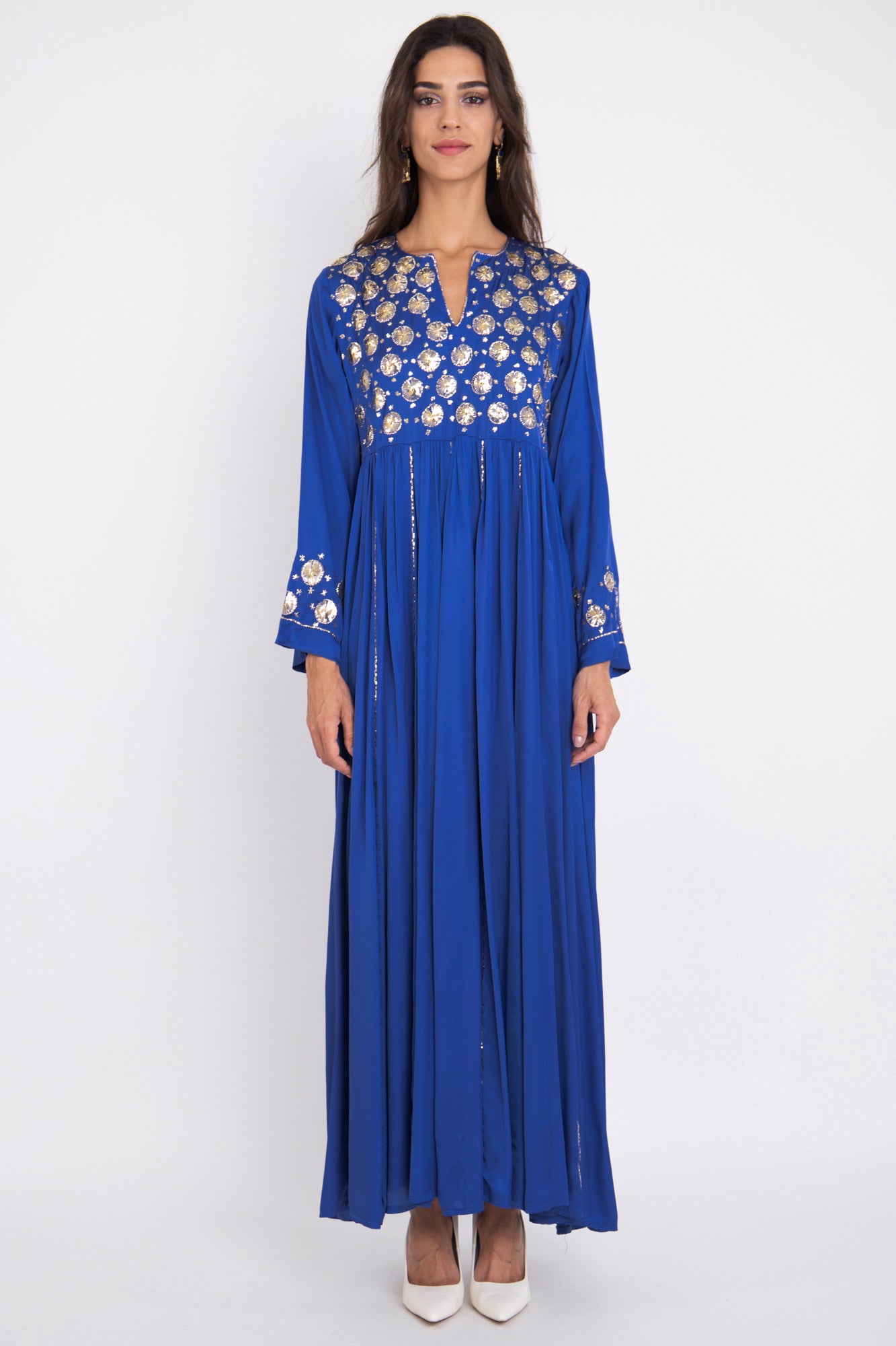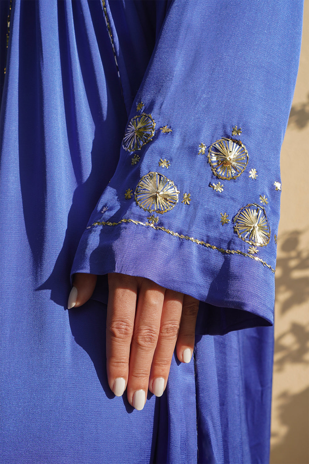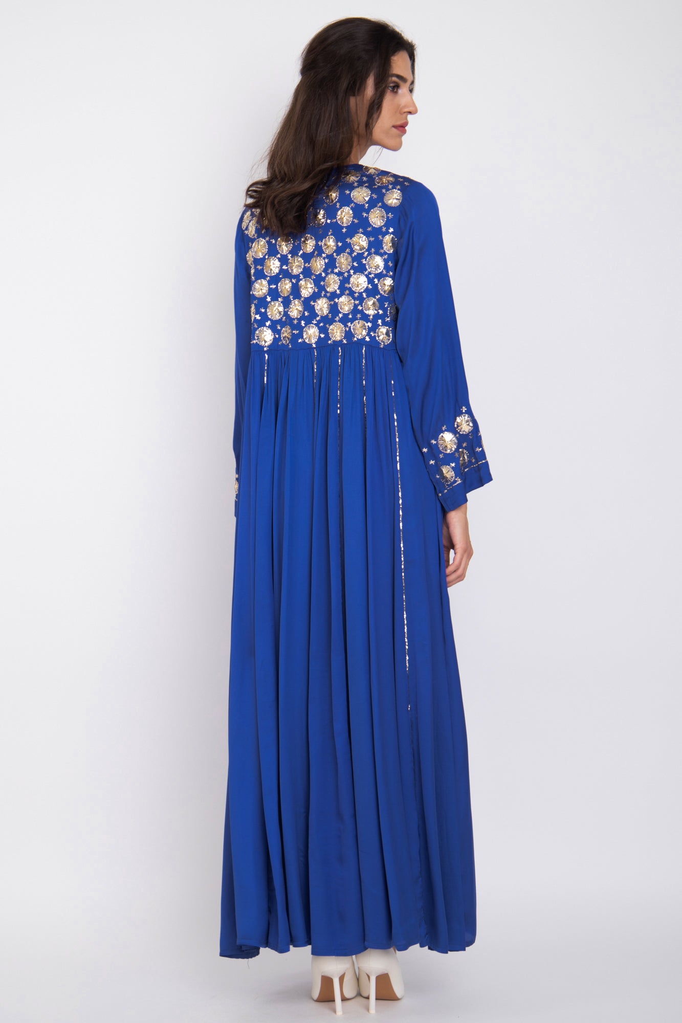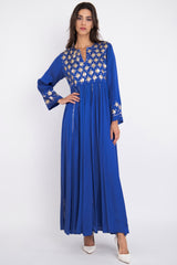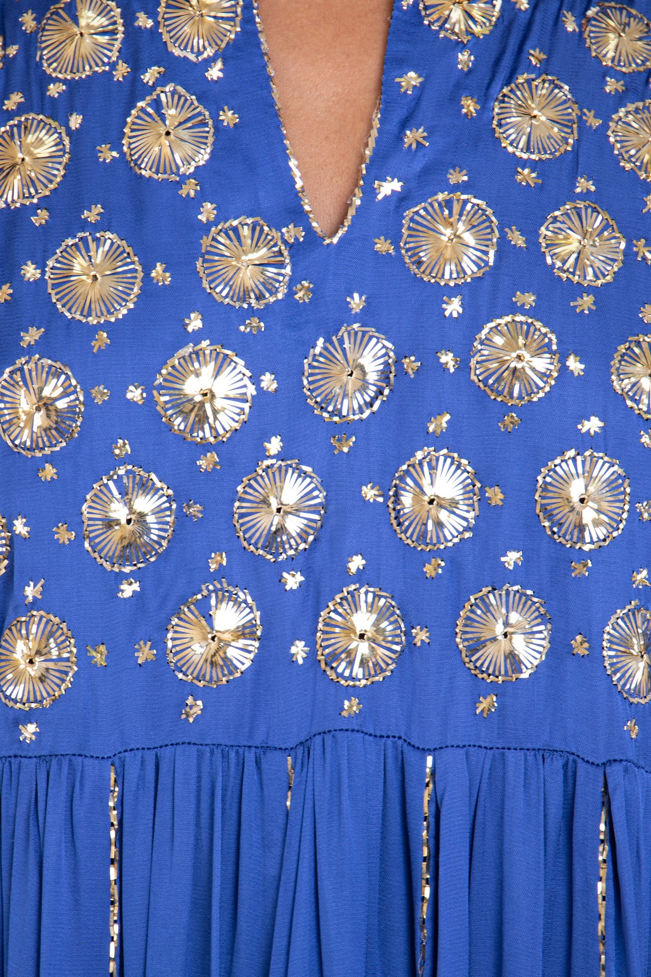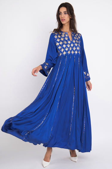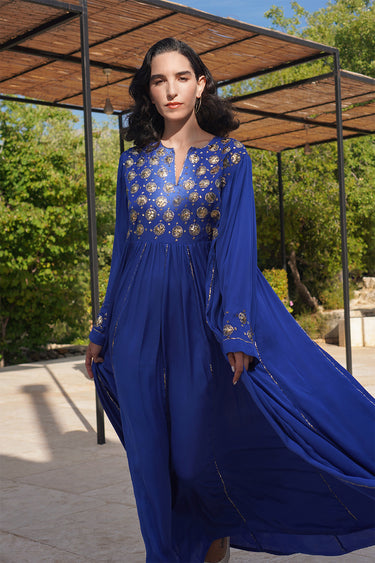 Crafted from the most luxurious silk crepe, this dress is embroidered with a hand hammered golden metal threads technique native to the Bekaa region in Lebanon. Modern yet timeless, this piece will turn heads at your next event.