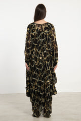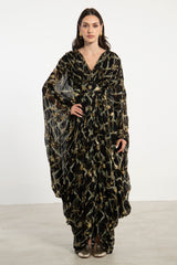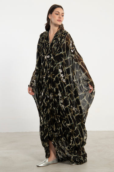 The Farah Gown is a striking piece, crafted from silk tie & dye and hand-embroidered with Tareq metal thread embroidery, a traditional technique from the Baalbeck region. Featuring a fluid draped silhouette, deep V-neckline, and inner ties to cinch the waist, it exudes both heritage and contemporary elegance.