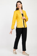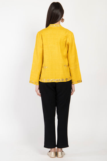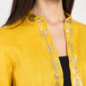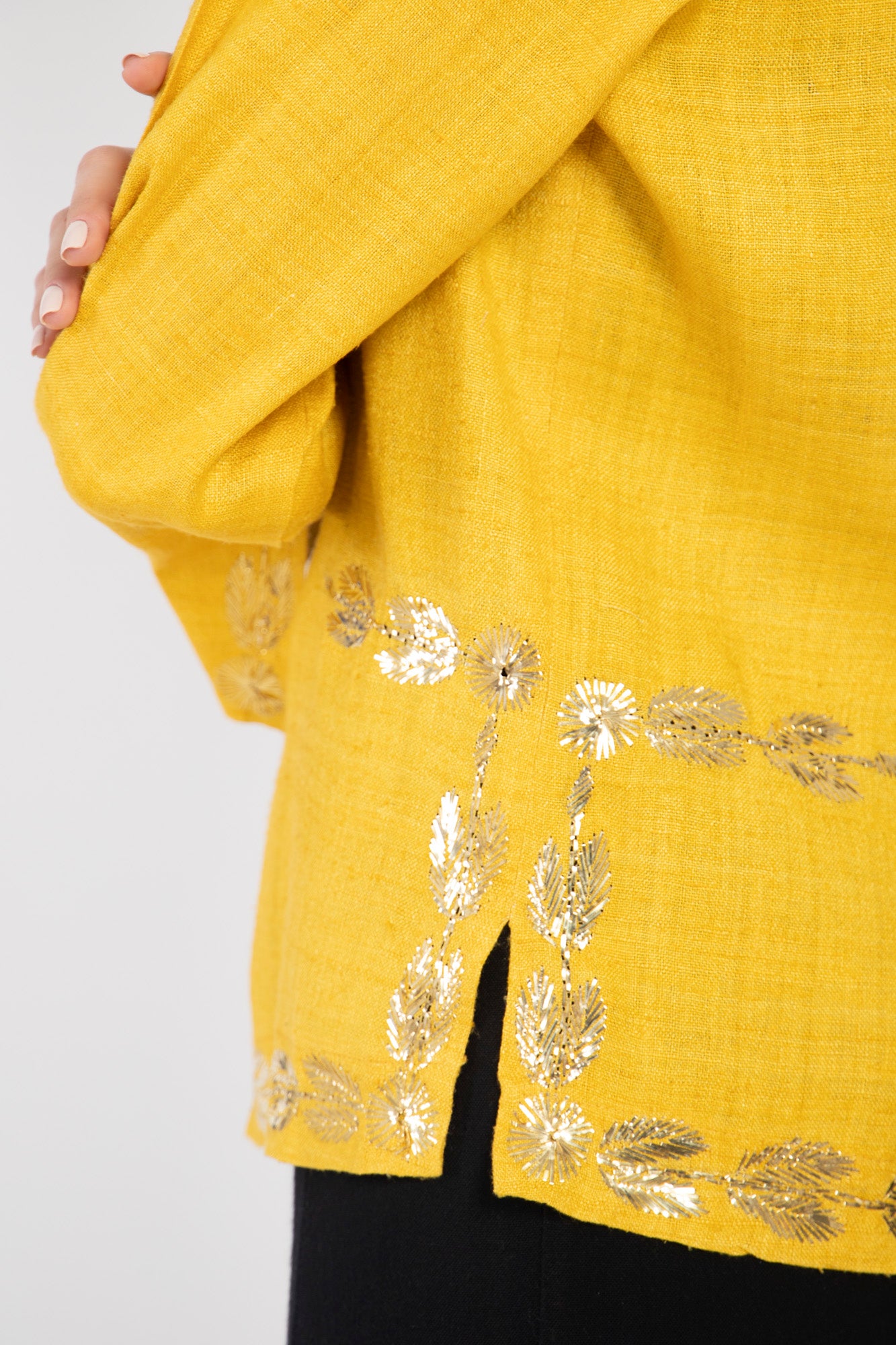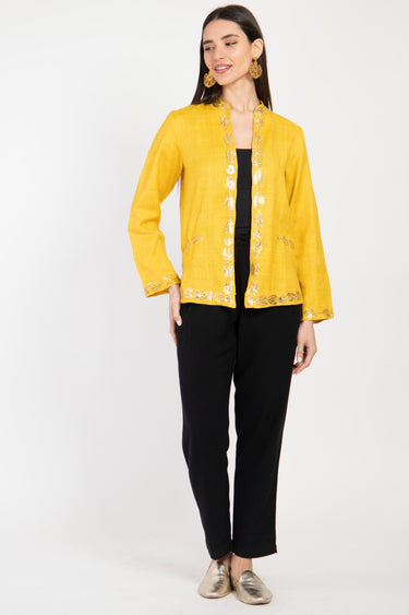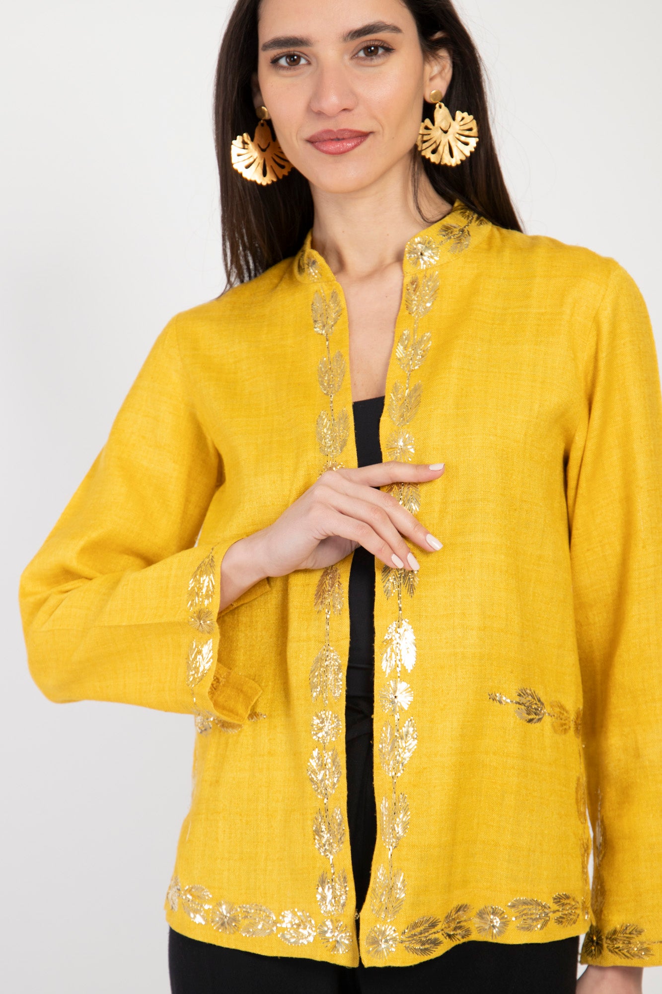 Crafted from scrim silk, this jacket is embroidered with a hand hammered metal threads technique native to the Bekaa region in Lebanon. Modern yet timeless, this piece elevates your wardrobe.