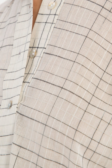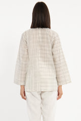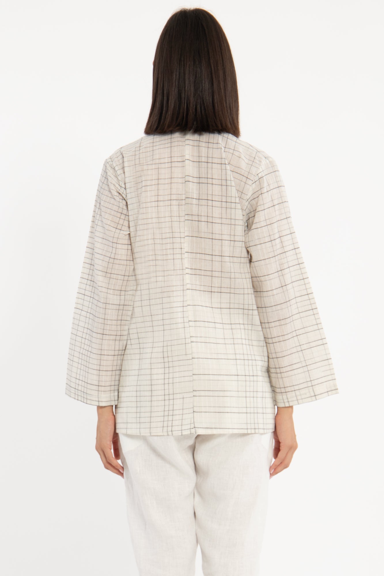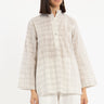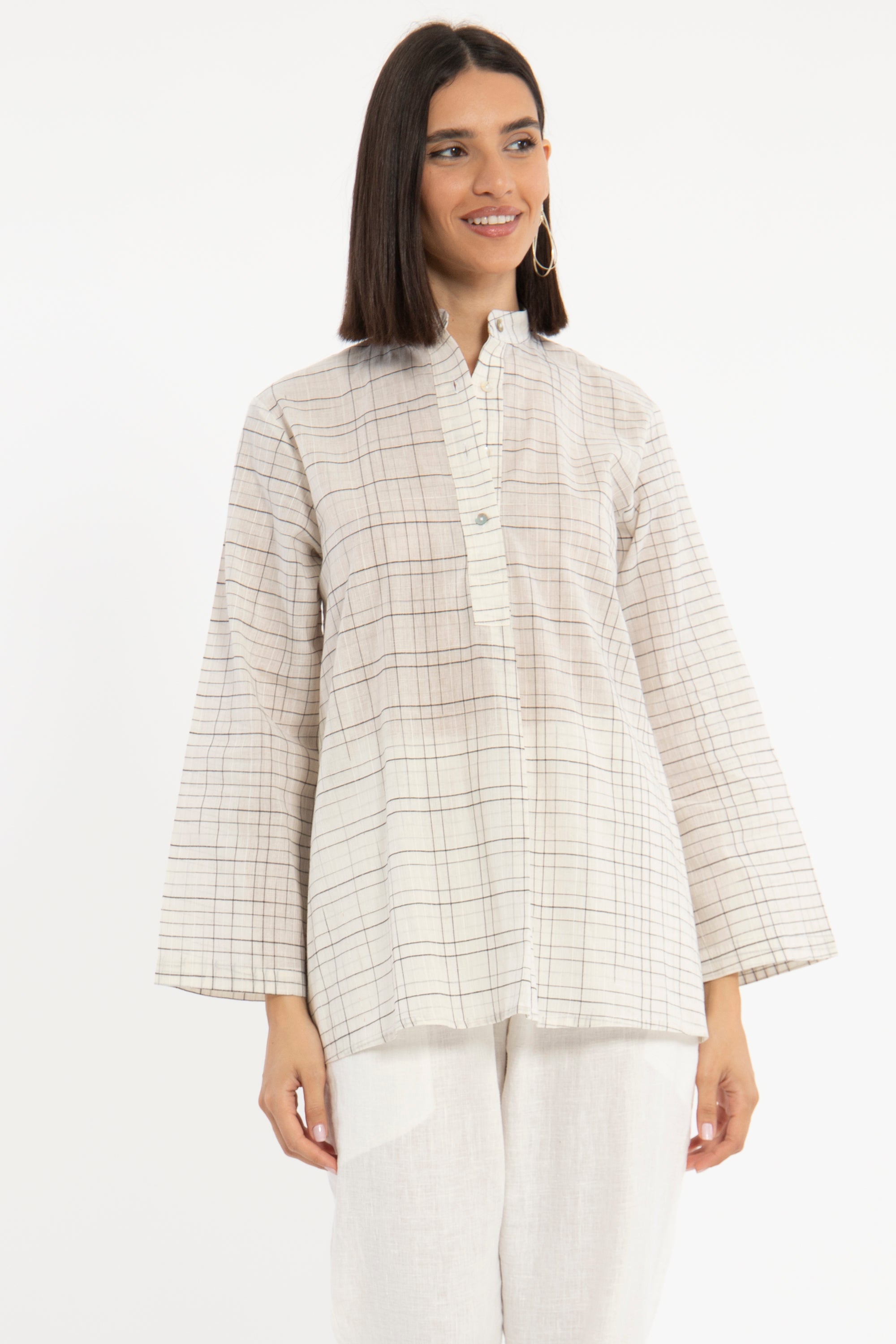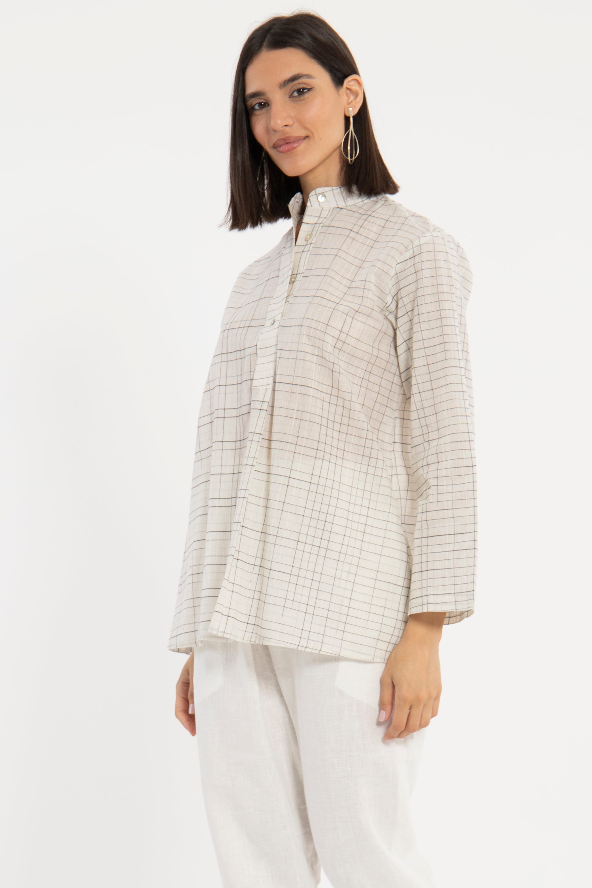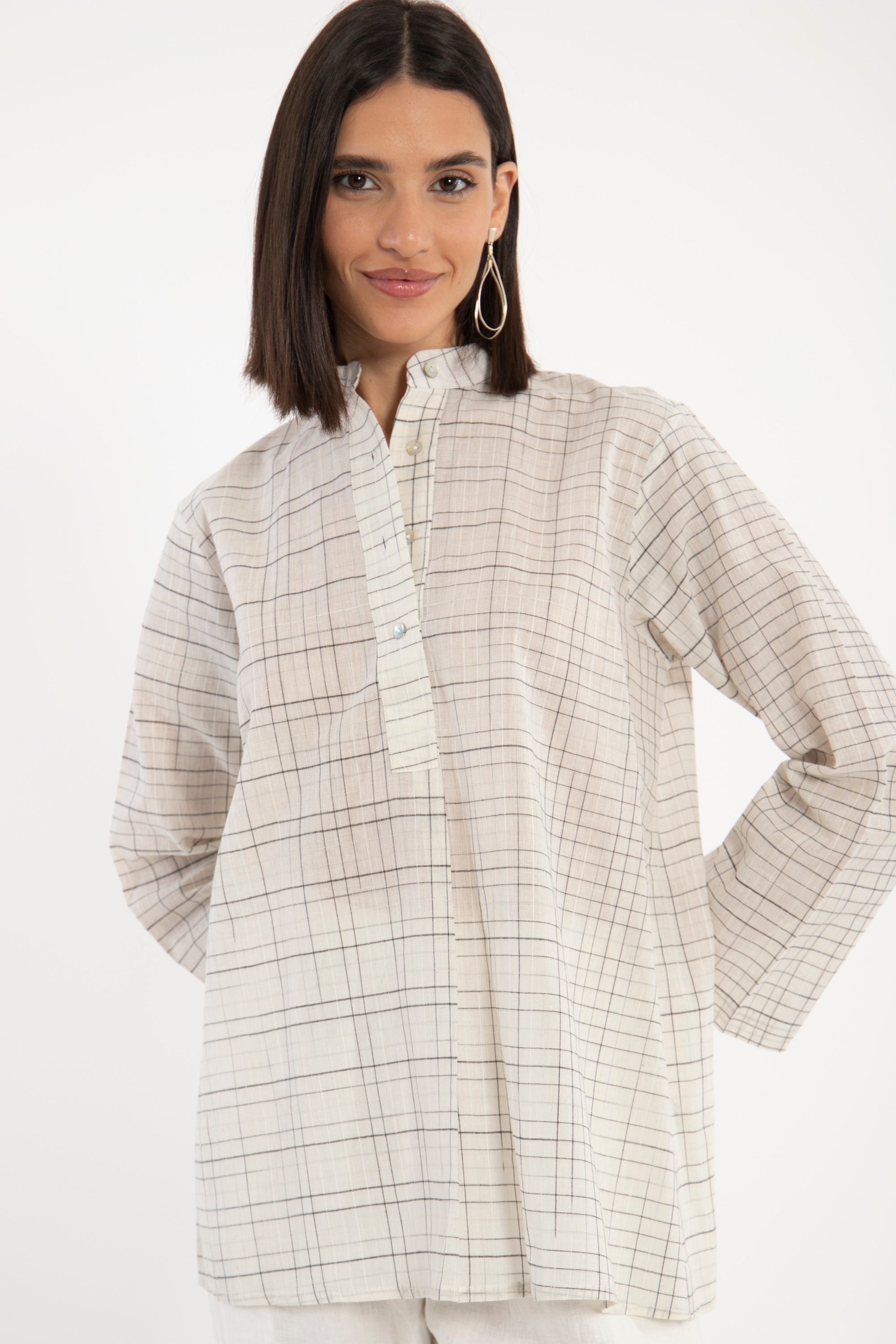 The Yousra shirt is crafted from hand-loom cotton, featuring a subtle grid check pattern in soft neutrals. Designed with a stand collar, partial button placket, and relaxed sleeves, it offers effortless elegance for everyday wear.