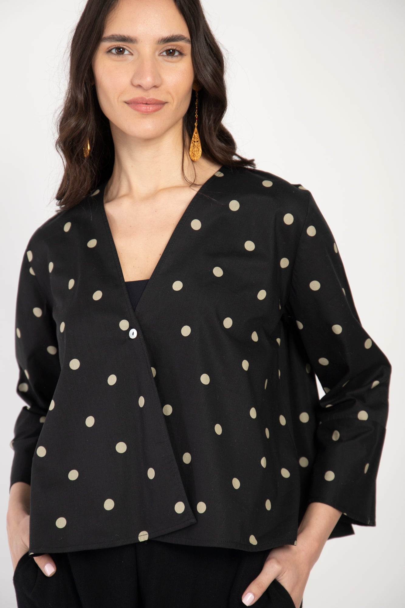Made from cotton, this summer blouse is printed with dots all over and fasten with one single mother of pearl button on the chest.