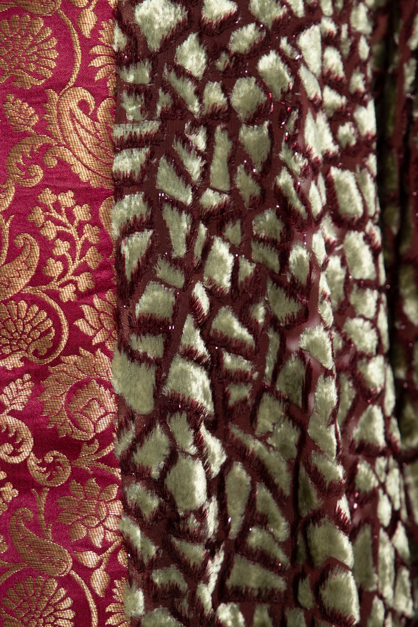 Fabric: Deep burgundy and olive velvet devoré with gold-embroidered silk brocade accents