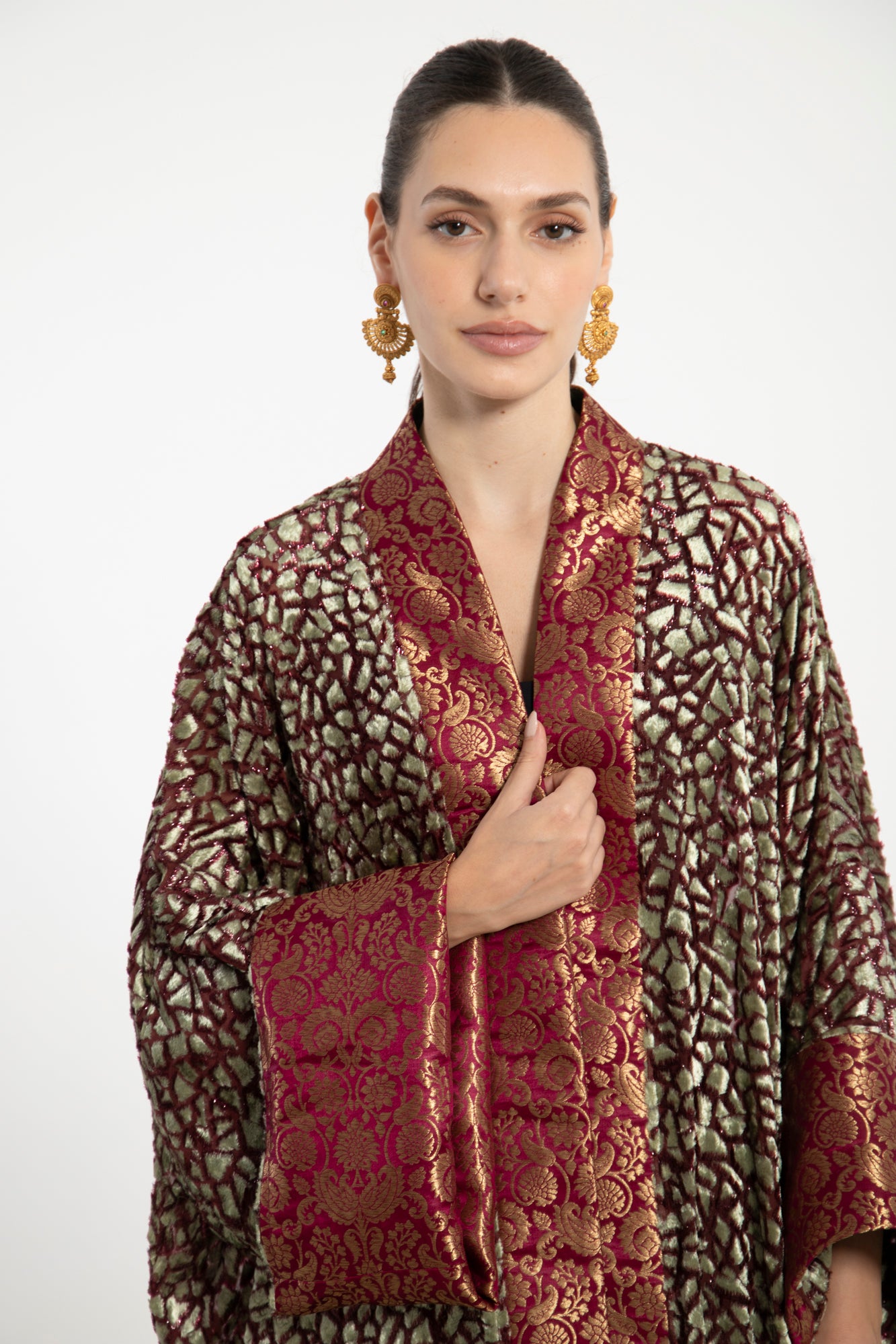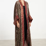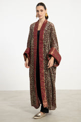 A striking fusion of textures, the Maliha Abaya is crafted from patterned velvet devoré and trimmed with rich burgundy silk brocade. Its wide sleeves and open front silhouette exude opulence and grace.