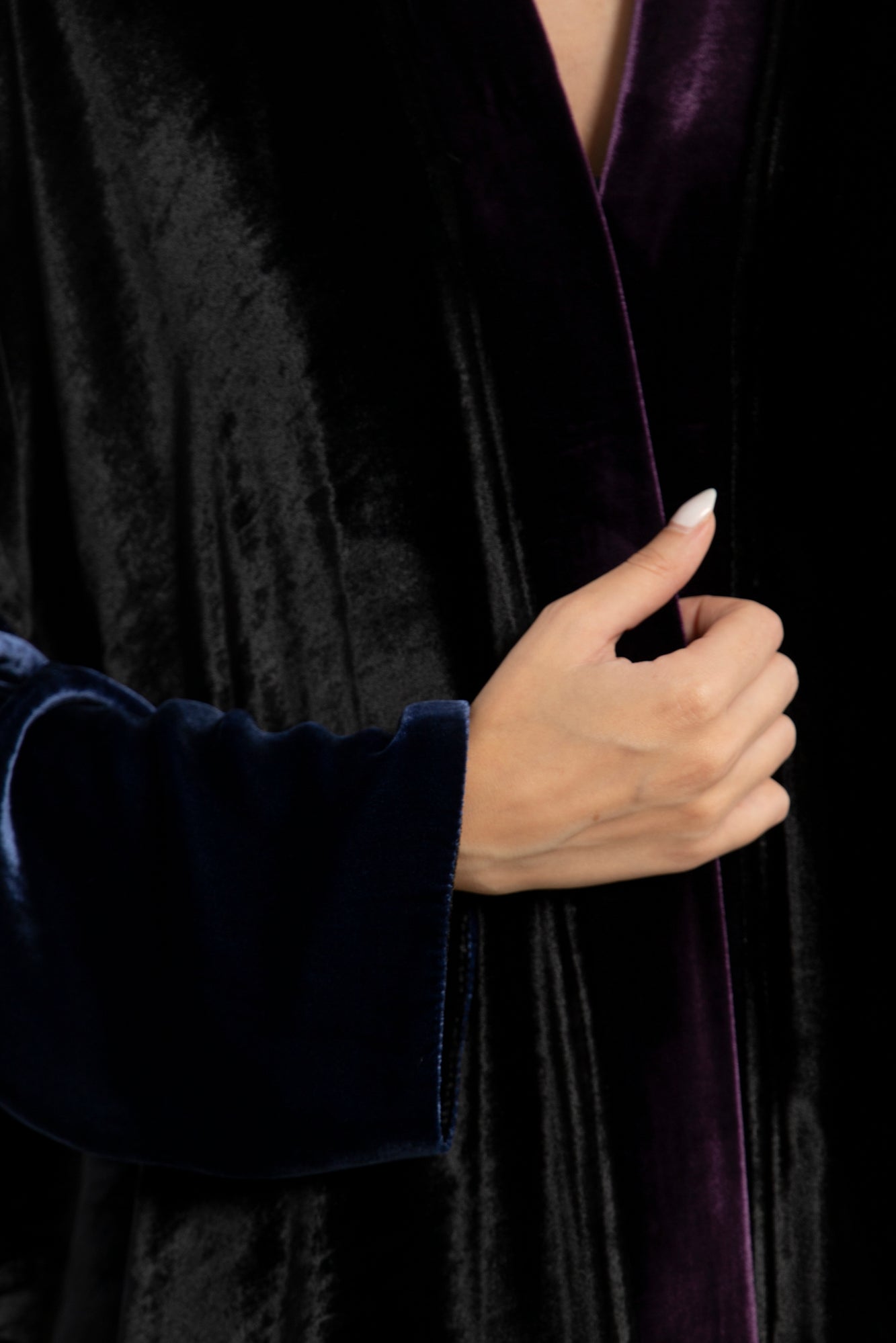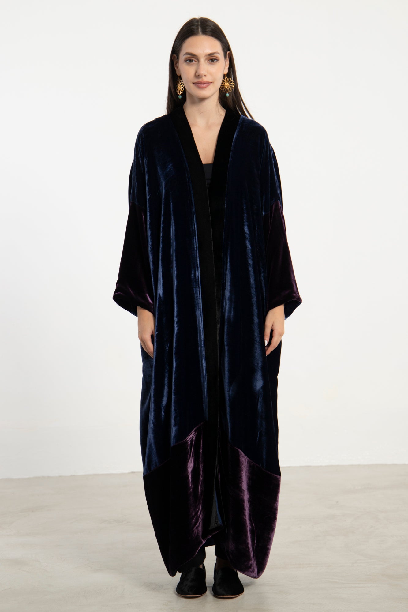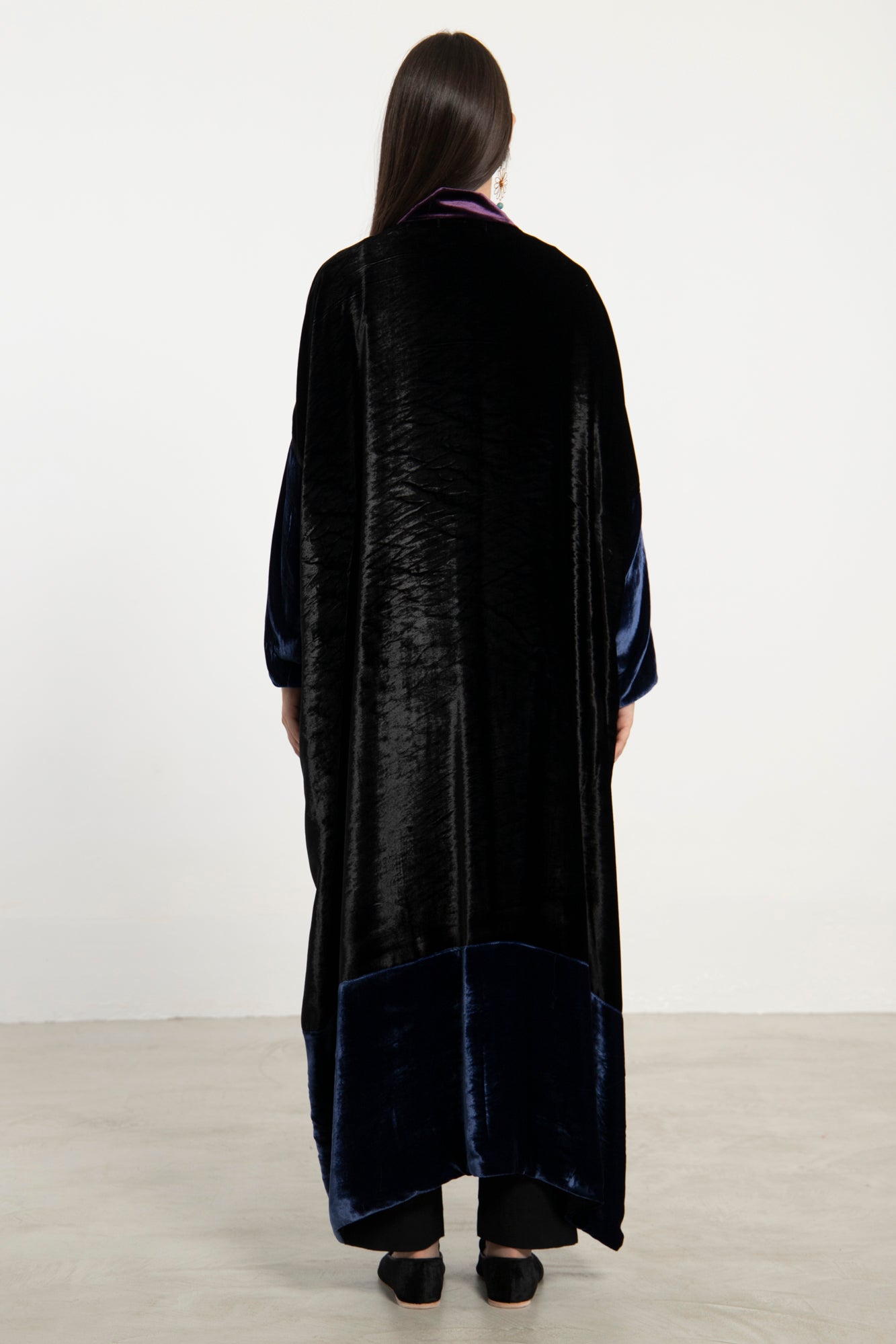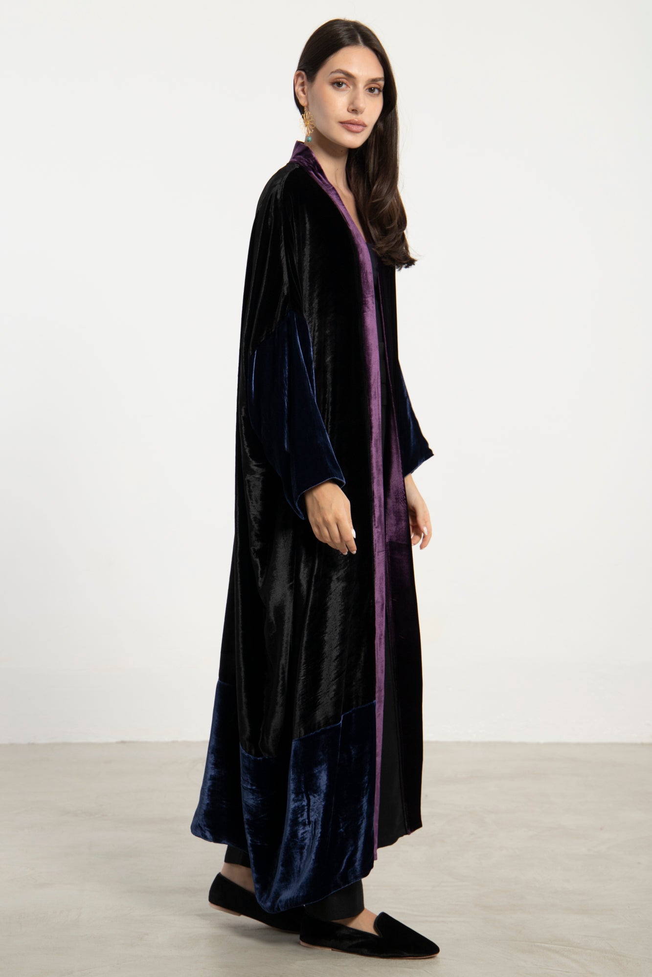 Details: Open abaya with wide sleeves and color-blocked velvet panels in black, blue, and purple