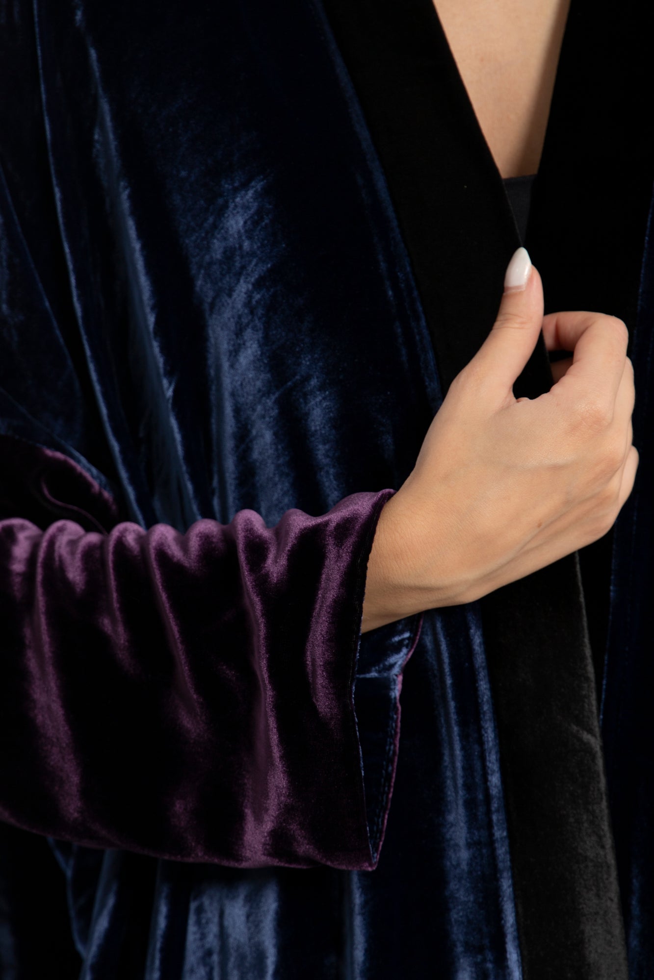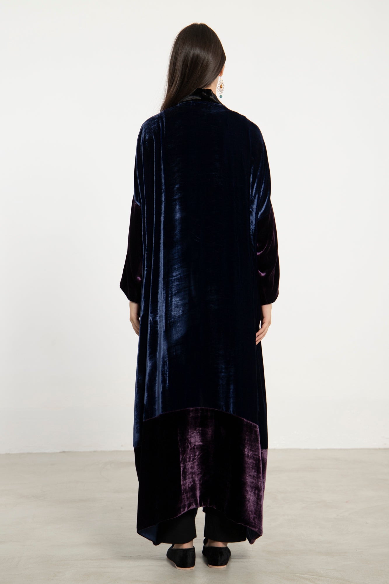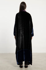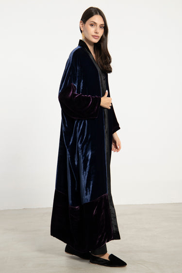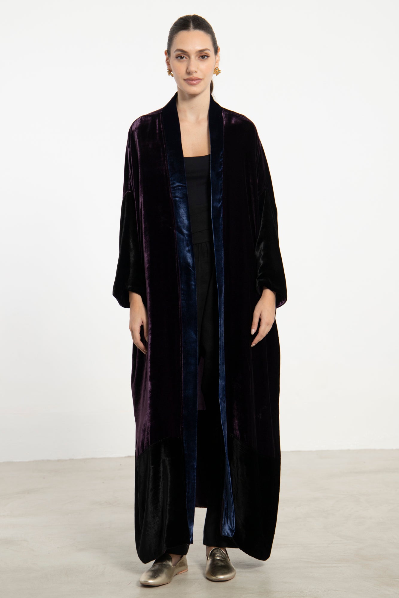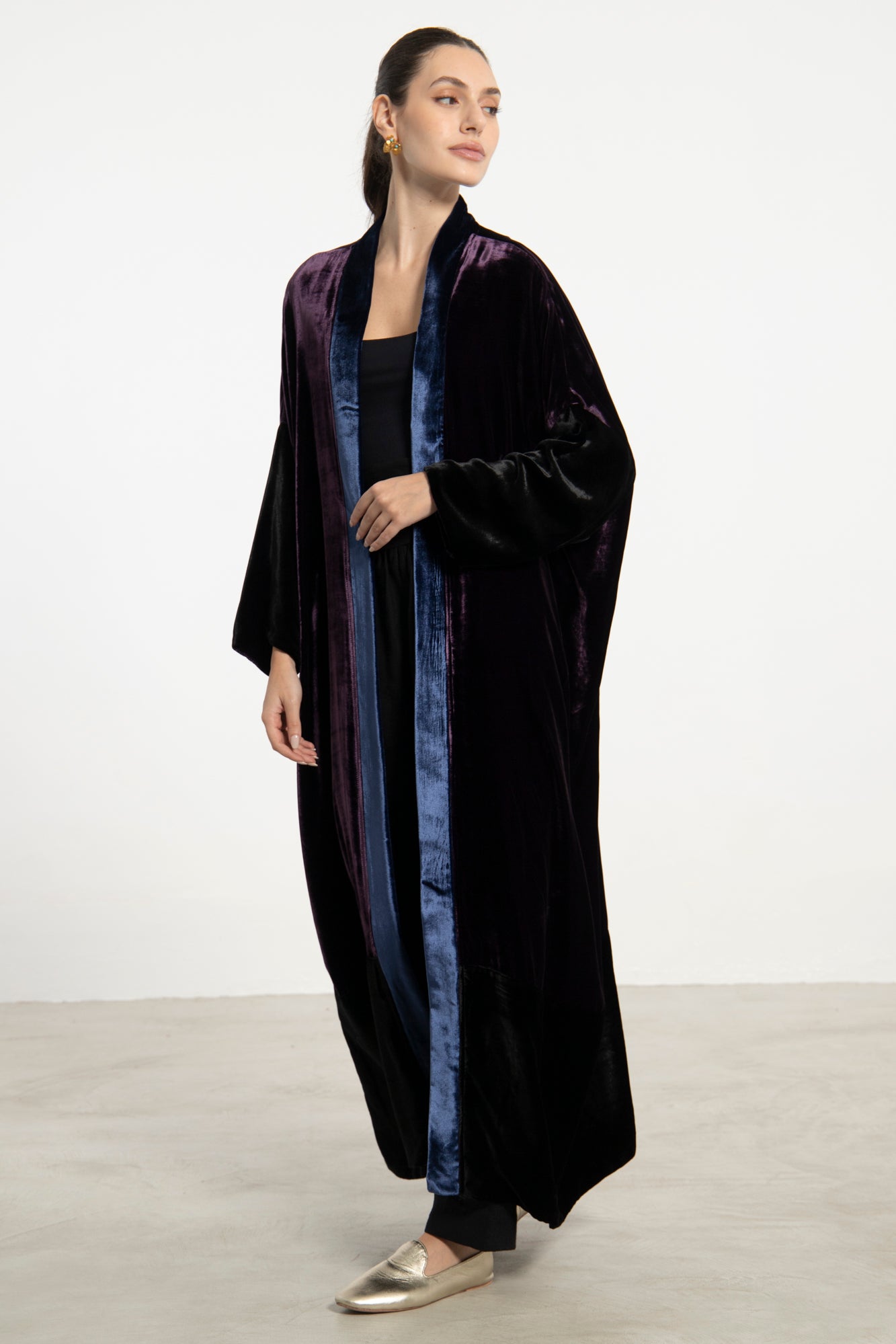 Details: Open abaya with wide sleeves and color-blocked velvet panels in black, blue, and purple