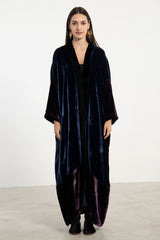 The Sherif Abaya is a voluminous silhouette crafted from plush velvet in a rich tri-tone palette of black, deep blue, and aubergine purple. With fluid drape and tonal contrast, this free-size piece brings depth and elegance to any layered look.