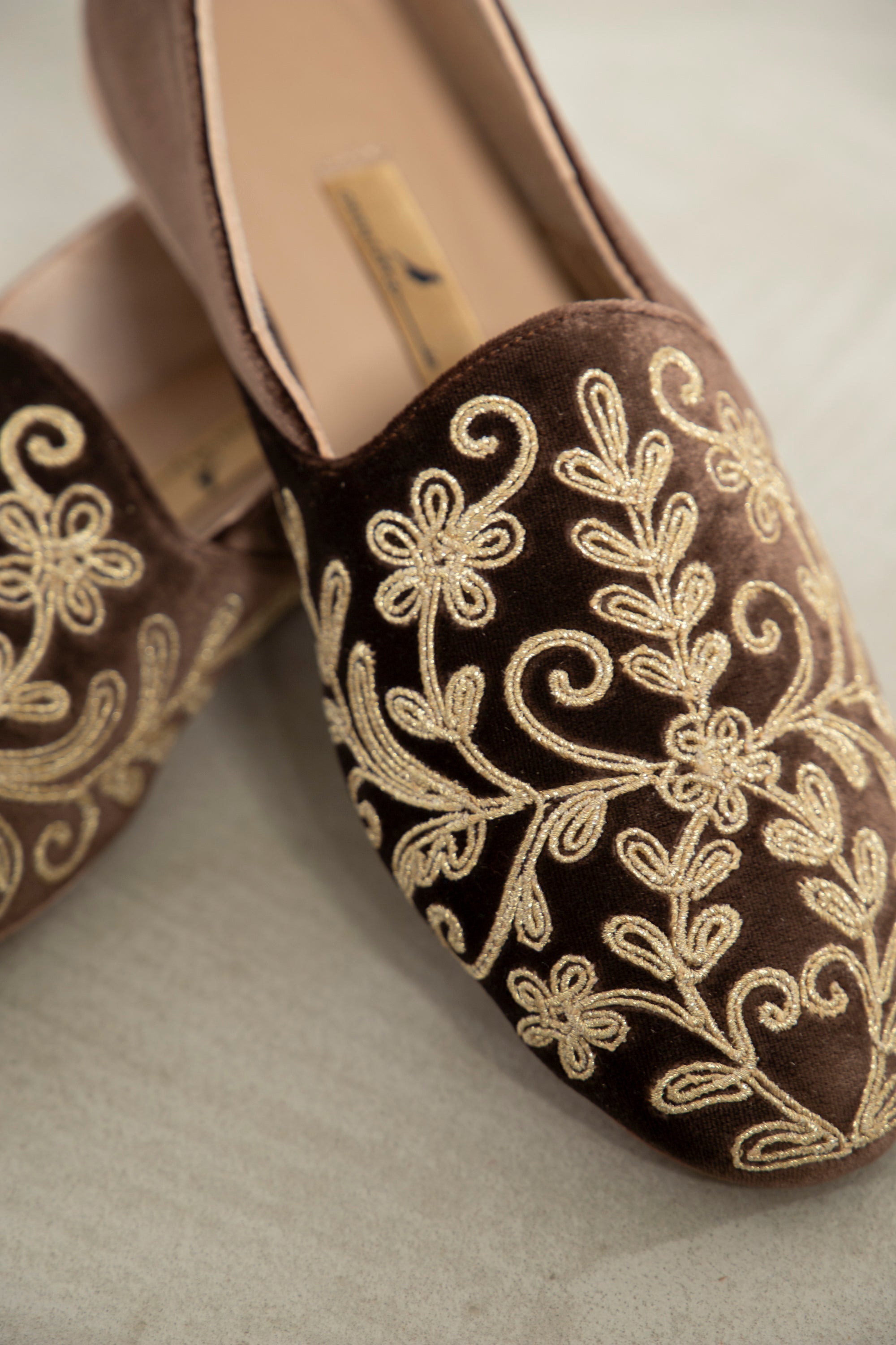 Details: velvet babouches with embroidery, leather interior and sole