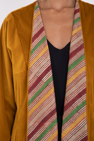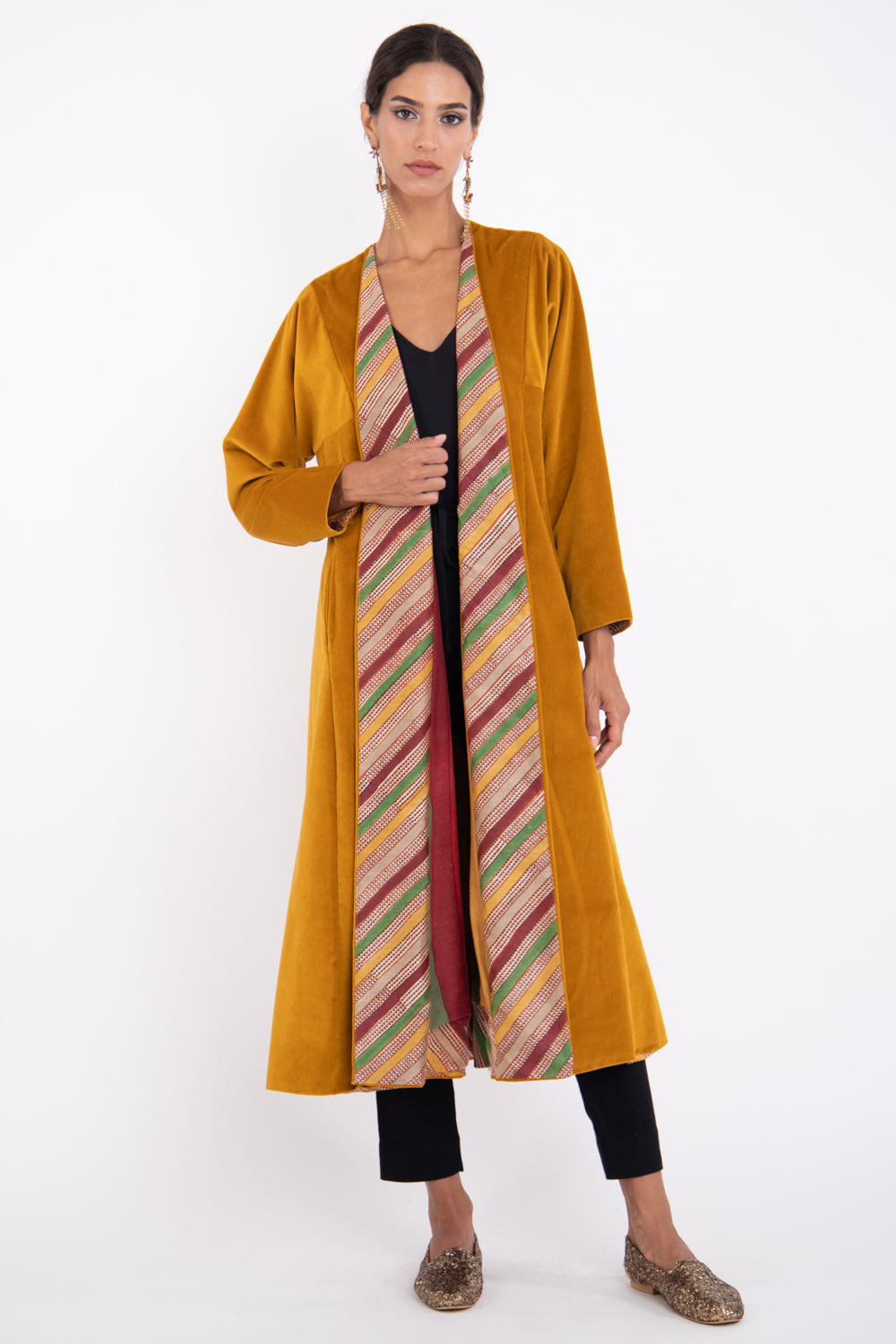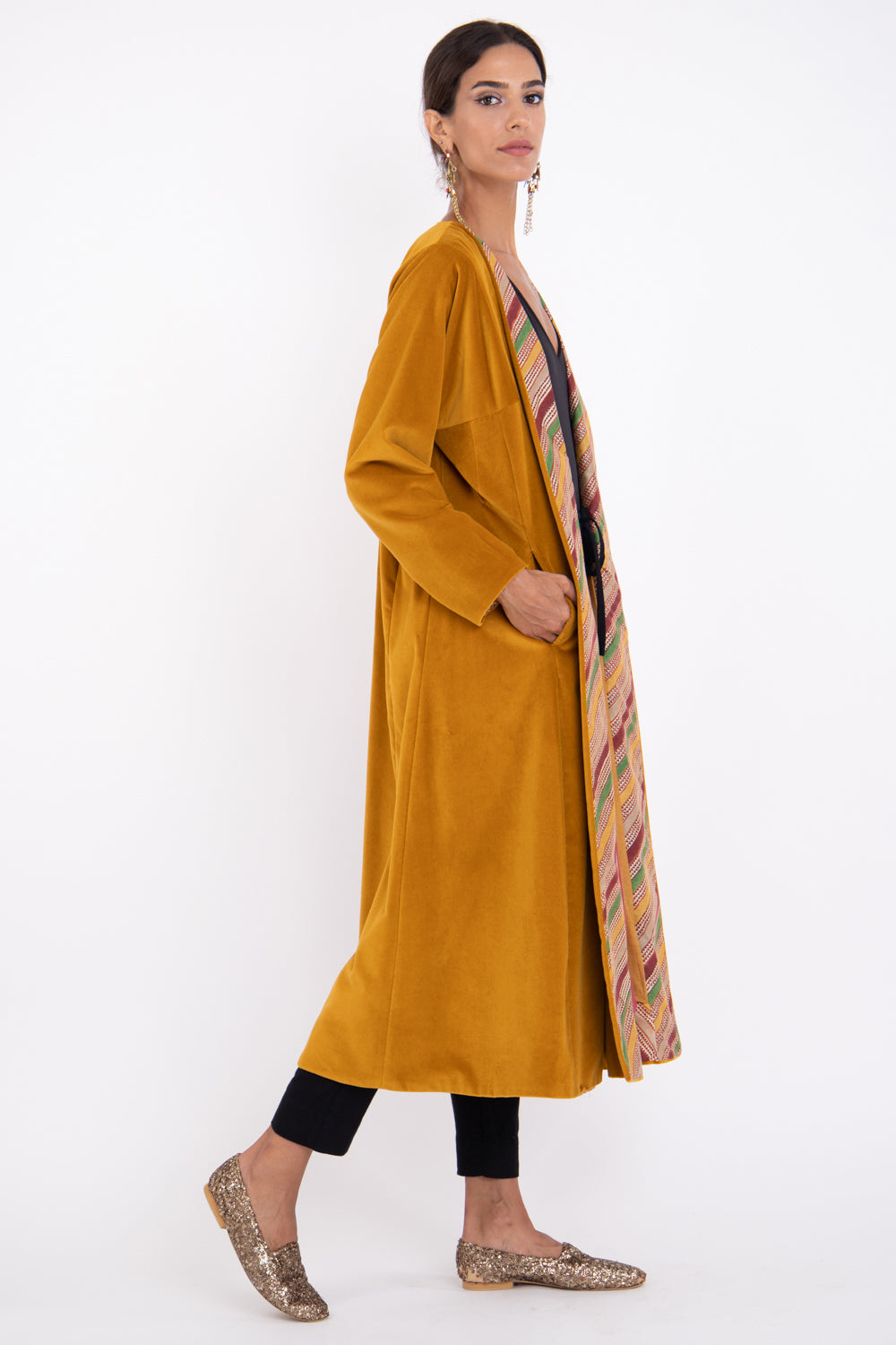 This coat is crafted from pure velvet in a mustard yellow hue with a cotton lining. It features pockets and an open style that can be combined with your favorite outfit. It's an effortlessly stylish piece that will make you stand out in any crowd while keeping you warm and chic.