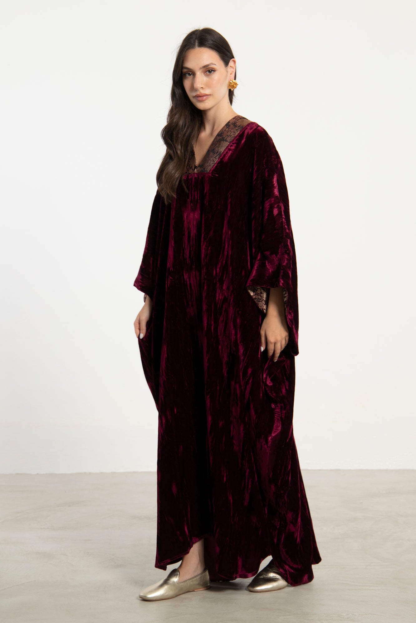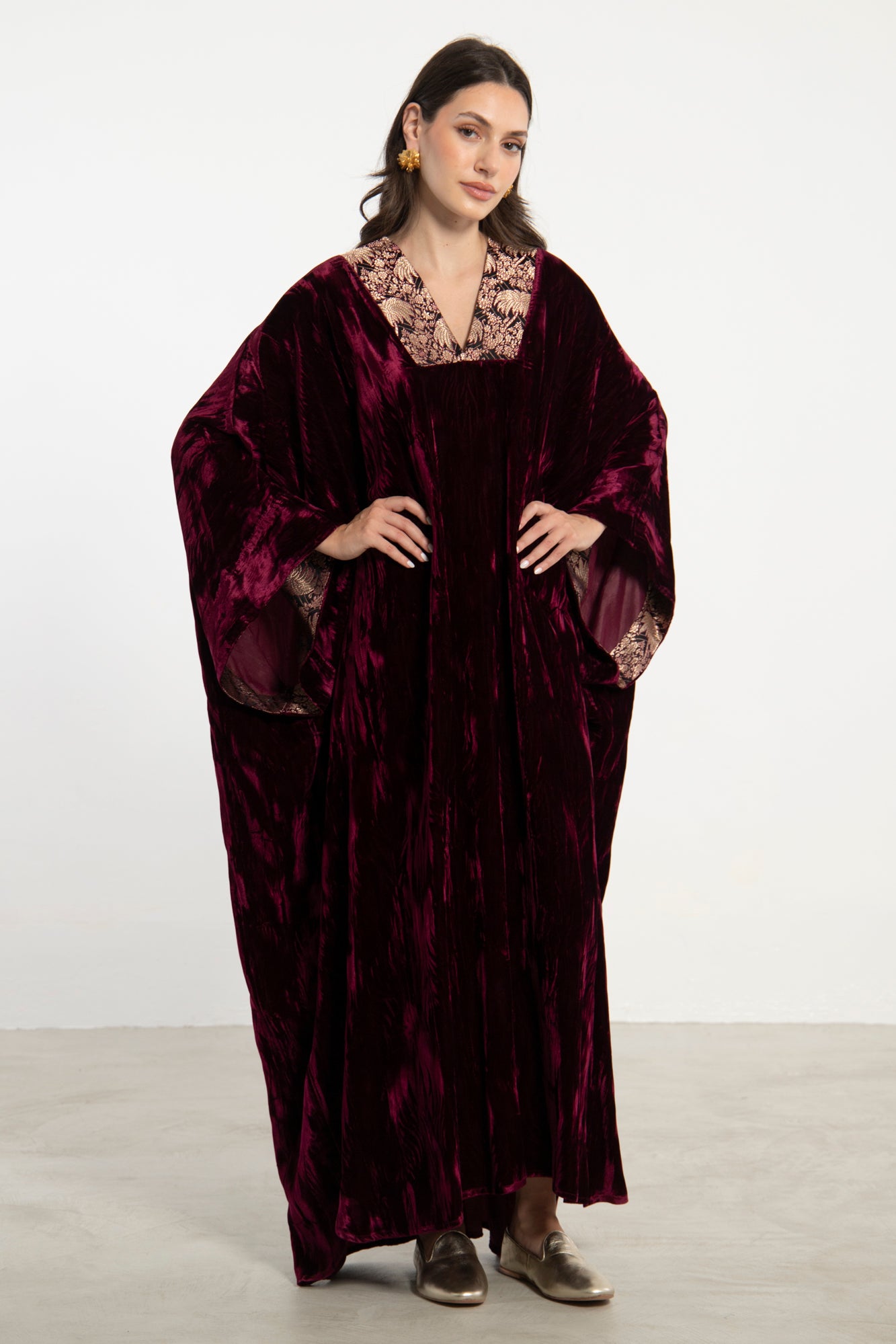 Details: Floor-length kaftan with wide sleeves, V-neckline, and silk brocade trims