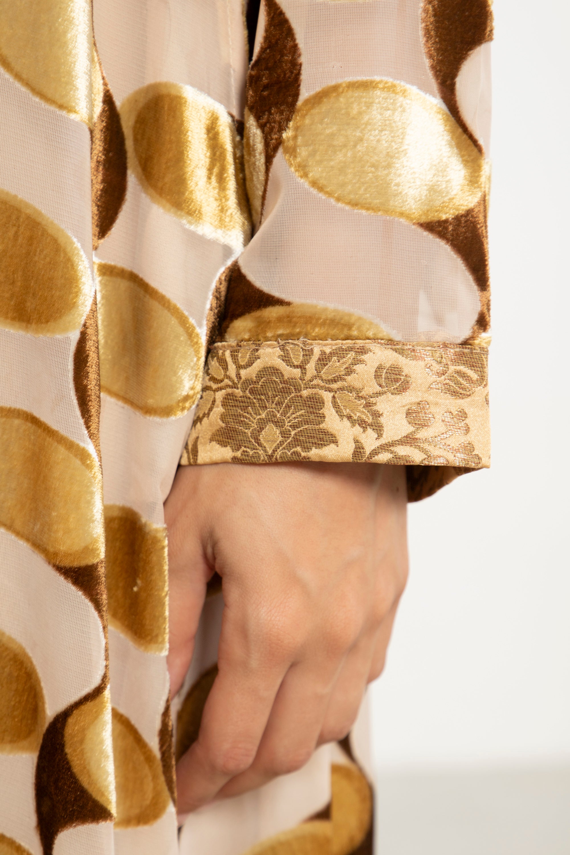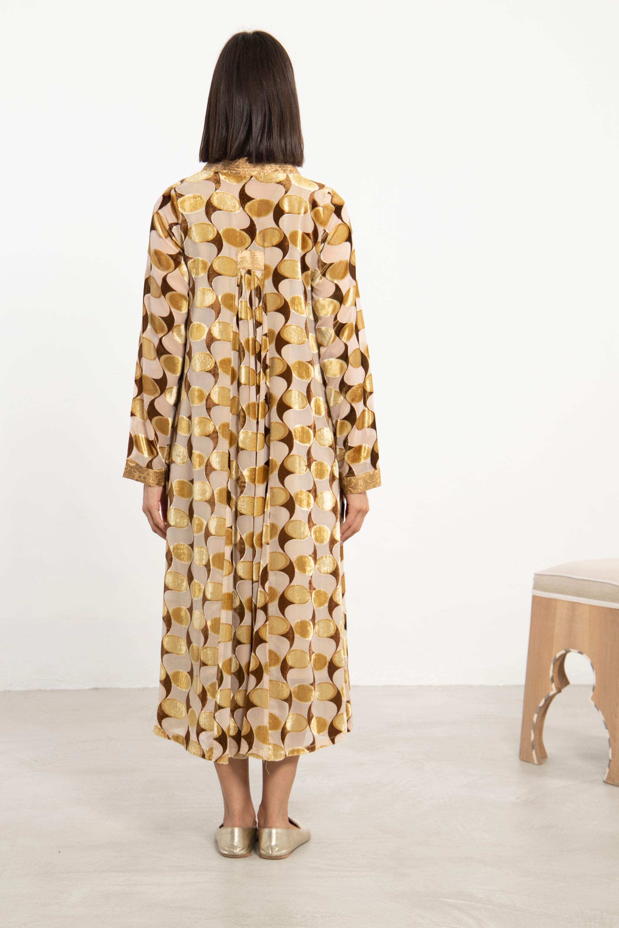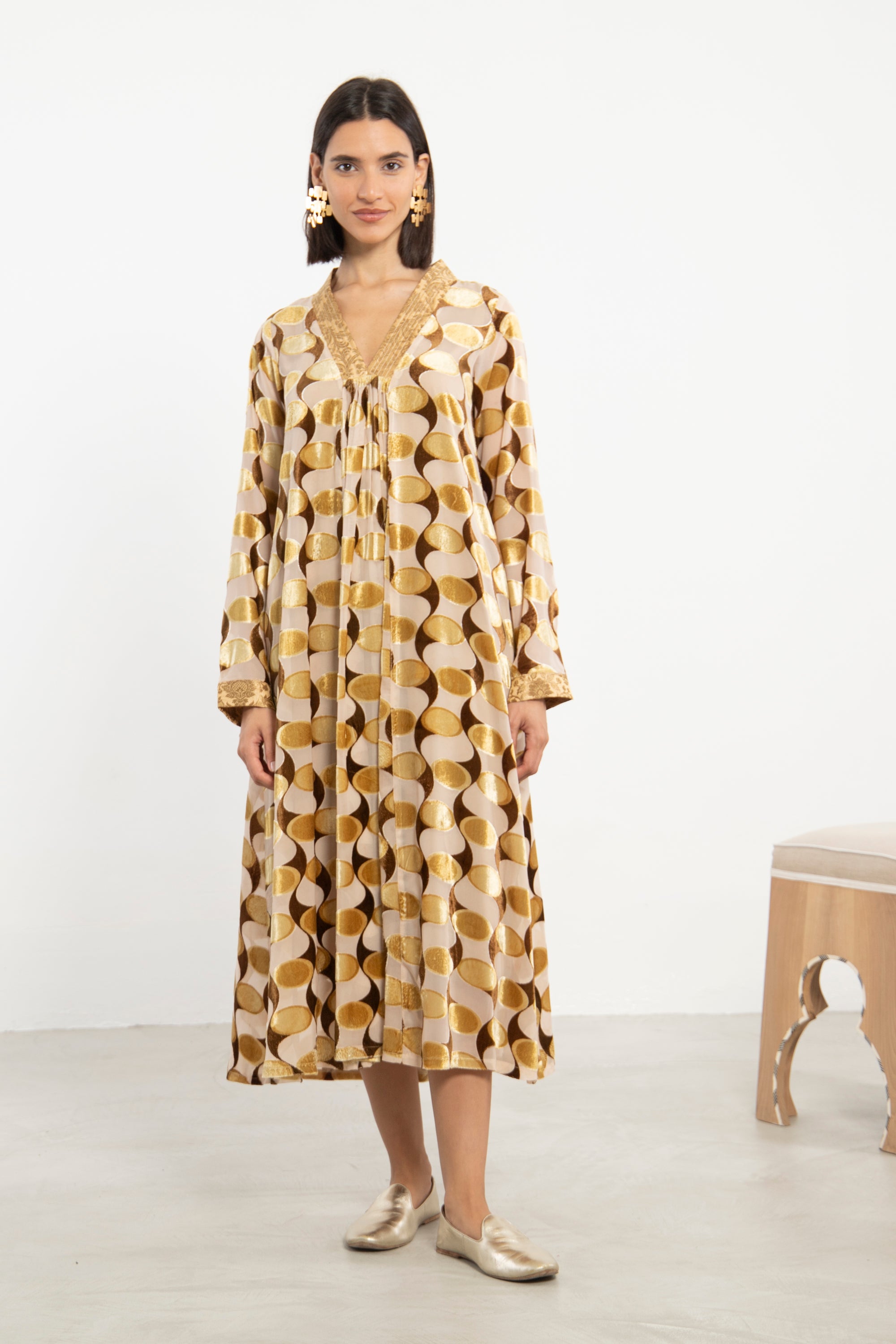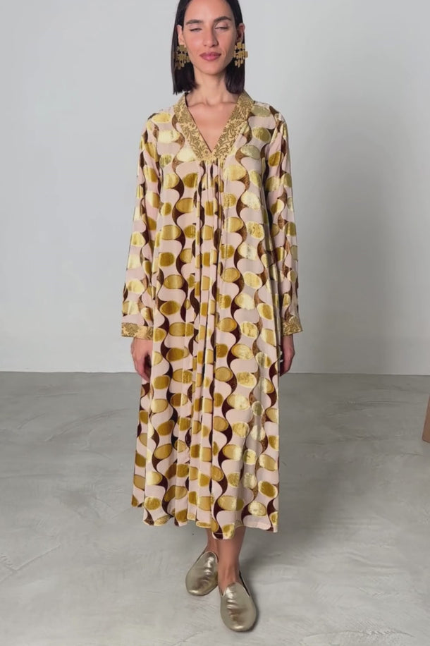 A timeless silhouette with a luminous gold print, the Jamila dress in velvet devoré is both elegant and effortlessly refined. Featuring a soft V neckline, gathered front pleats, and wide sleeves, it moves with grace and fluidity.