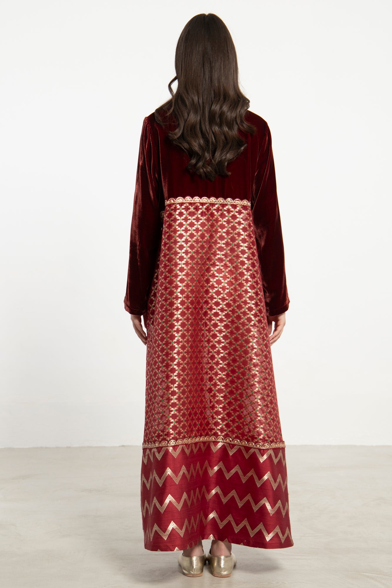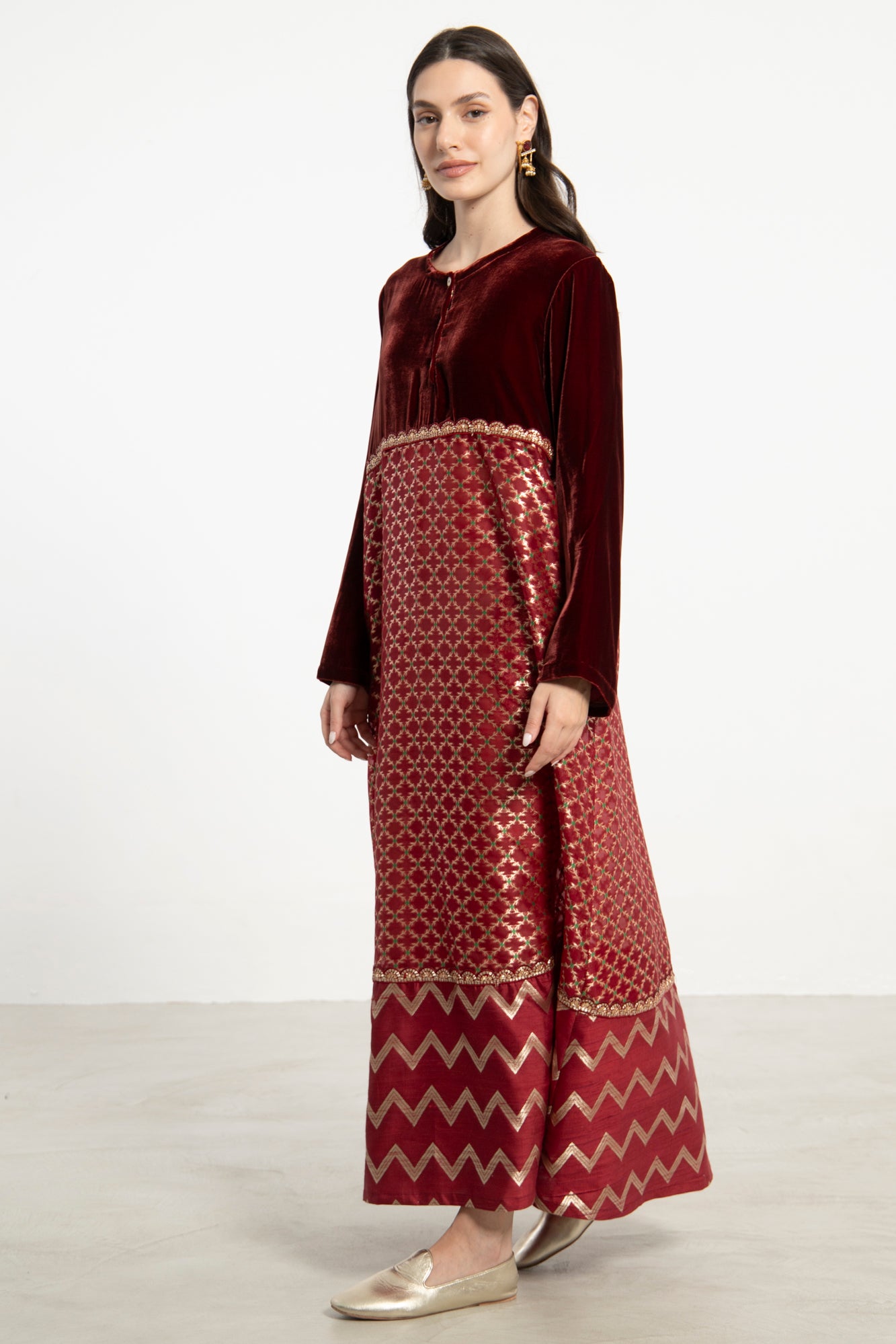 The Layalina Dress blends rich velvet with intricately woven silk brocade and silk organza, creating a striking interplay of texture and sheen. Featuring geometric and zigzag patterns in gold, this design offers bold elegance in a relaxed silhouette.
