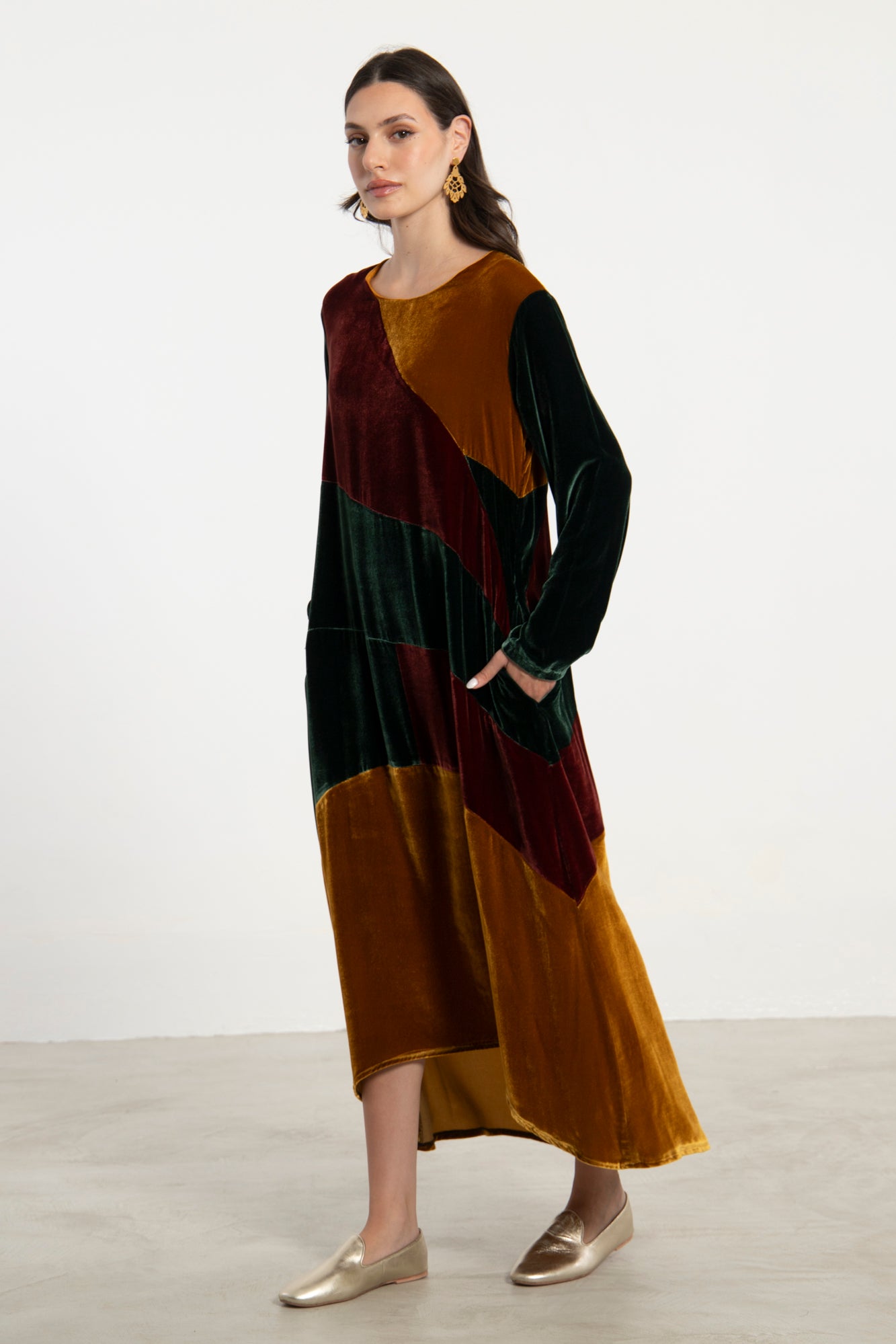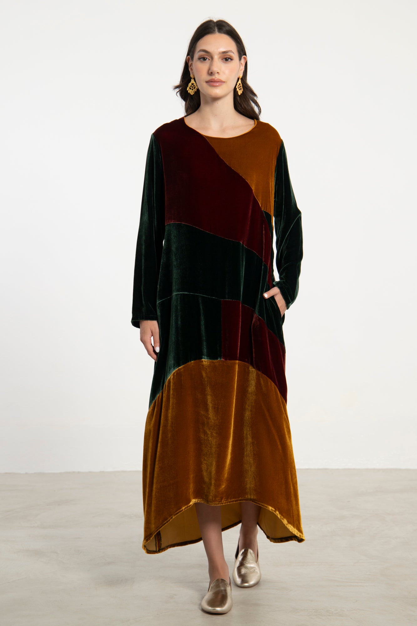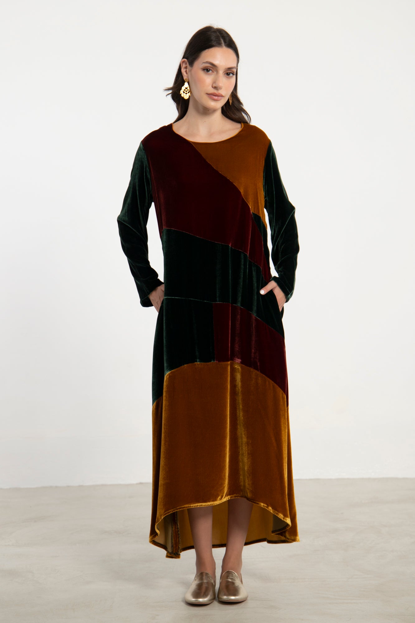 The Lyana Dress is crafted from rich velvet in bold patchwork panels of green, burgundy, and amber. With its long sleeves, round neckline, and flowing hemline, this piece brings together comfort and striking color contrasts for a refined, modern silhouette.