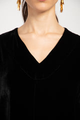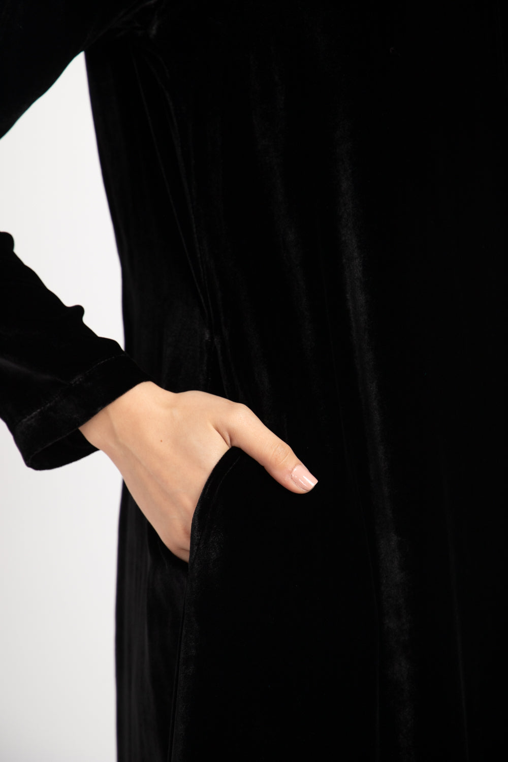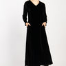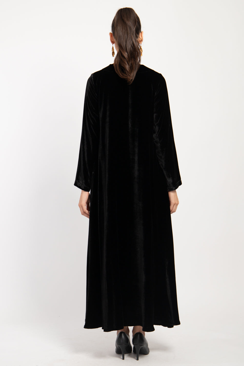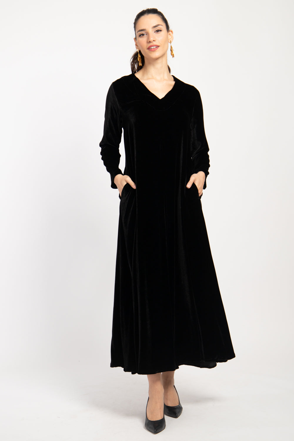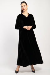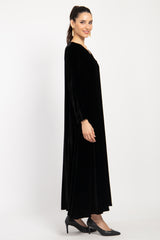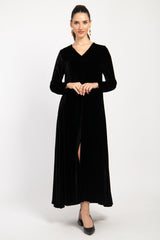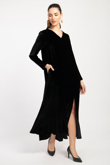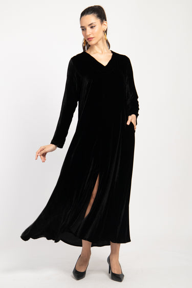 This dress is an elegant black maxi dress crafted from luxurious velvet fabric, offering a soft and rich texture. It features a flattering V-neckline and long sleeves, providing a sophisticated and modest look. The design includes a subtle front slit, adding a touch of allure and movement to the silhouette.