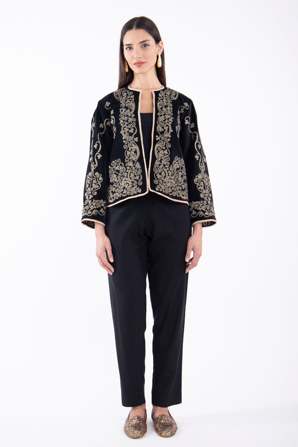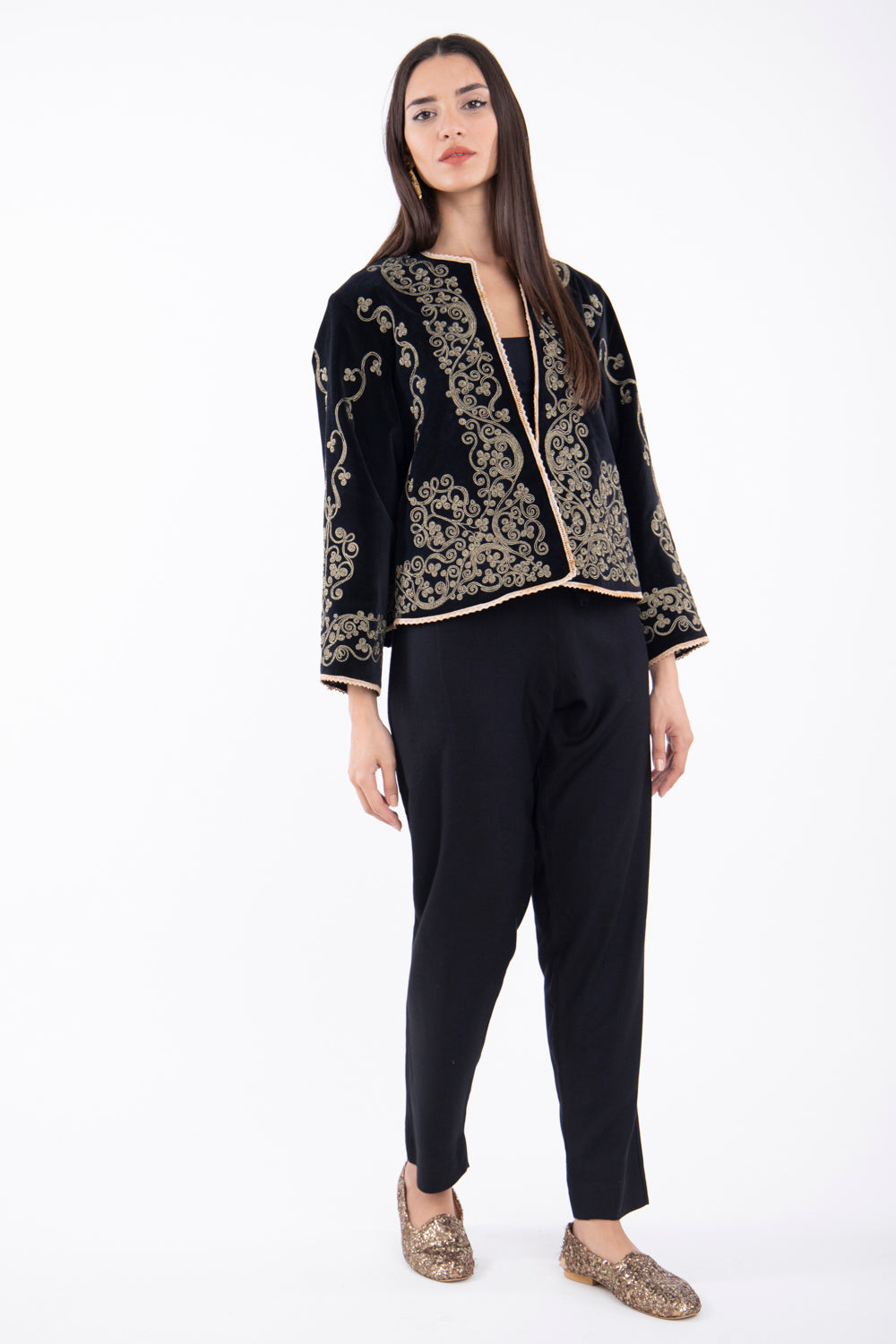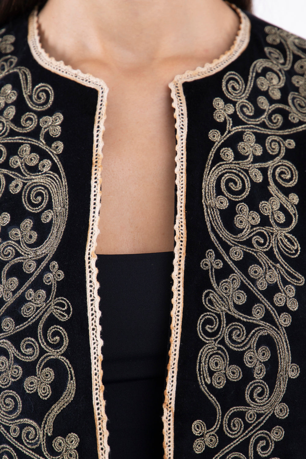 Crafted from luxurious velvet and featuring ottoman embroidery, this black jacket offers an elegantly sophisticated air. Hand-embroidered for an exquisite finish, its open style makes it the perfect chic addition to any wardrobe.