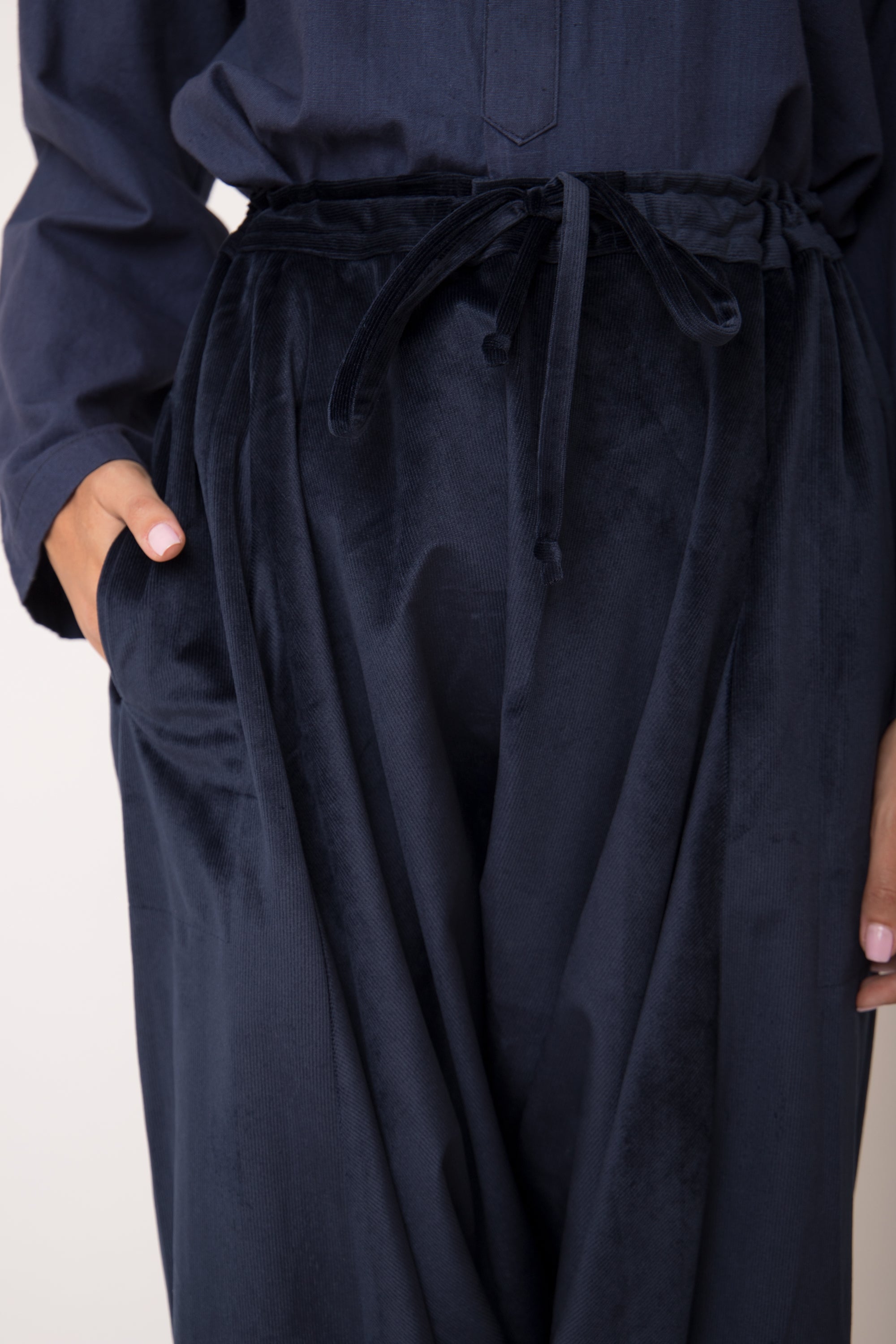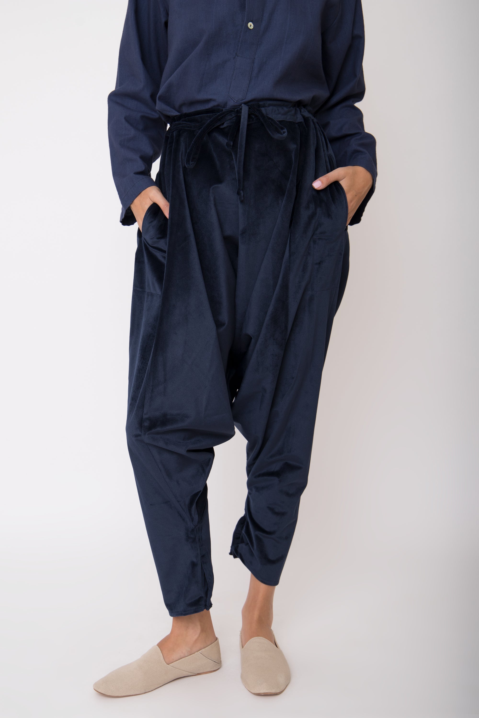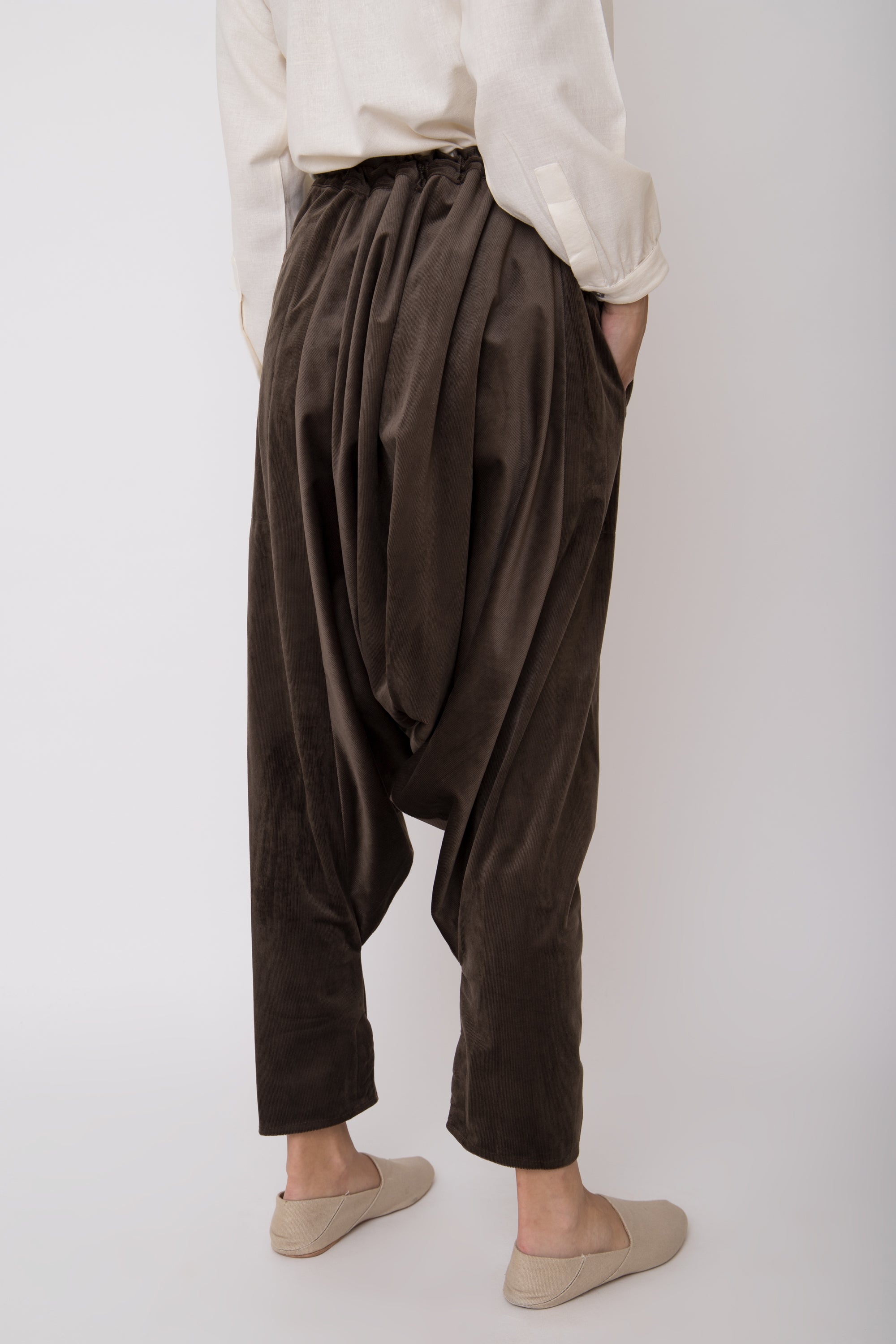 These dropped crotch pants are crafted from soft corduroy velvet, featuring a drawstring waistband and slit pockets for your small essential items.