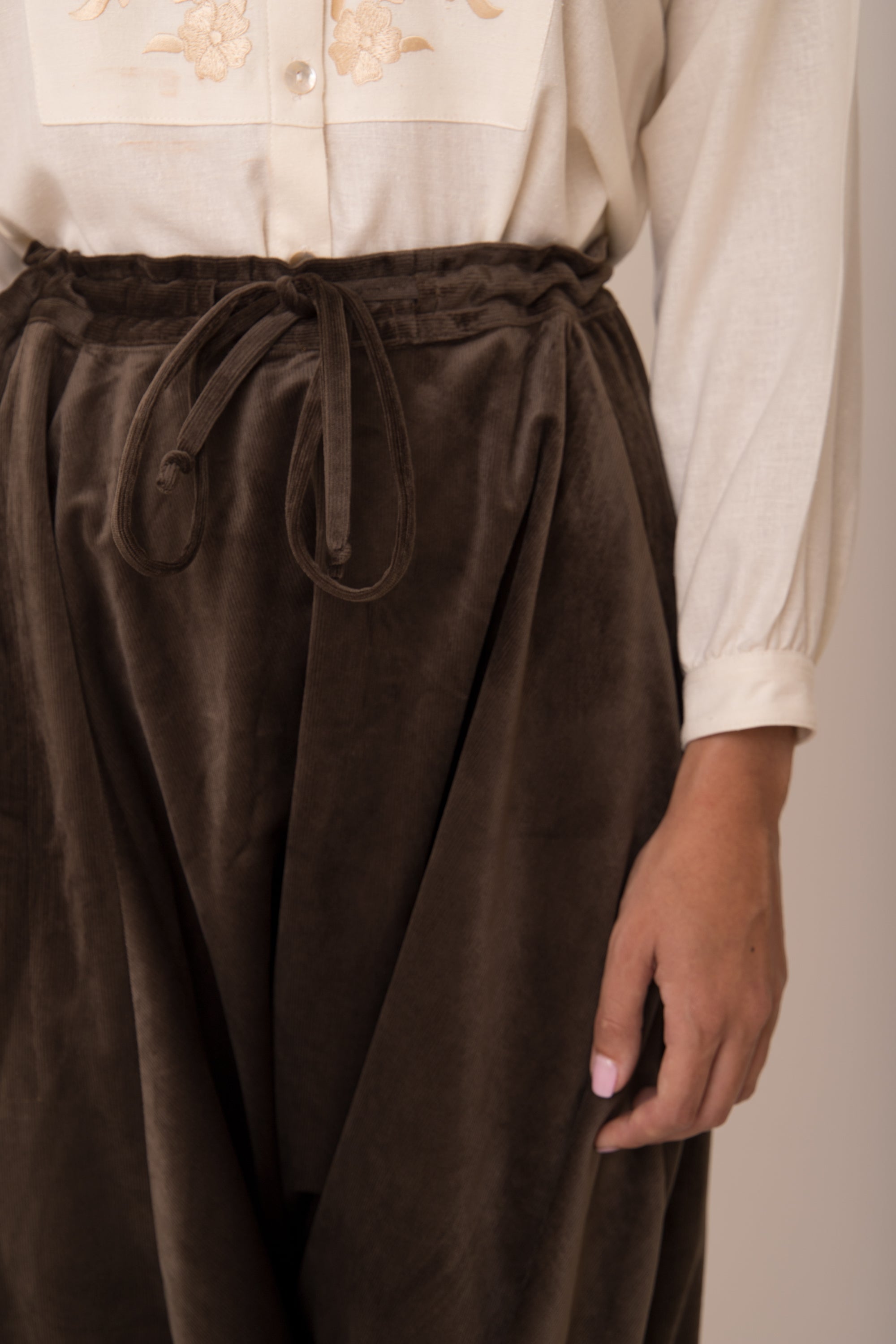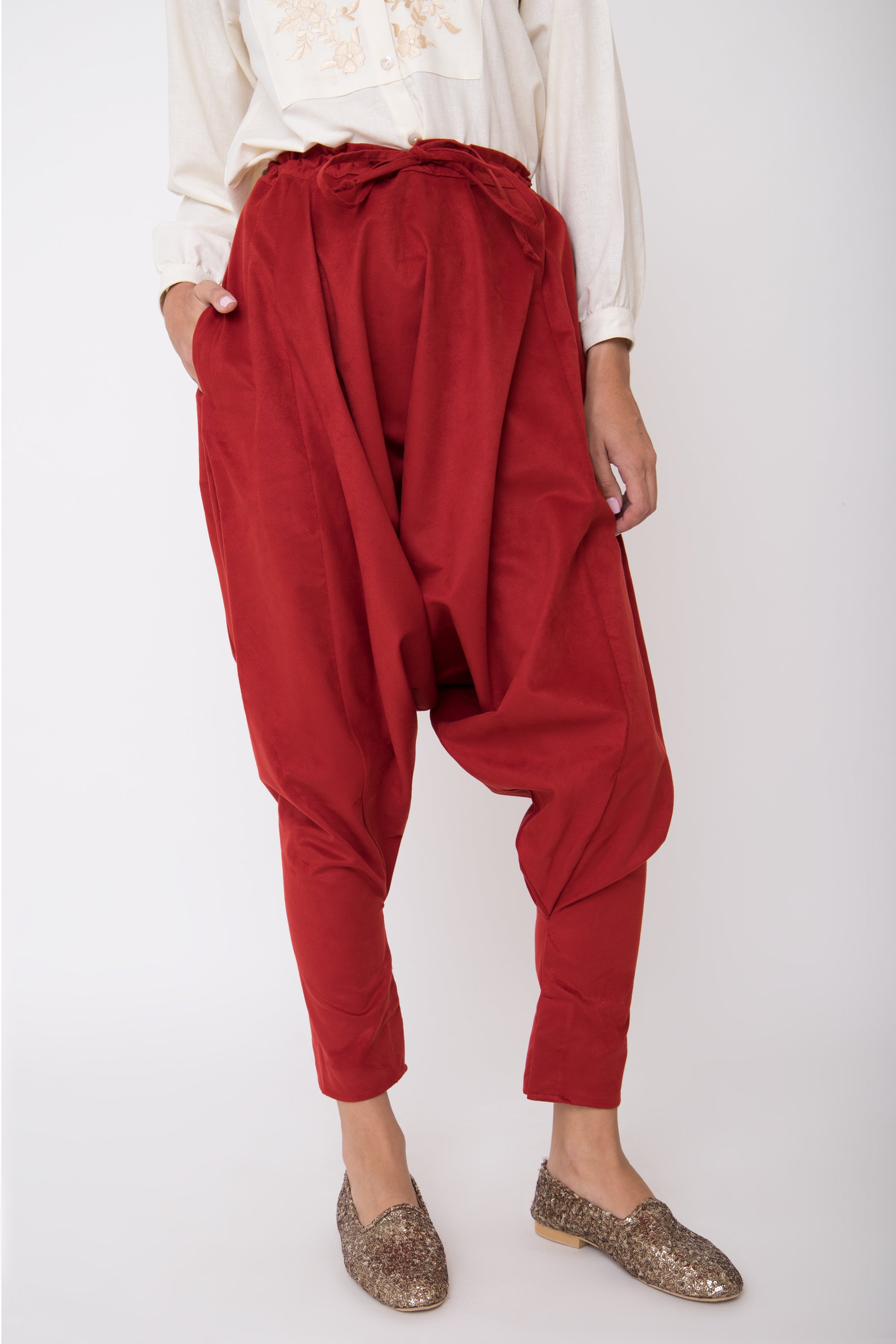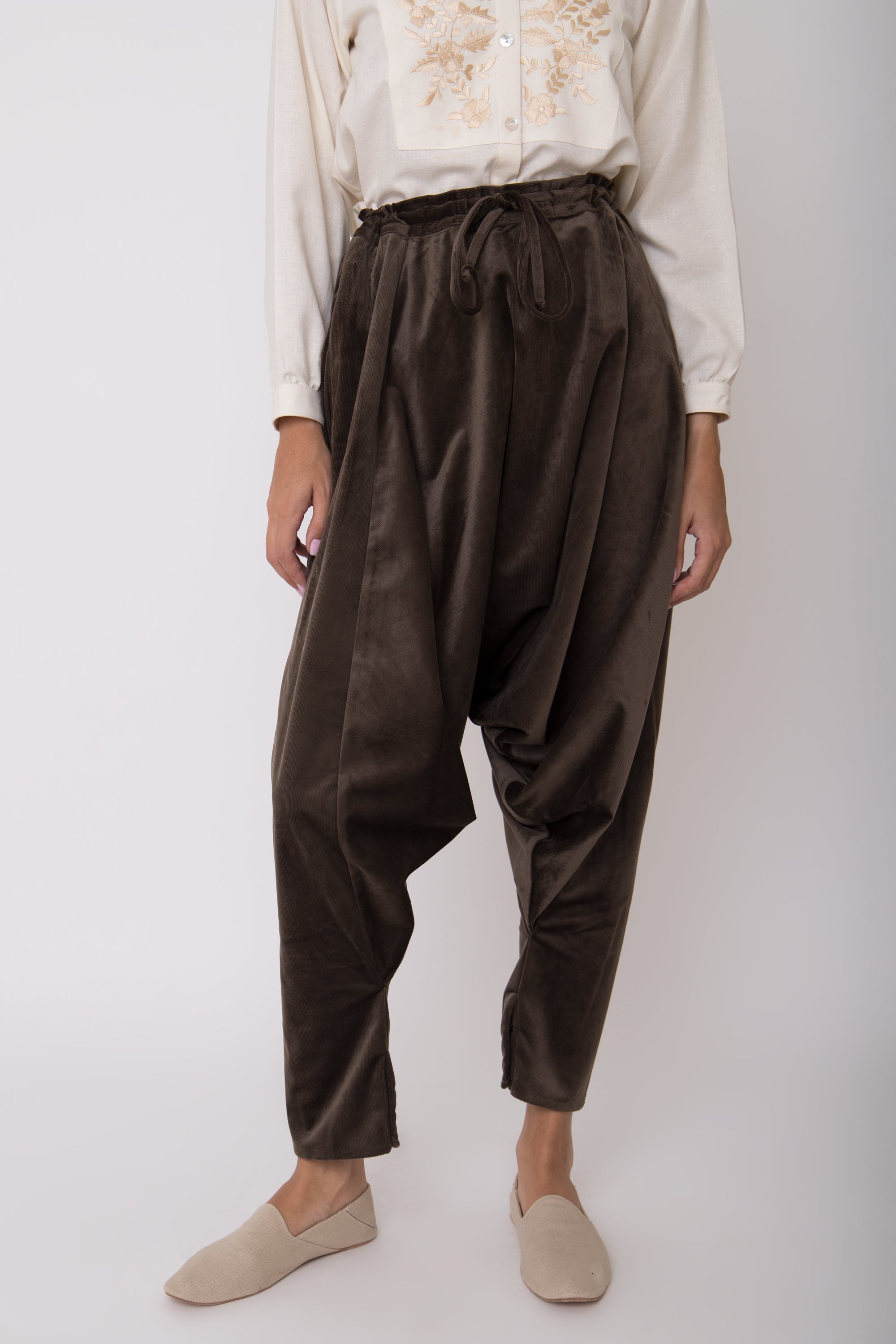 These dropped crotch pants are crafted from soft corduroy velvet, featuring a drawstring waistband and slit pockets for your small essential items.