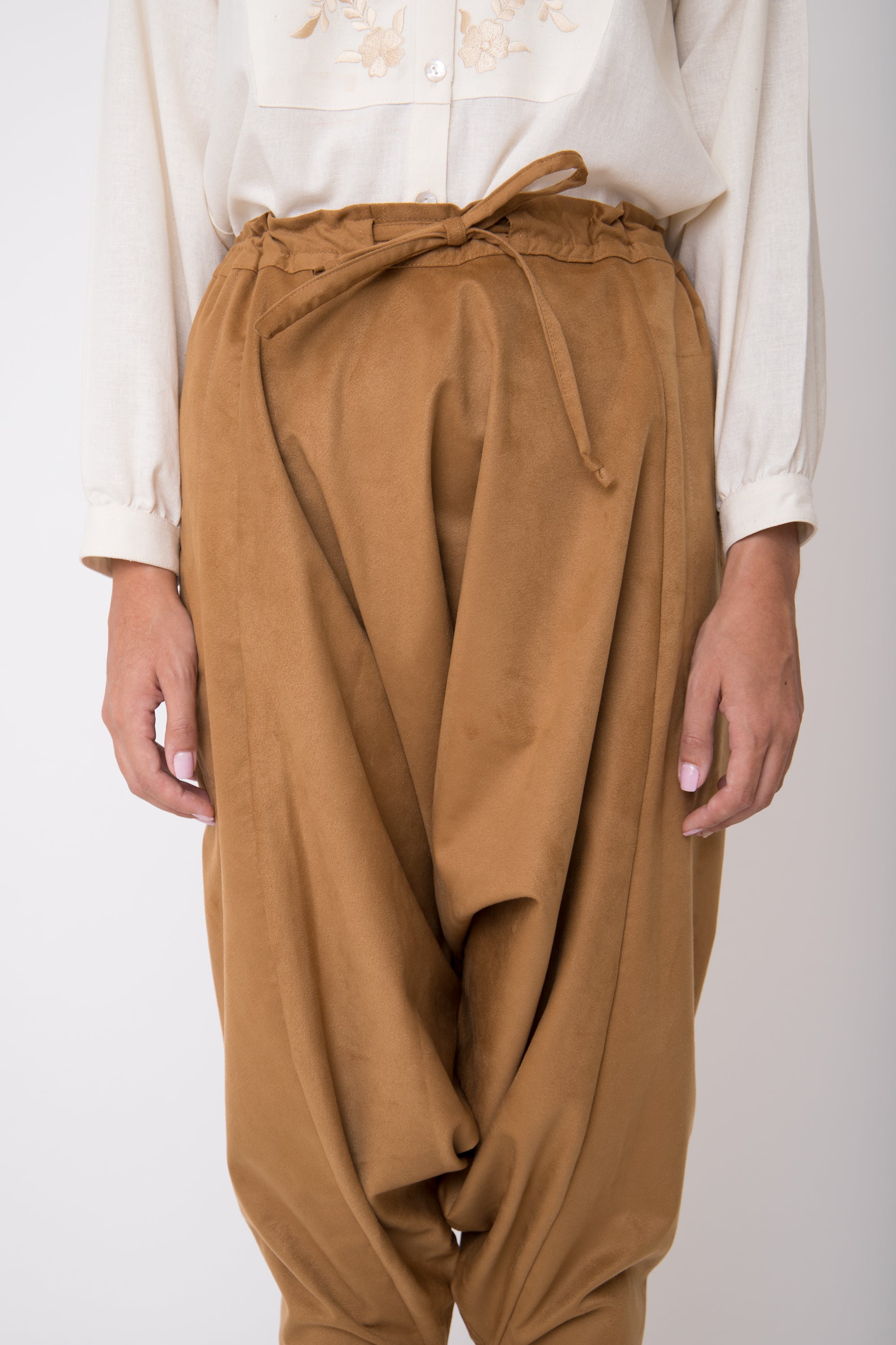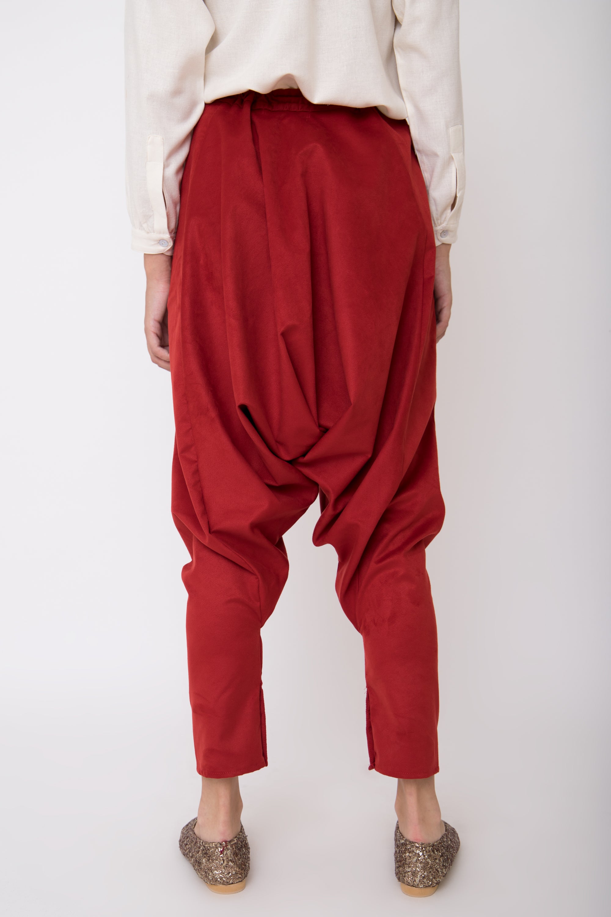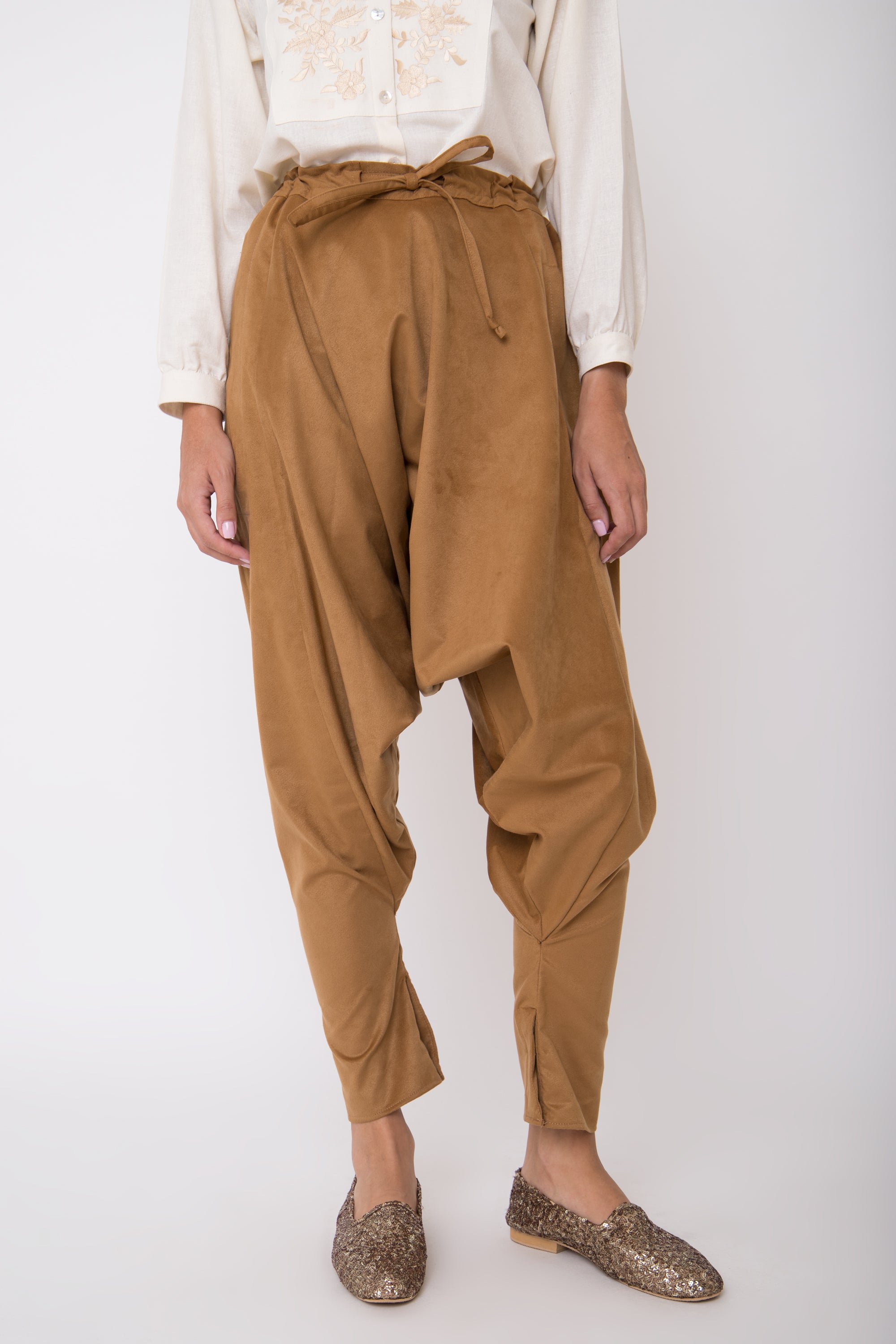 This style is gathered at the front and features concealed buttons on the ankles.