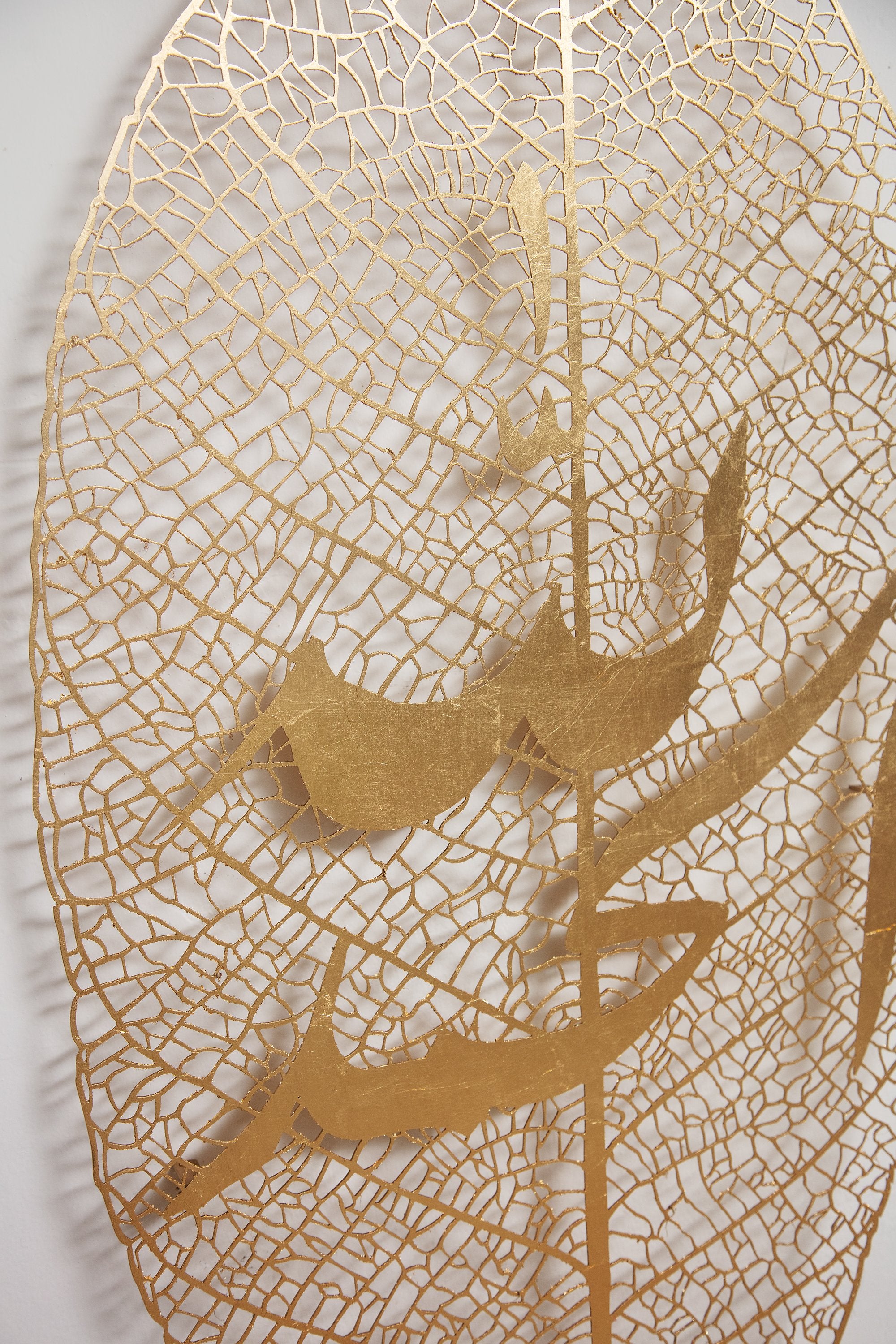 Oversized leaf designed in iron with fine foliage threads, covered with gold leaf. The calligraphy reads "AlHamdulilah". This elegant nature-inspired piece would fit perfectly in a hallway, setting the tone of your interior. It's all in the details.