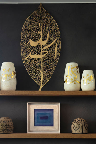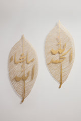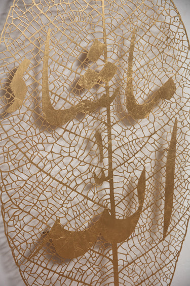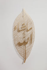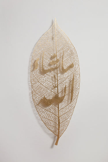Oversized leaf designed in iron with fine foliage threads, covered with gold leaf. The calligraphy reads "MashAllah". This elegant nature-inspired piece would fit perfectly in a hallway, setting the tone of your interior. It's all in the details.