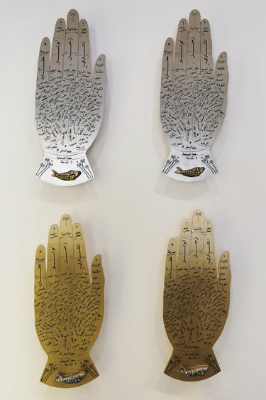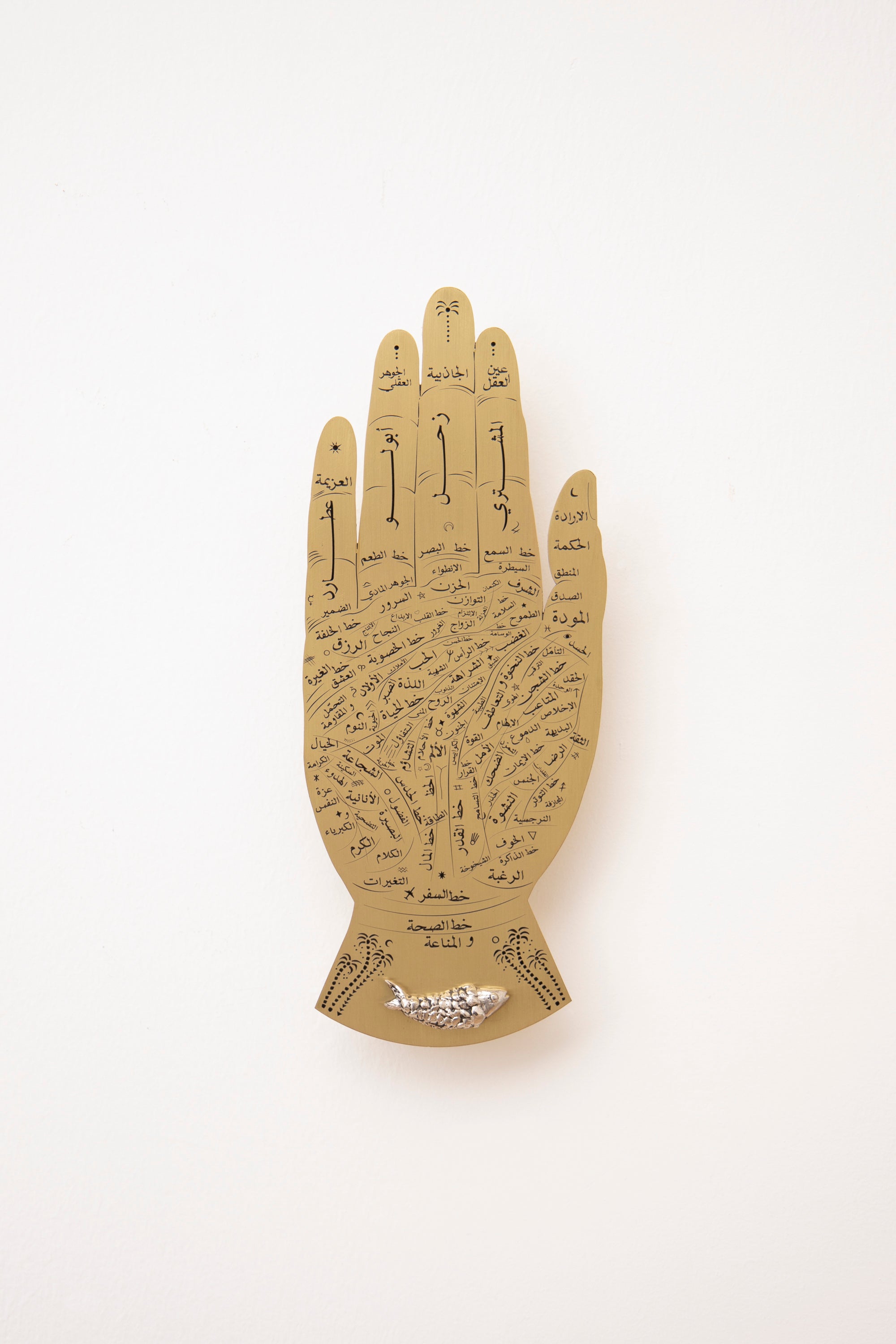 Available in gold and tinned brass, this intricately engraved hand palm holds the joys of foretelling the future along entangled lines, highly detailed descriptions, and a copper molded amulet in the shape of a fish. This palmistry art piece serves as a wall ornament as well as a guide for divinations.