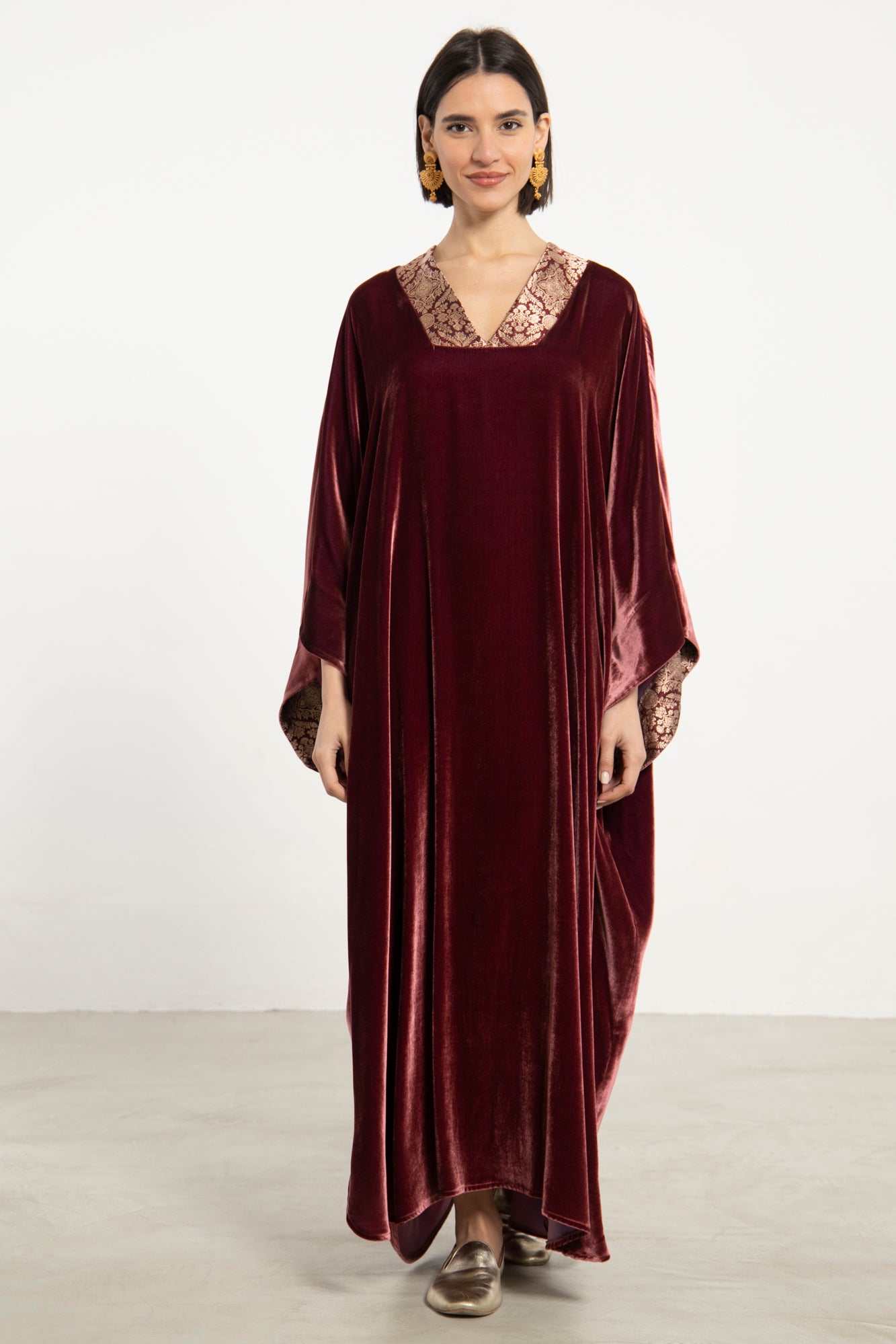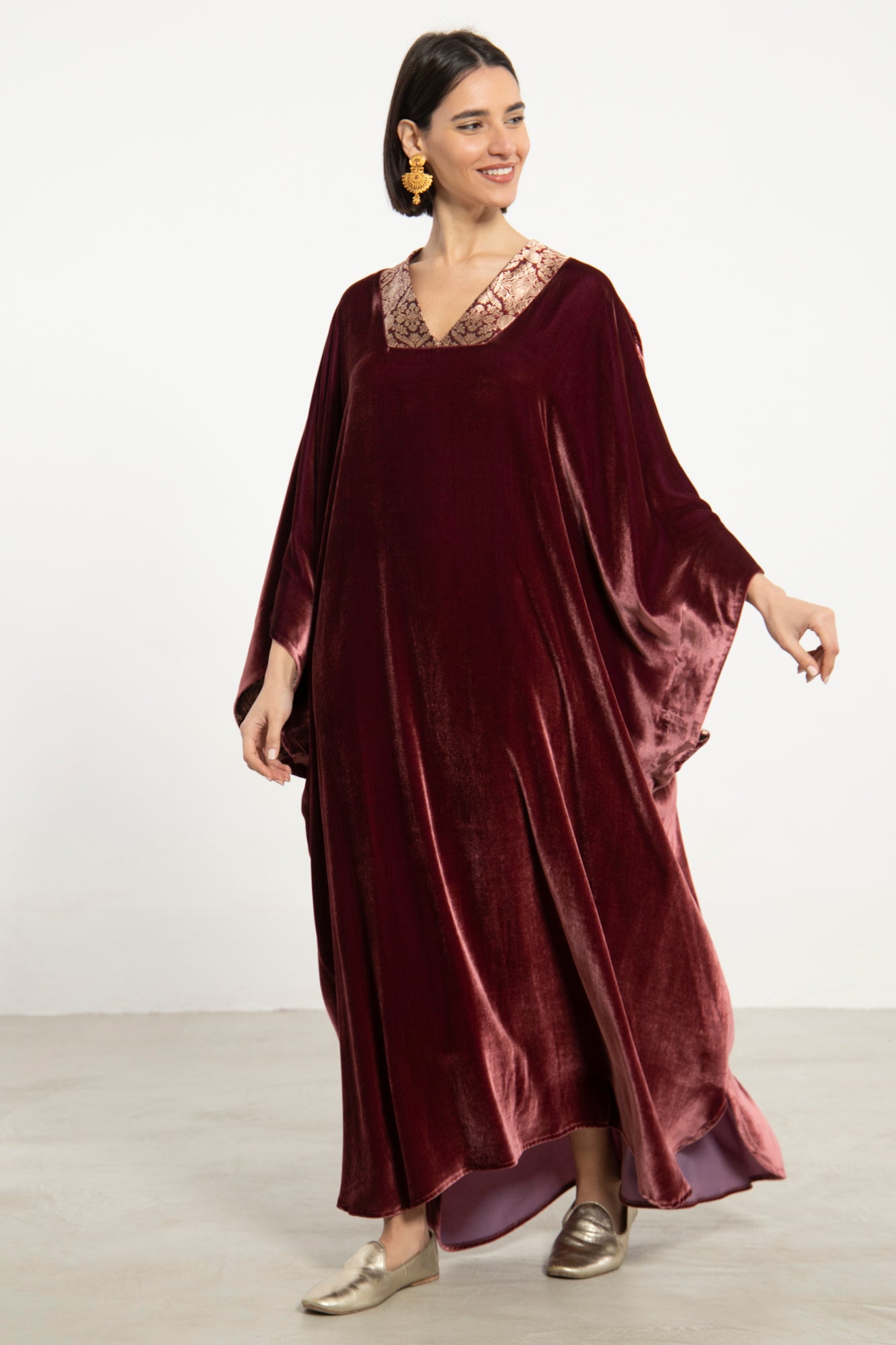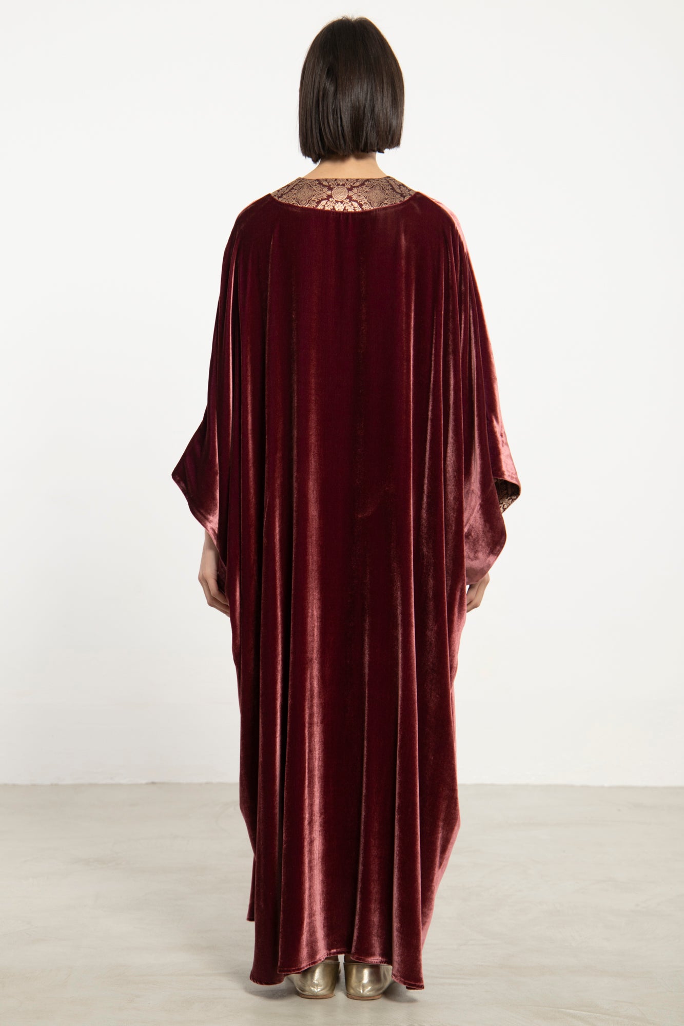 The Adan Kaftan features a deep burgundy silk velvet with a lustrous finish, elevated by silk brocade along the neckline and sleeves. Its fluid silhouette and rich texture offer effortless sophistication.