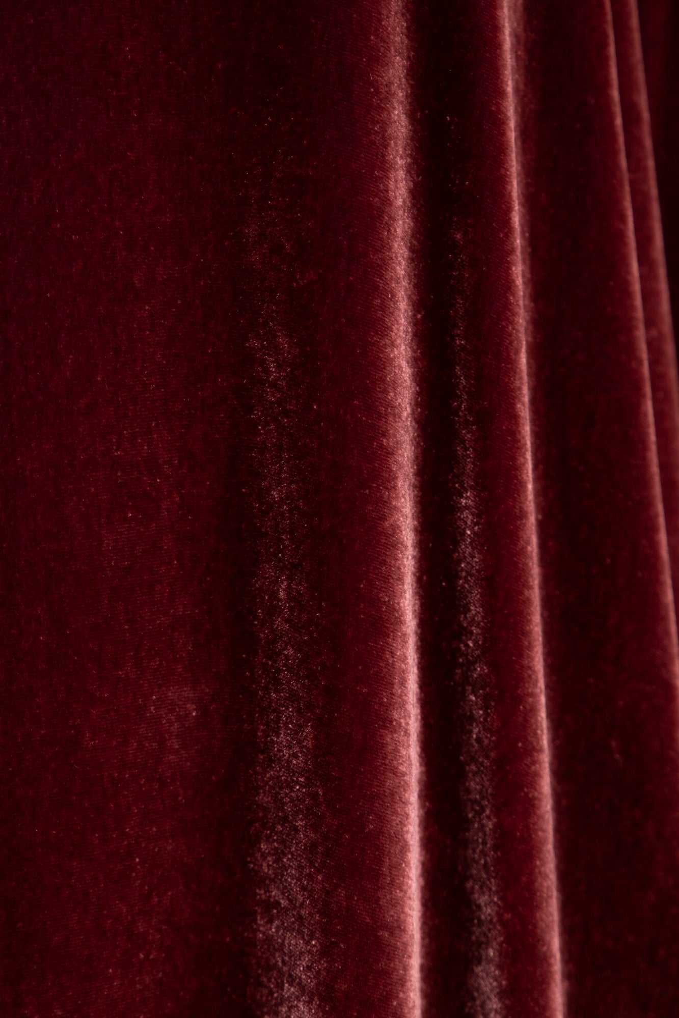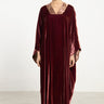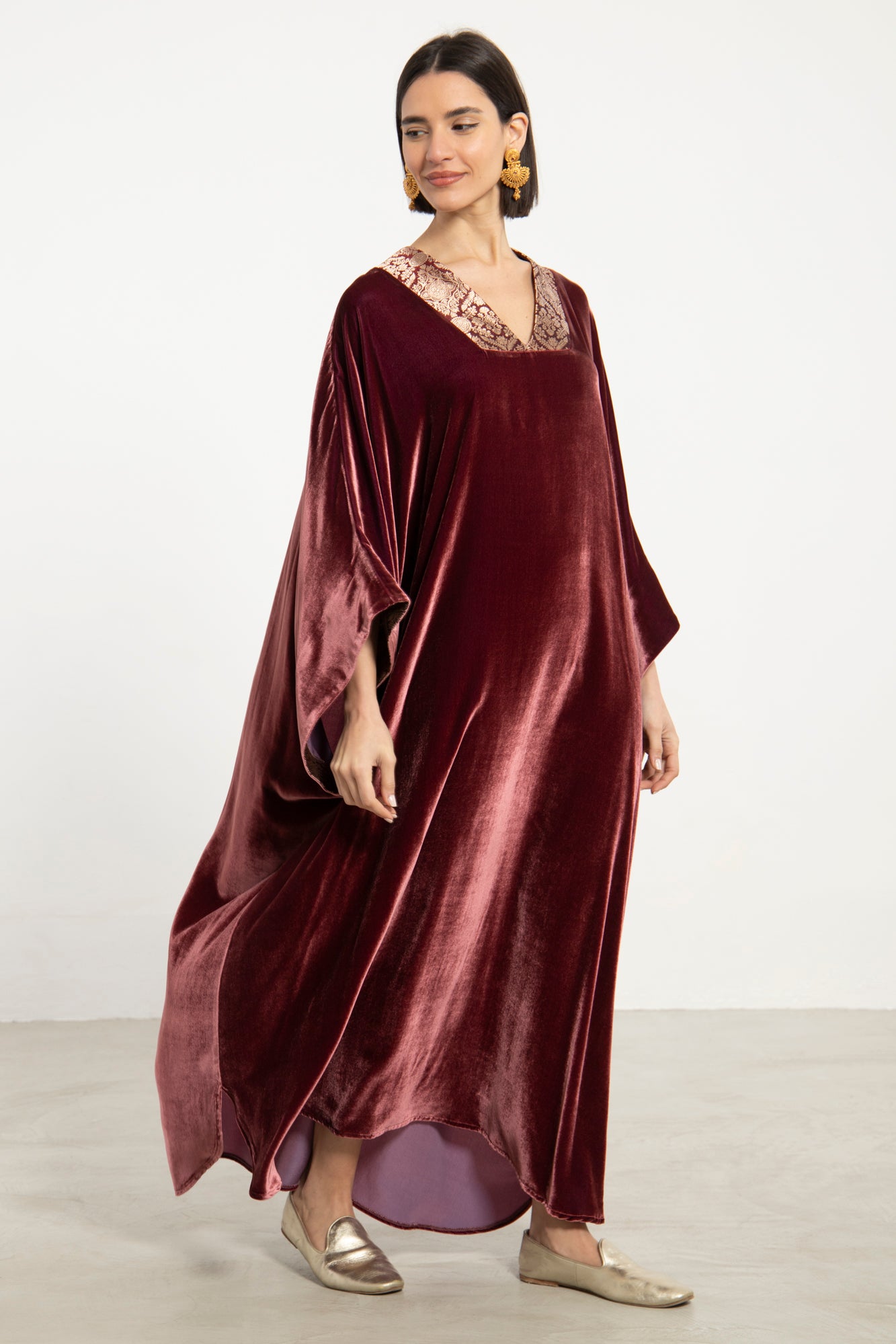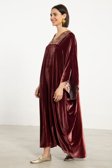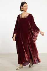The Adan Kaftan features a deep burgundy silk velvet with a lustrous finish, elevated by silk brocade along the neckline and sleeves. Its fluid silhouette and rich texture offer effortless sophistication.