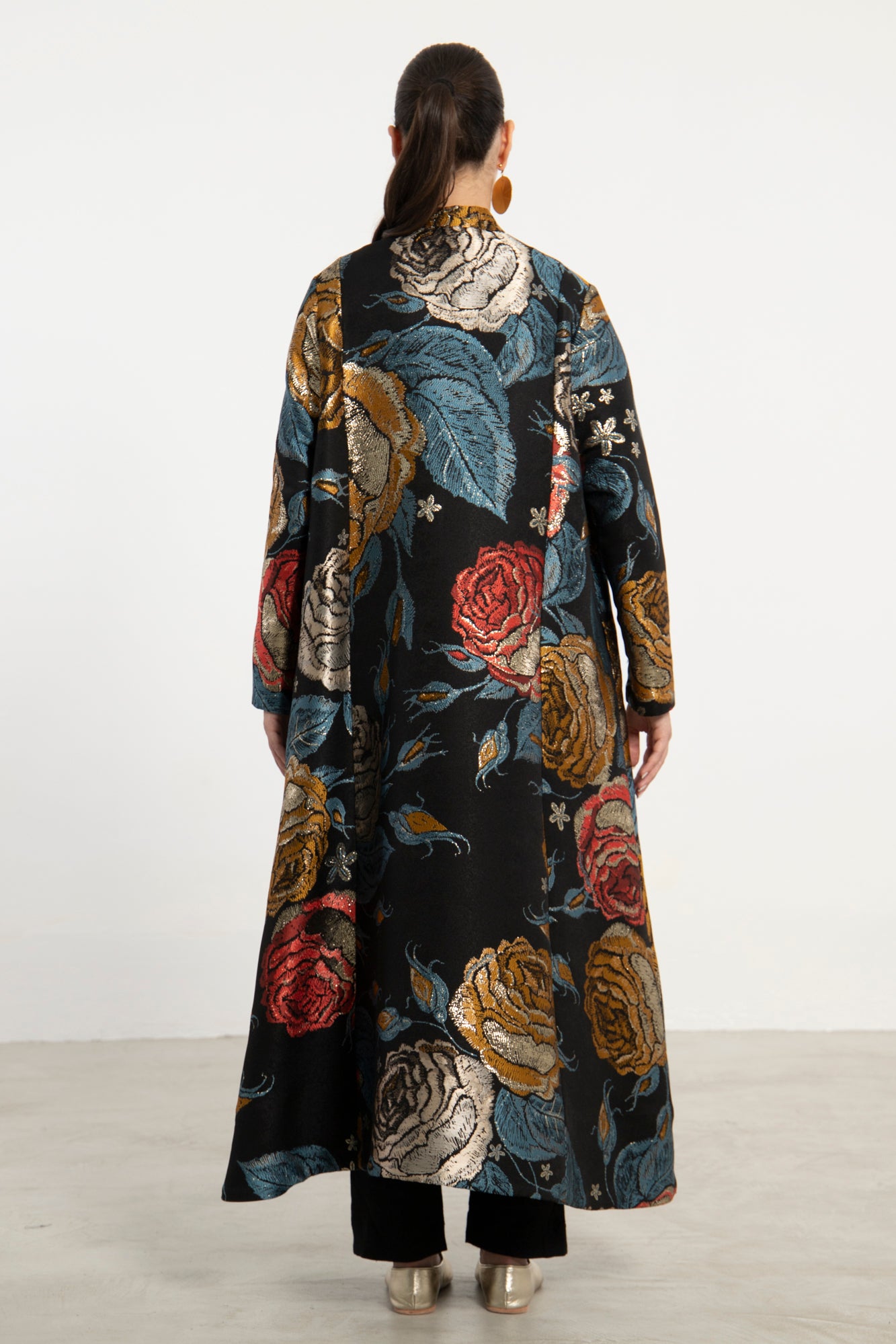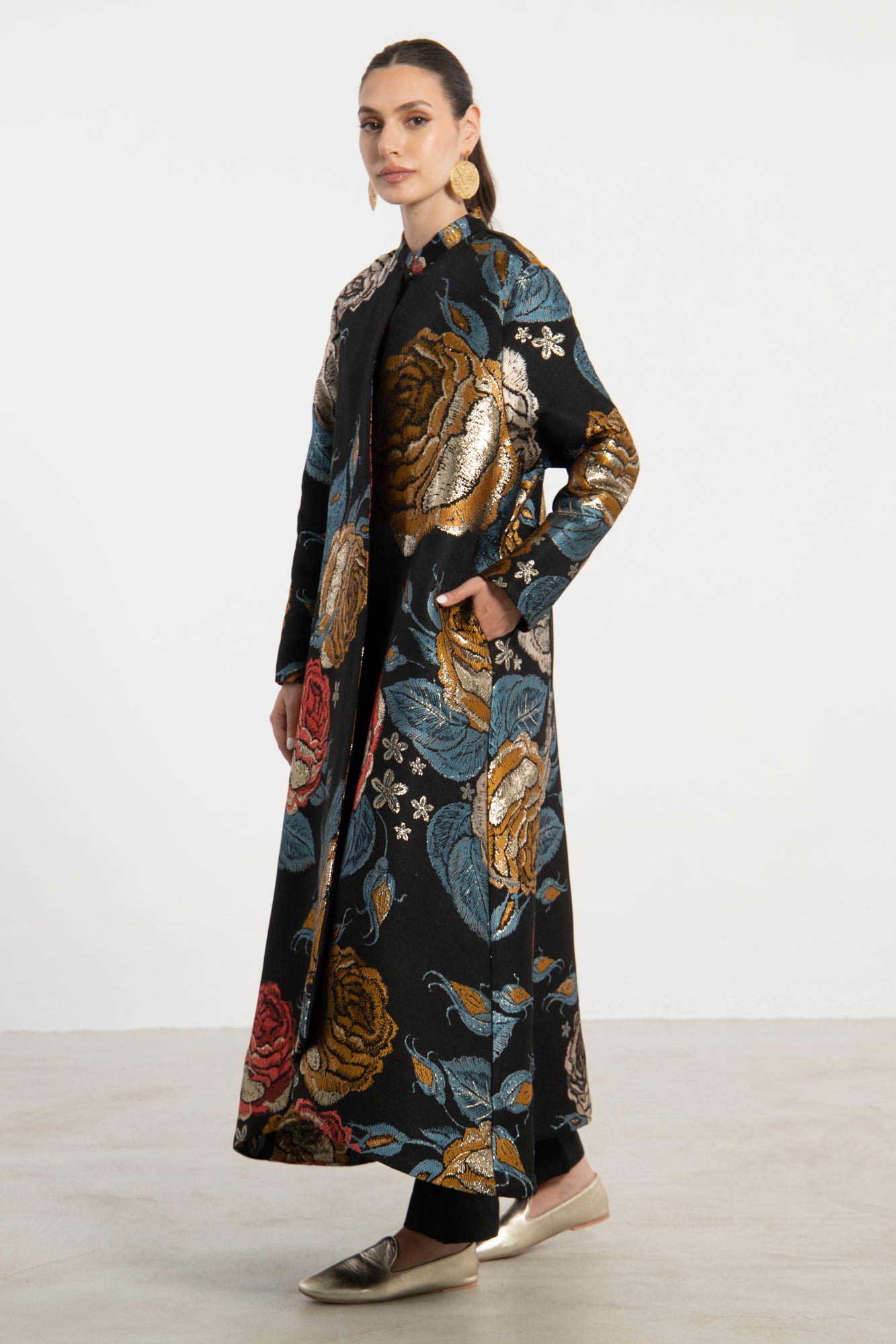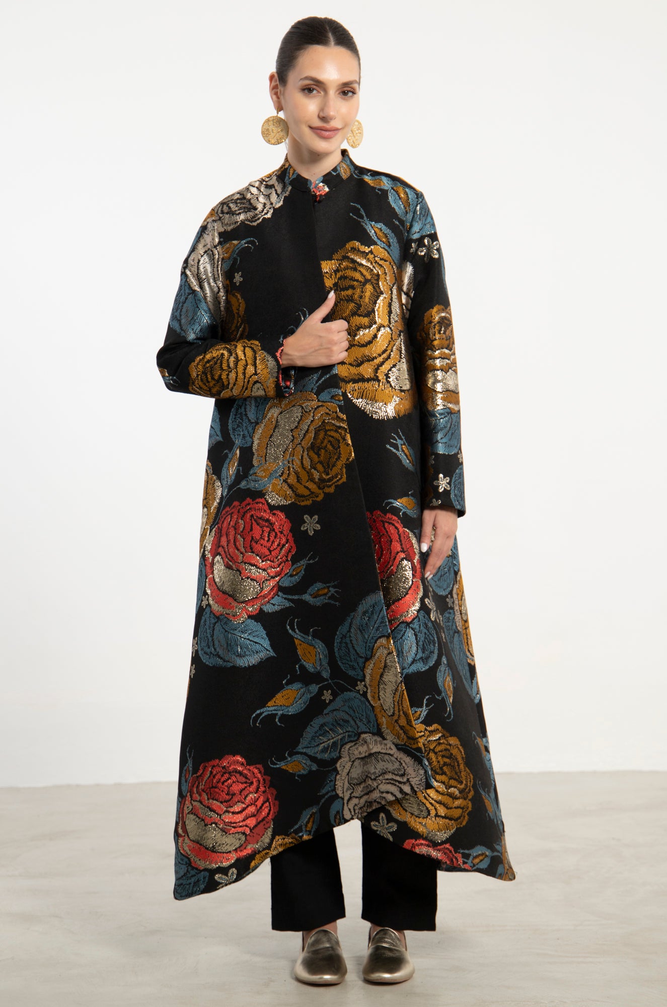 The Dima coat is a statement outerwear piece cut from richly textured jacquard, featuring oversized florals in tones of gold, red, blue, and silver. Designed with a high collar and asymmetrical front closure, it offers bold elegance in a relaxed silhouette.