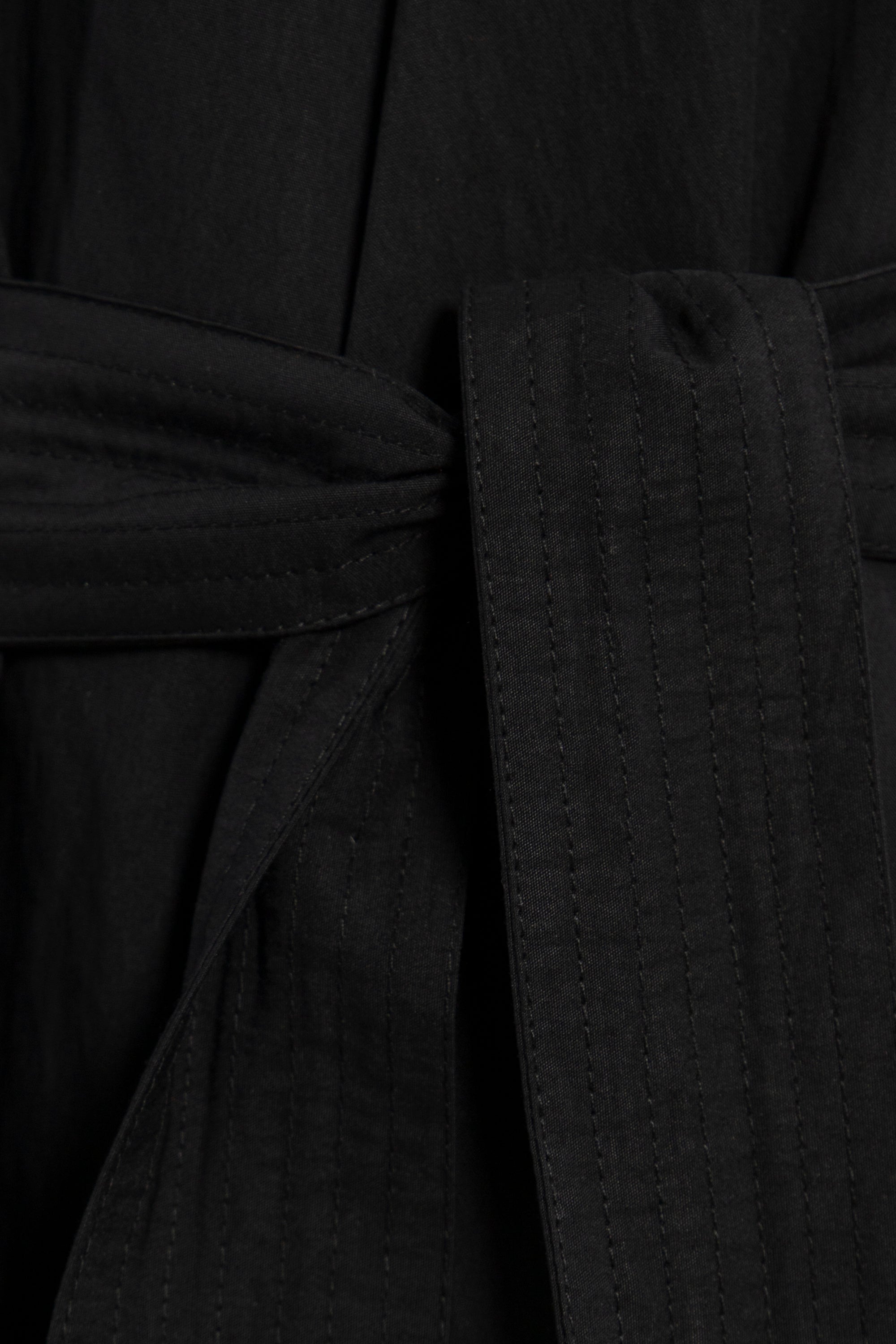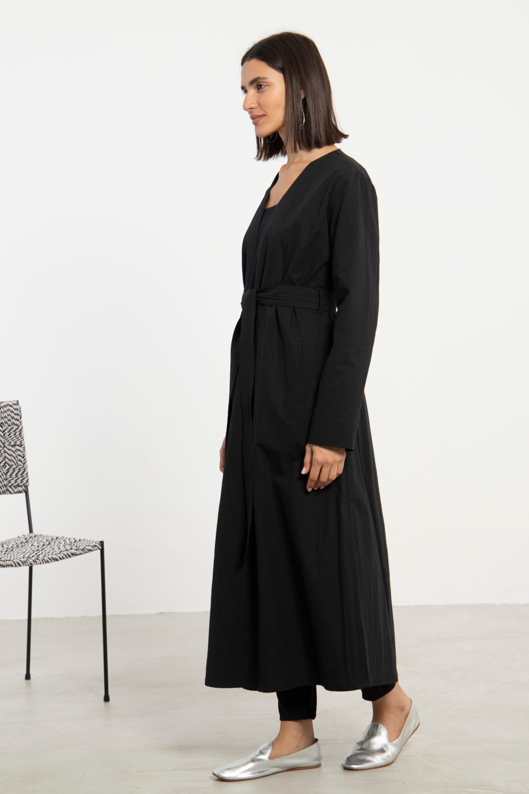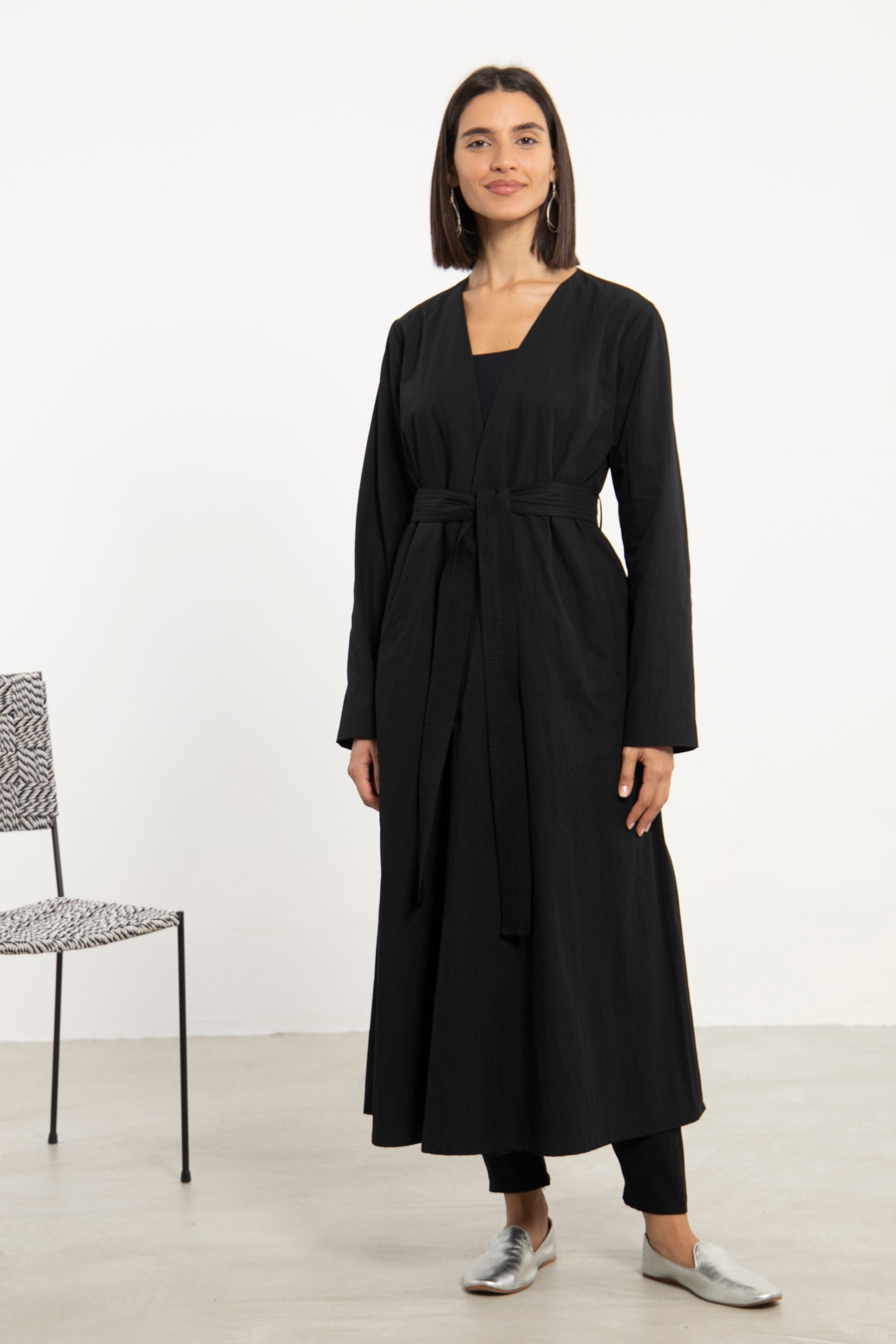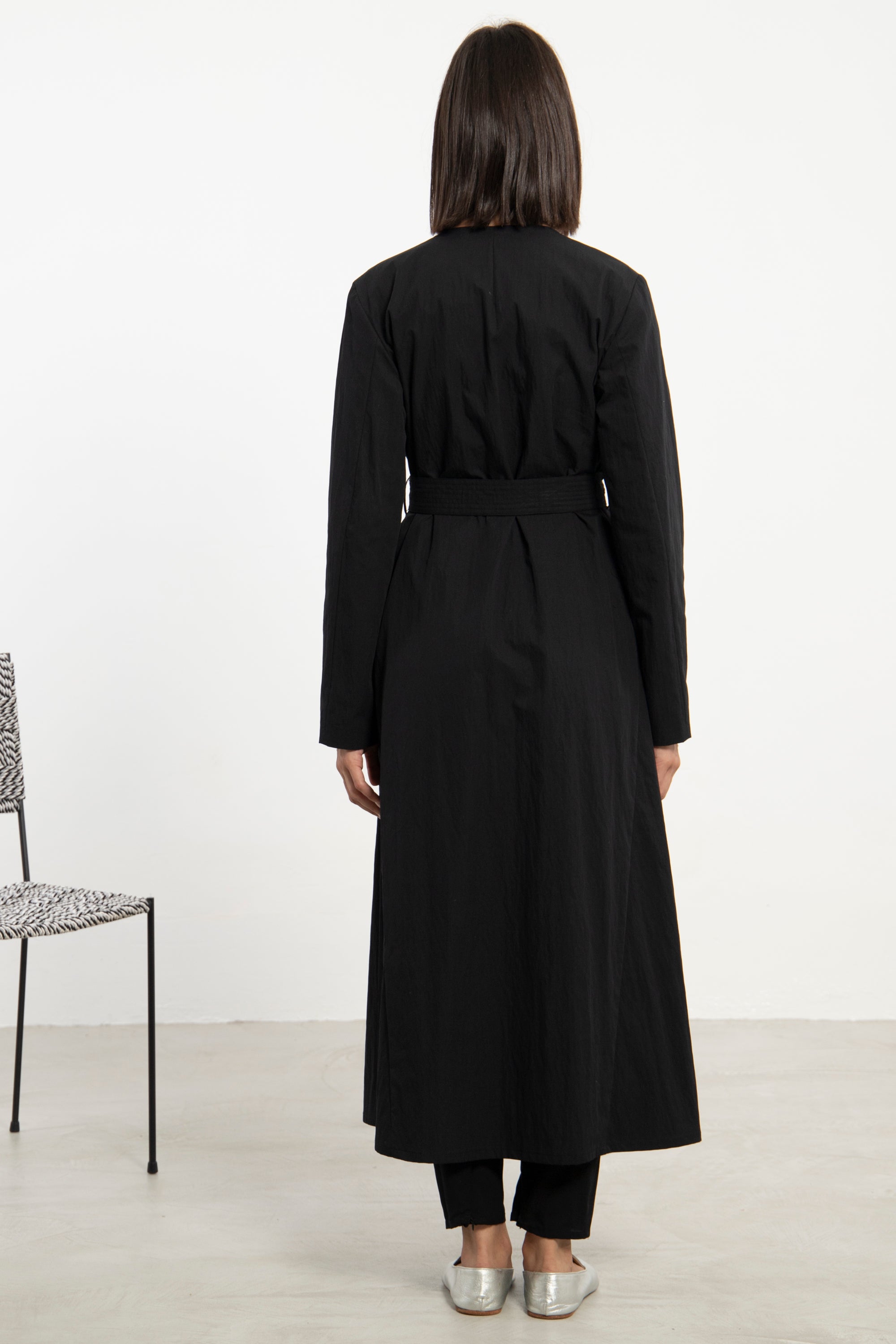 A refined wardrobe staple, the Mara Coat is crafted from thick black cotton and designed with a minimalist silhouette. The detachable belt adds shape and structure, offering versatile wear across seasons.