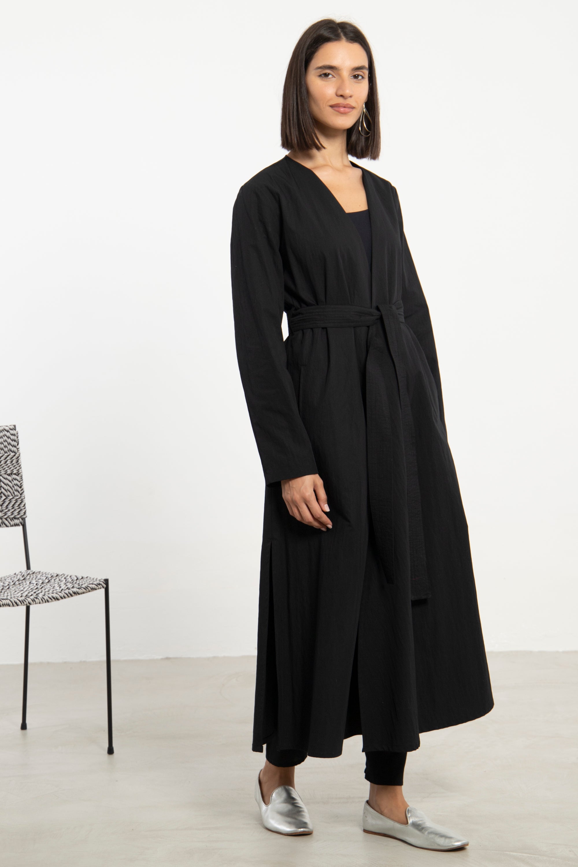 Details: Long coat with self-tie belt and clean open front