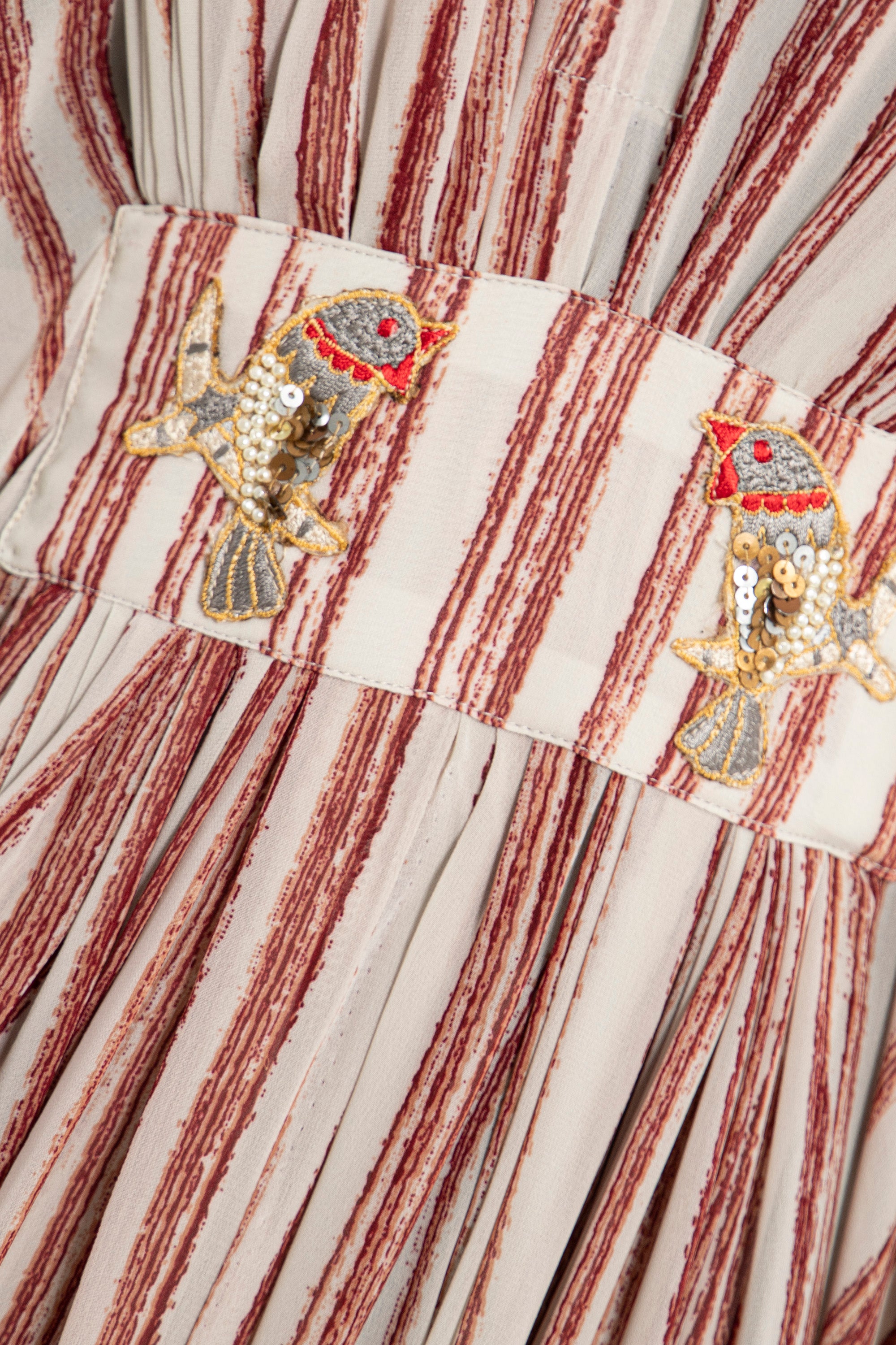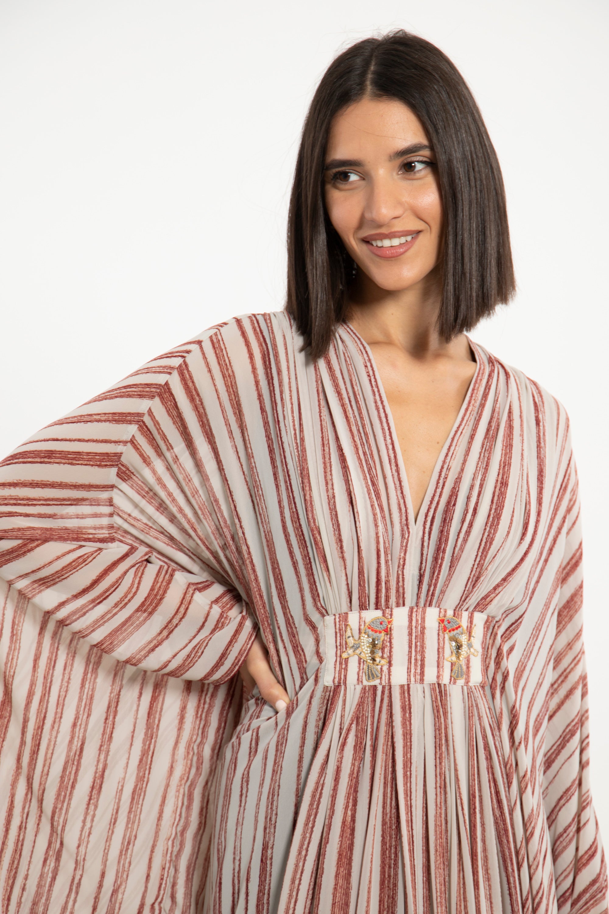 Details: Ivory and rust striped dress with embroidered bird details and inner waist ties