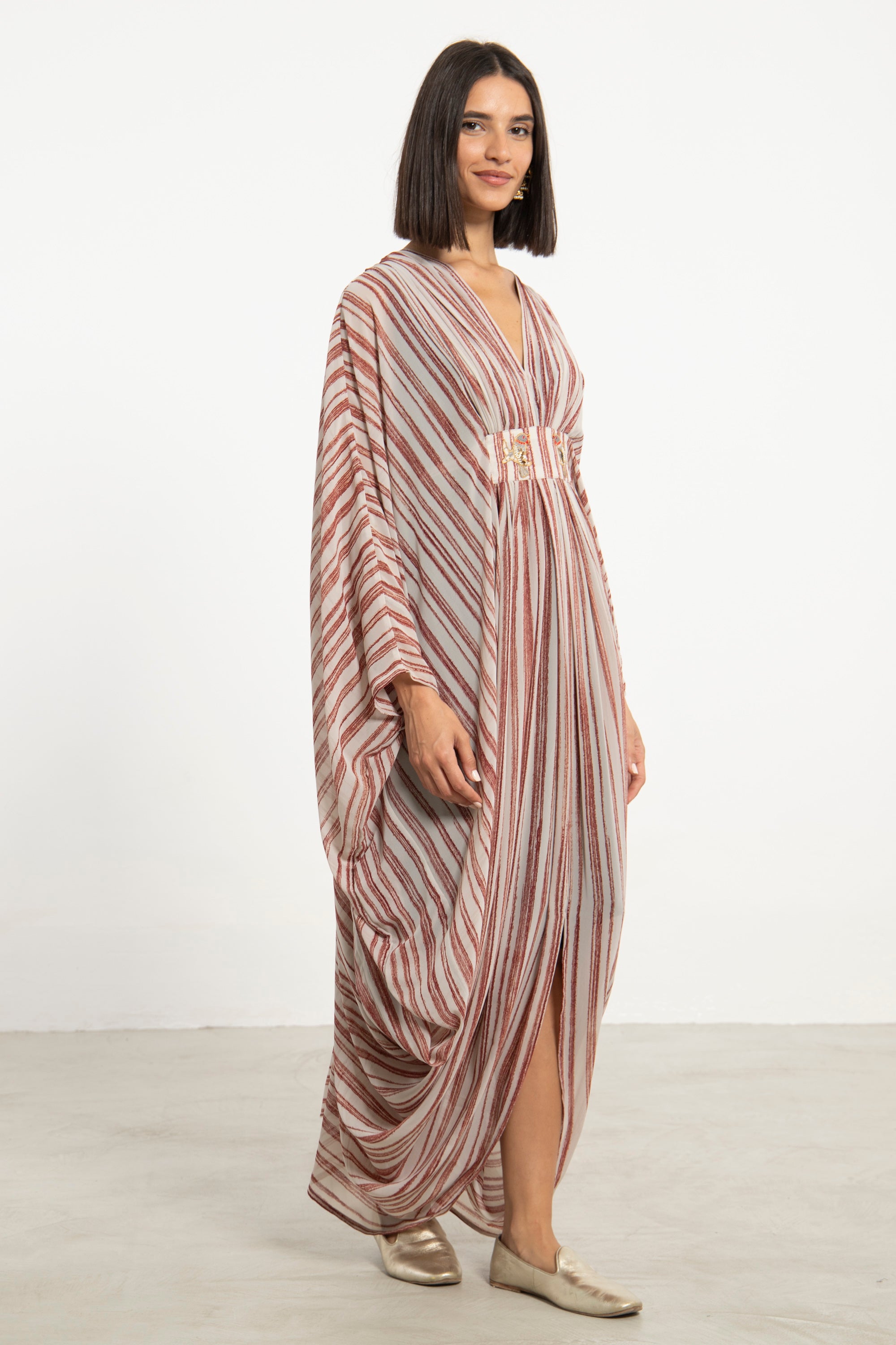 This edition of the Farah Dress is crafted from a cotton-silk blend in a soft ivory tone with rust stripes. Embroidered bird motifs at the waist add a whimsical accent, while the draped silhouette and inner ties allow for effortless cinching.