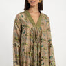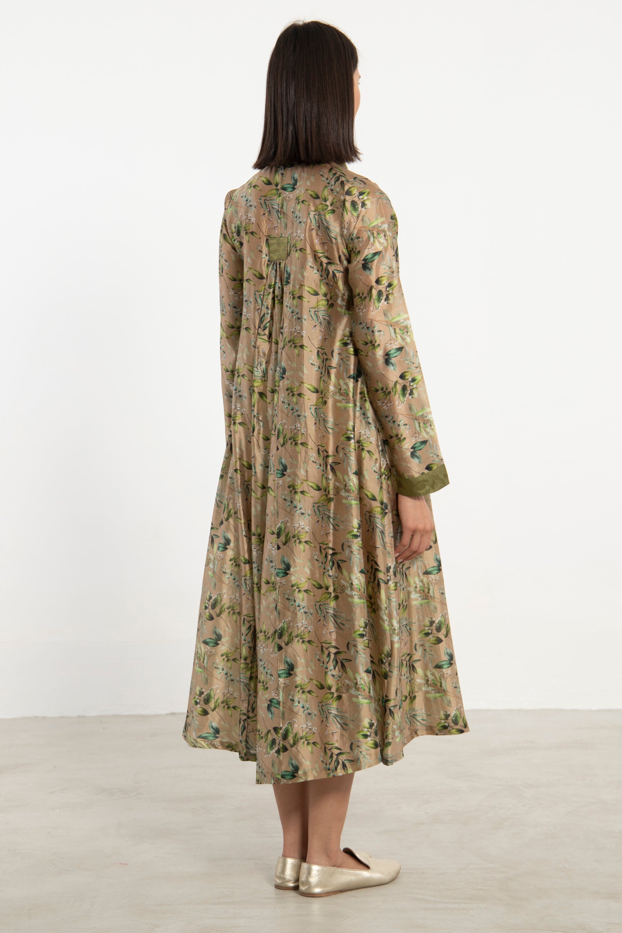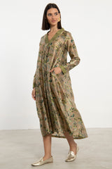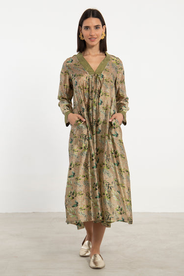 The Jamila dress is crafted from printed silk with a soft sheen, featuring delicate floral motifs in shades of green on a golden-beige base. Designed with a V-neckline, pleated front, and side pockets, it offers a graceful silhouette.