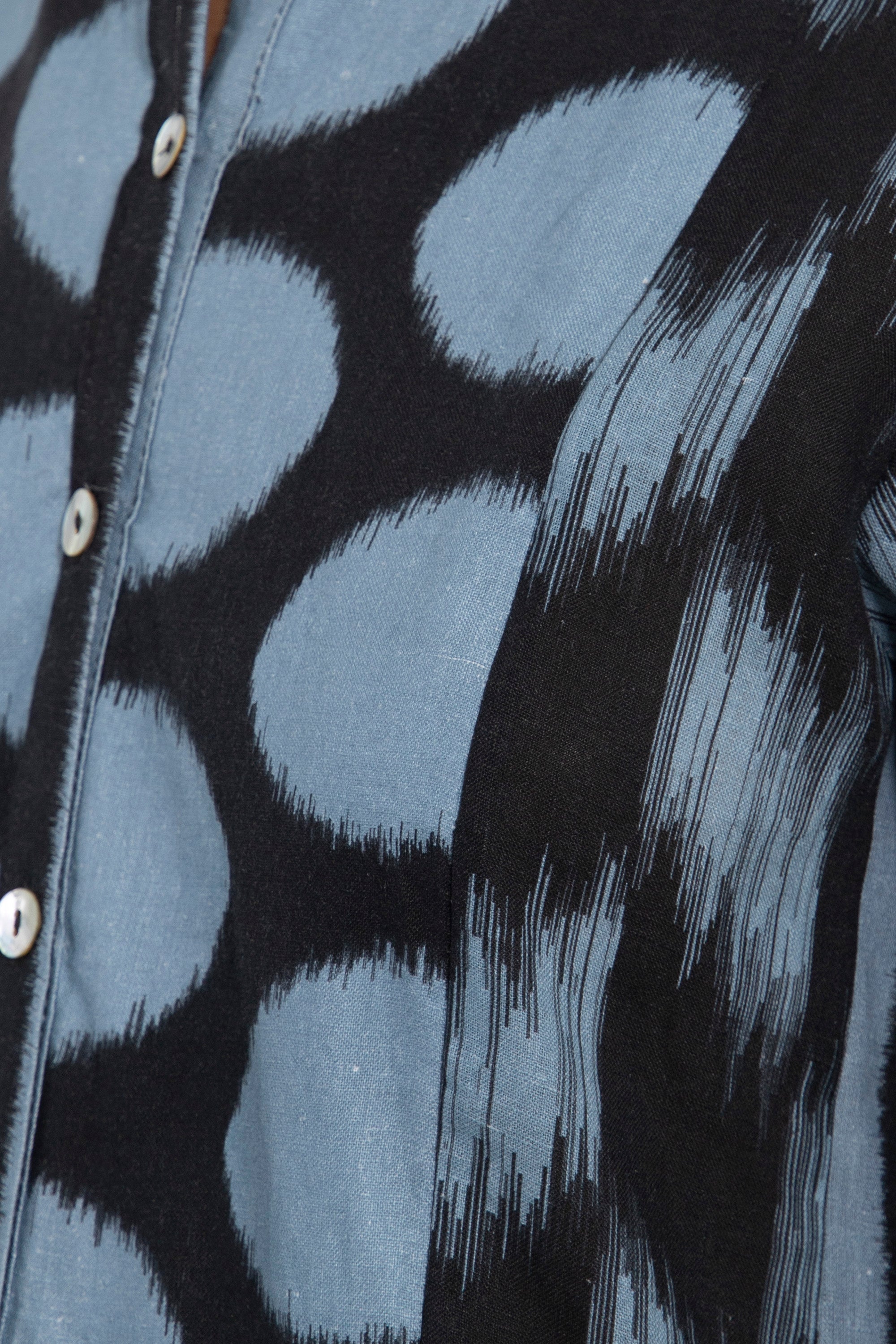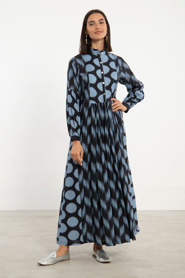 The Katia dress is crafted from breathable linen and features an interplay of blue and black vertical and ikat-inspired patterns. Its structured bodice and gathered skirt create a flattering silhouette, finished with a high collar and front button closure.