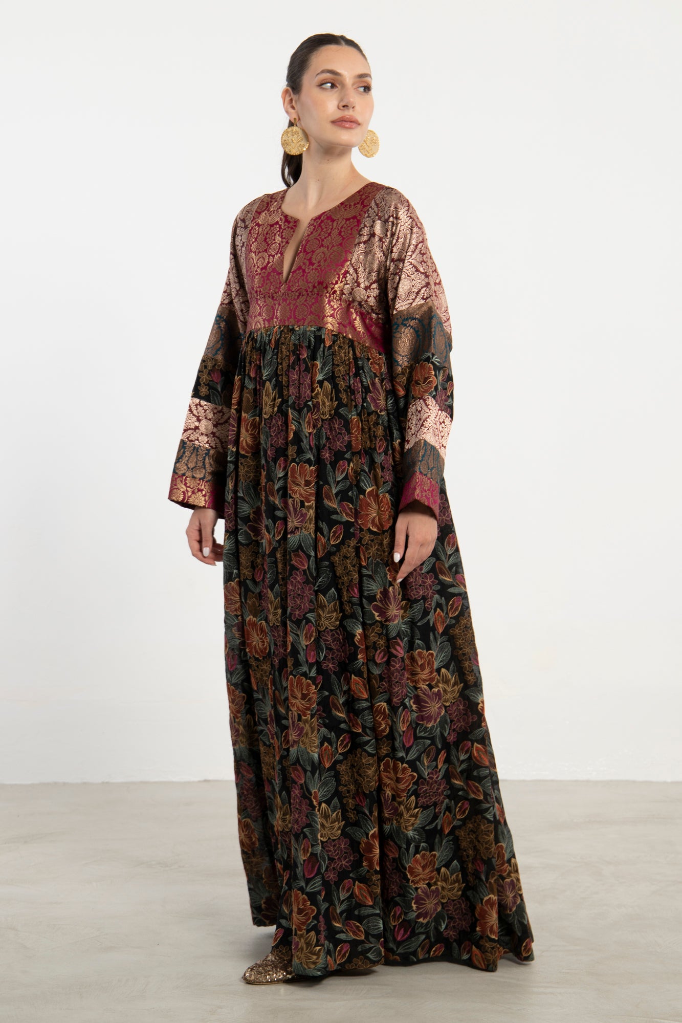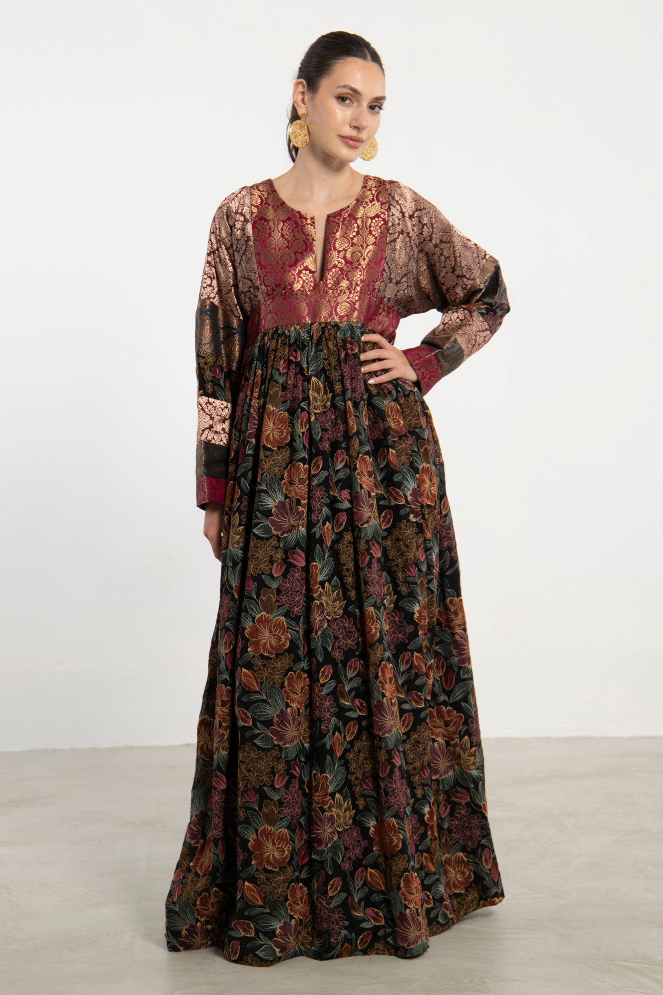 A rich interplay of textures defines the Linda dress, combining an embroidered silk brocade bodice with a voluminous floral jacquard skirt. The design features a softly structured neckline, full sleeves, and a gathered waistline for graceful movement.