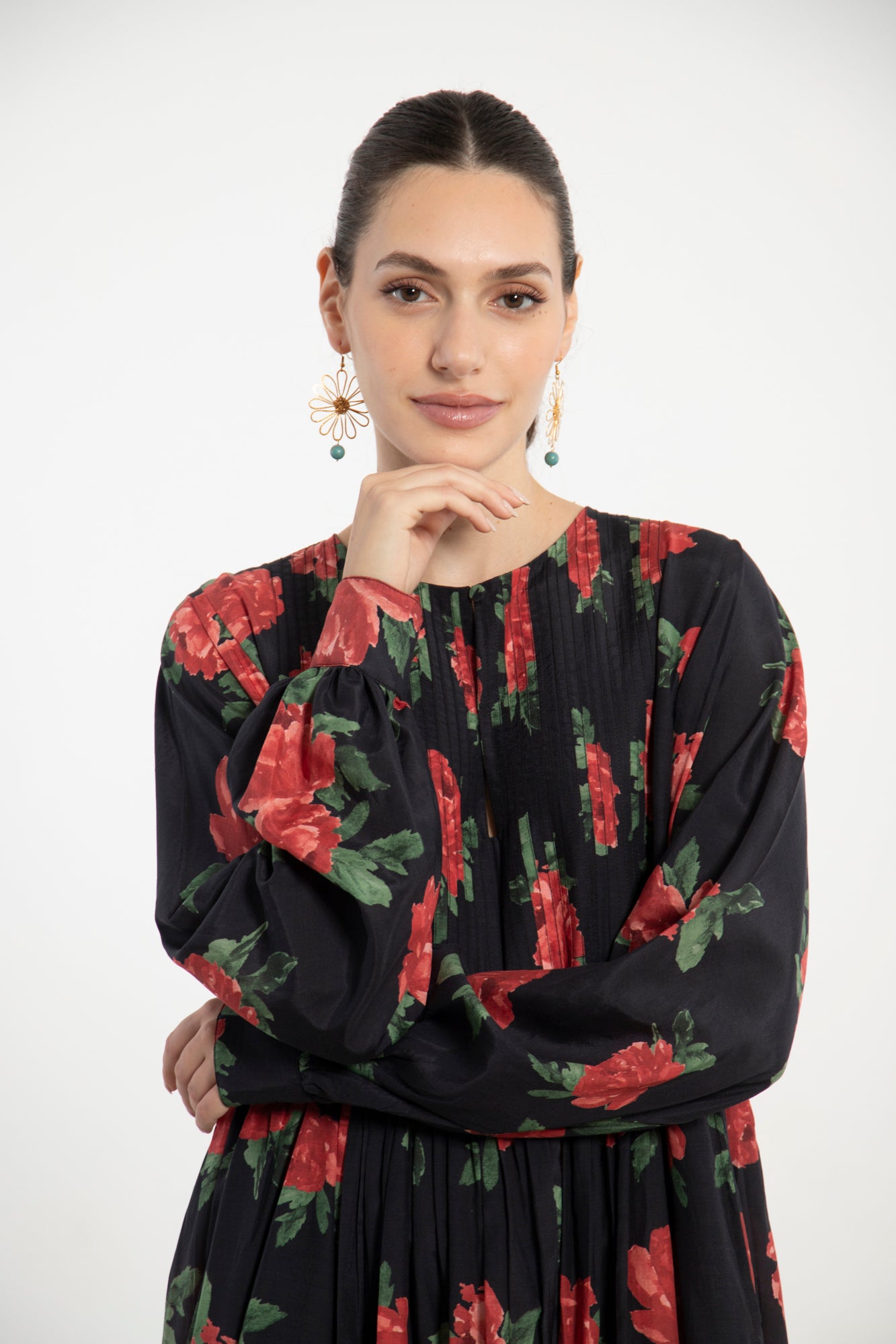 The Imane Dress blends ease and boldness in a flowing silhouette adorned with large red floral prints on black cotton. Gentle pleating at the bodice and voluminous sleeves lend a romantic finish.