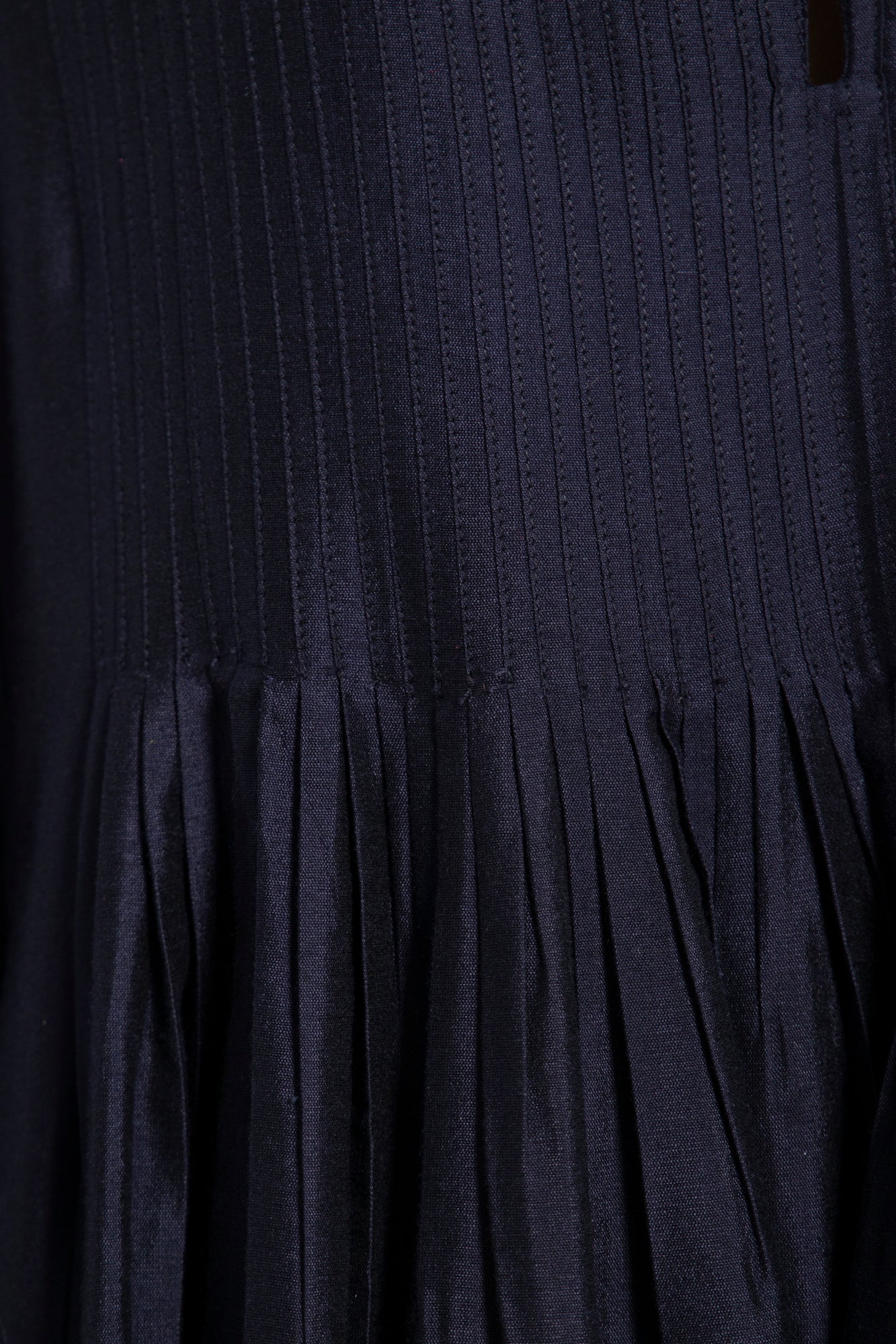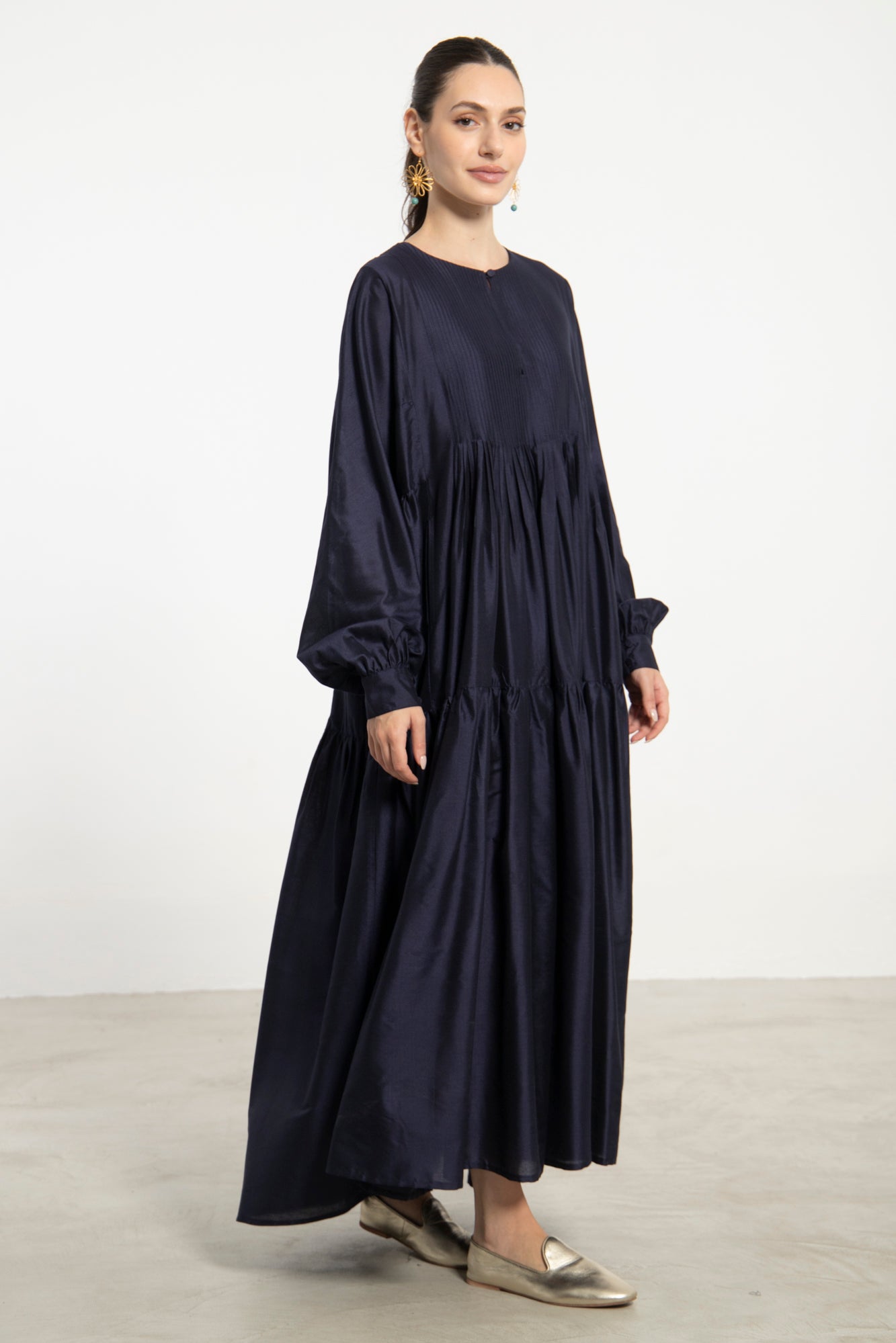The Imane dress in navy silk is defined by its gathered tiers and softly structured silhouette. Featuring a pleated bodice, a delicate keyhole neckline, and voluminous sleeves, it balances refinement with ease.