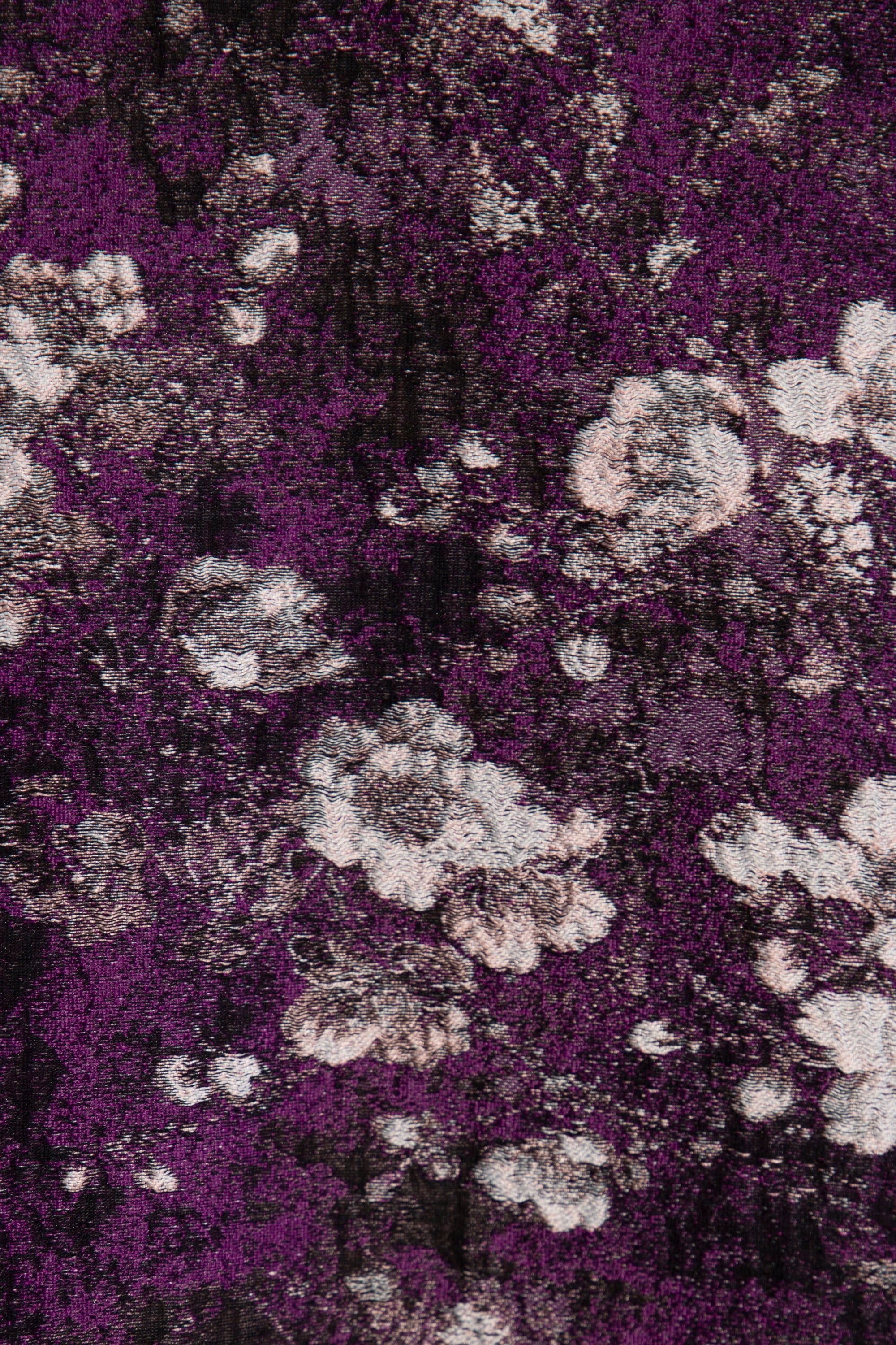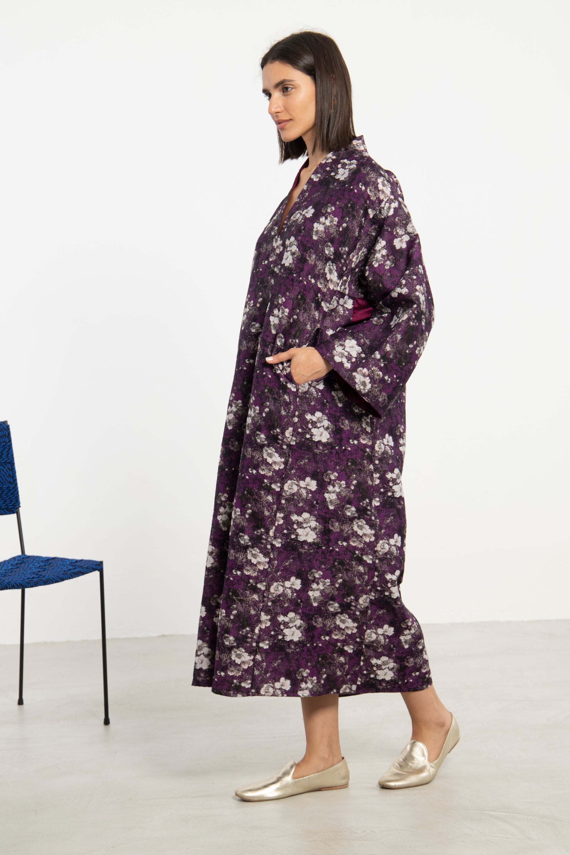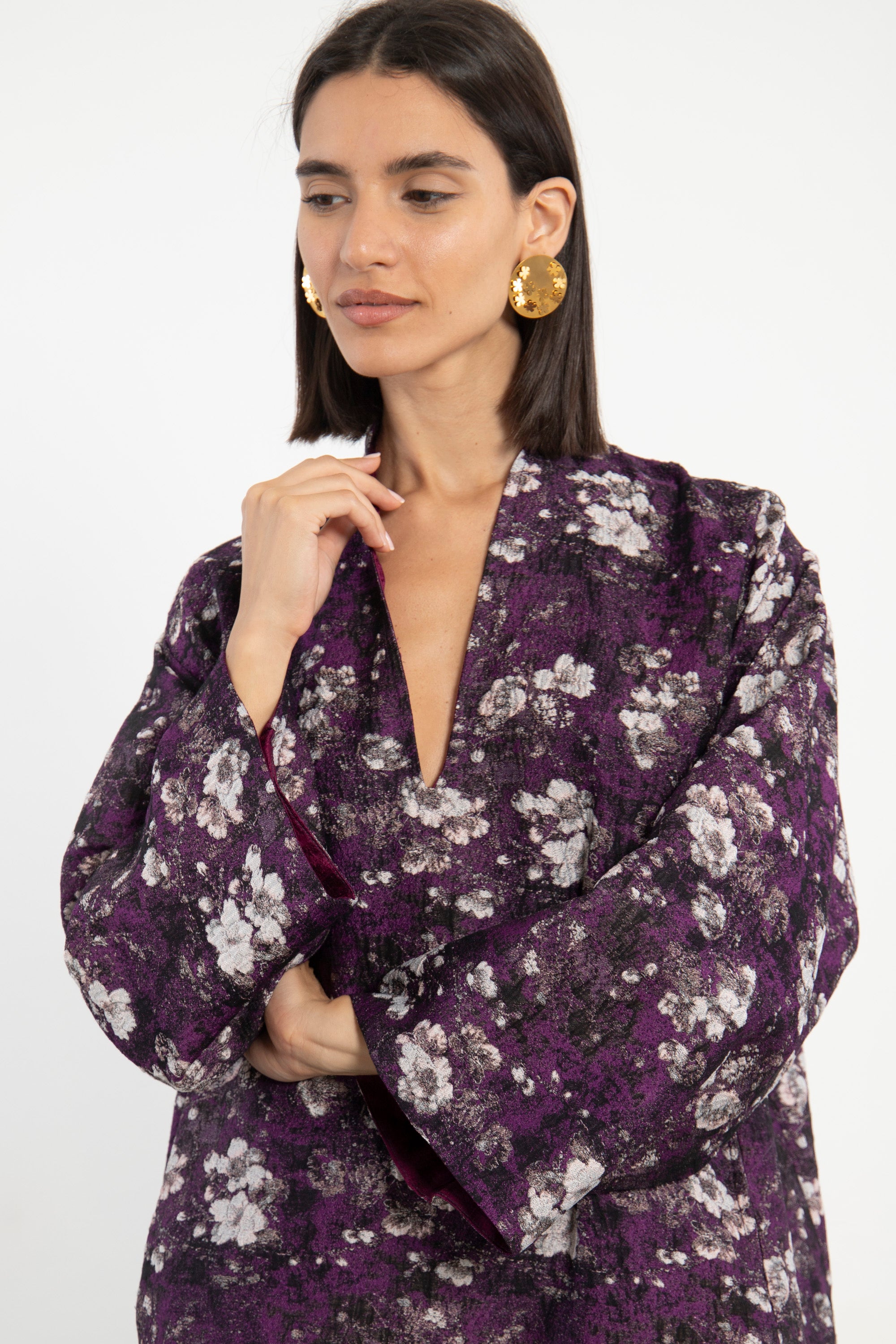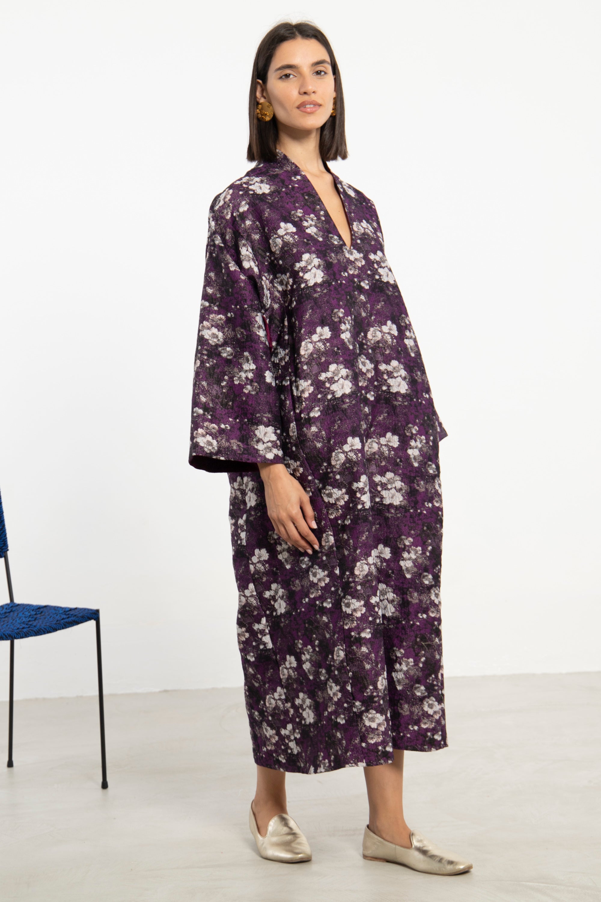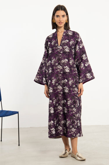 The Nisrine Dress is cut from thick cotton, featuring a deep purple base with delicate floral motifs. Designed with a V-neckline and wide sleeves, it offers both structure and ease in a relaxed silhouette.
