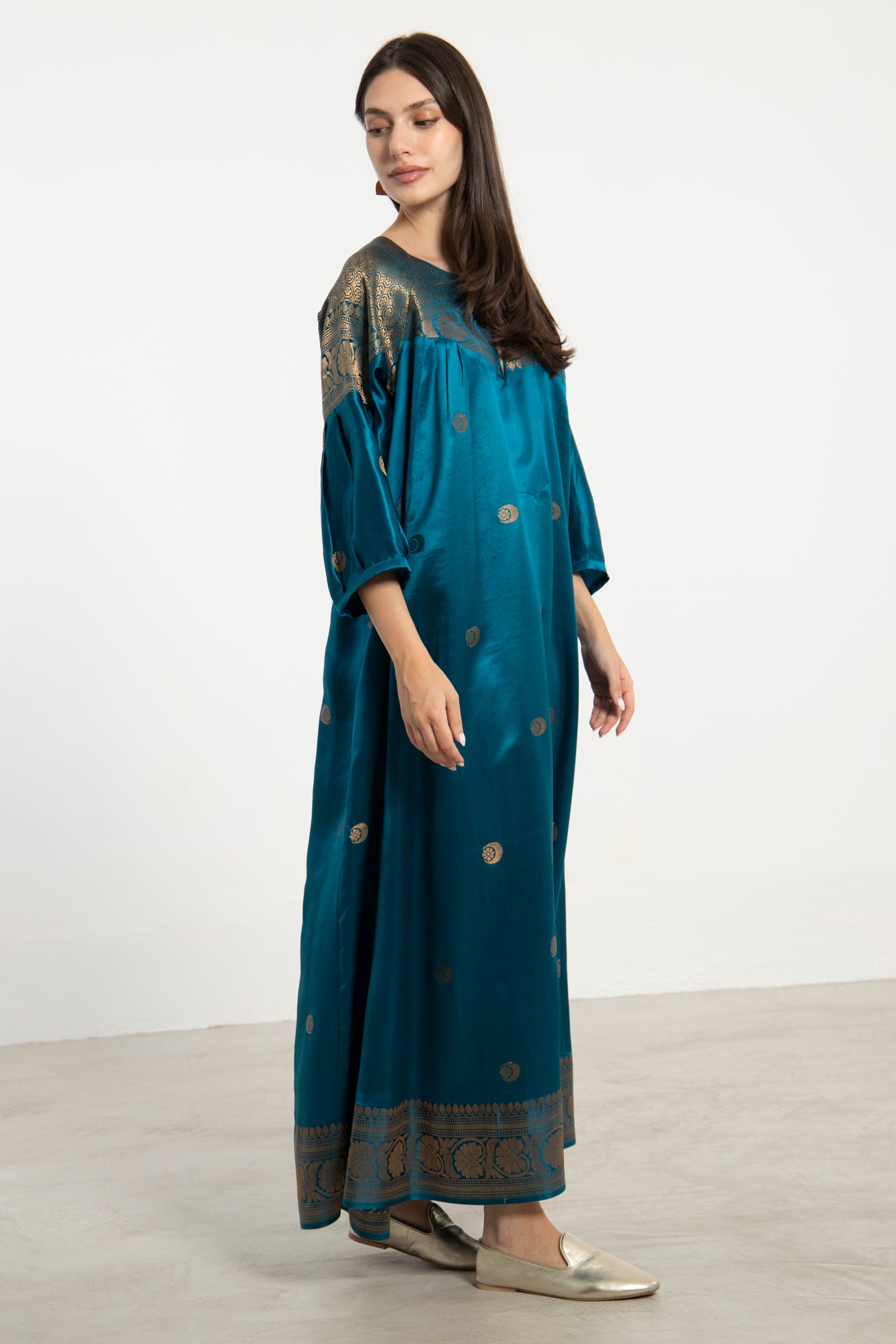 A dress in blue silk brocade, the Rania Dress is defined by its intricate metallic patterns and flowing silhouette, offering a refined statement for any occasion.