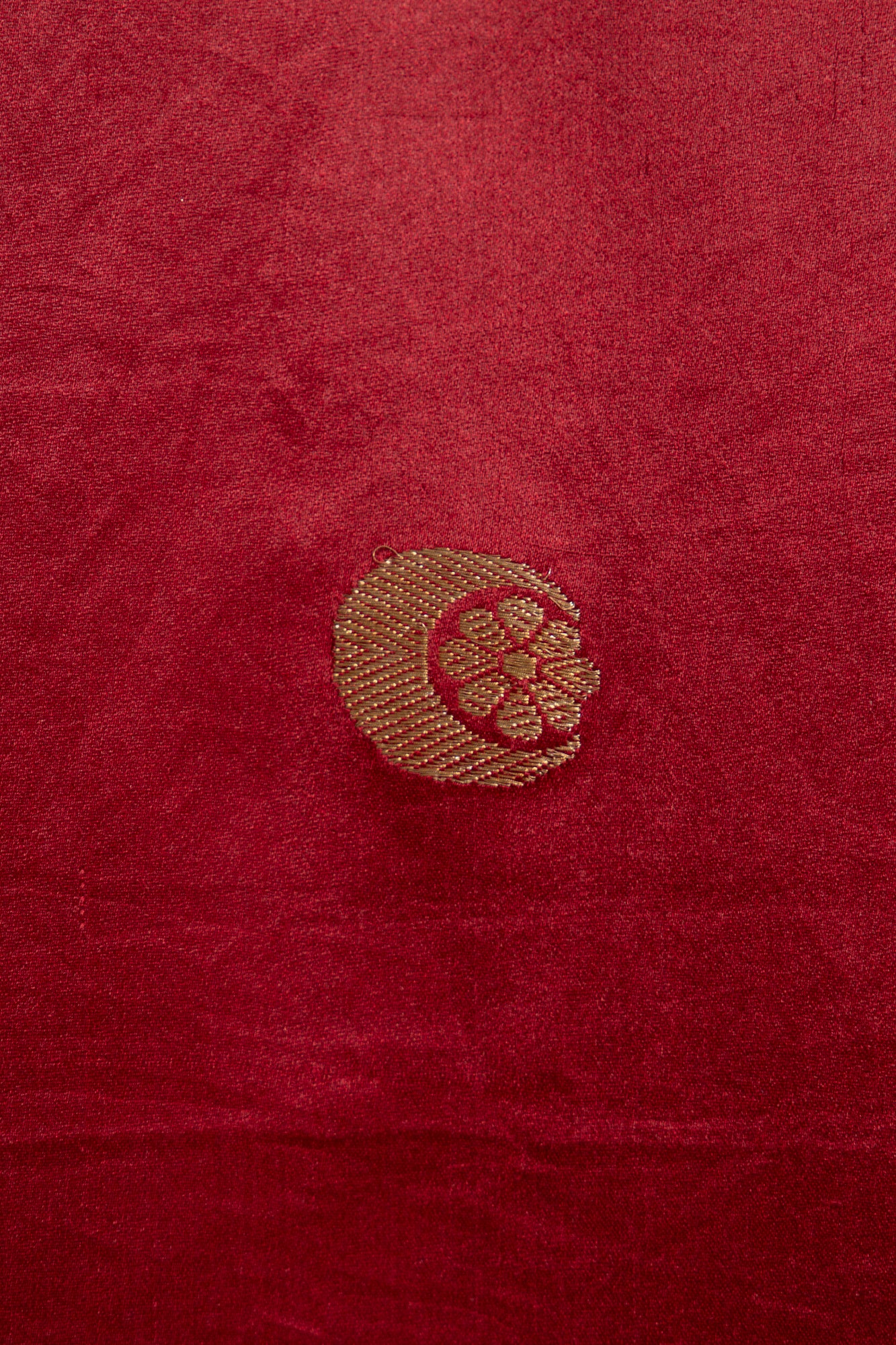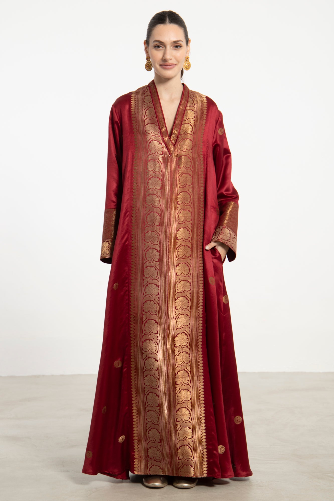 A striking one-of-a-kind piece, the Soula Dress is crafted from deep burgundy silk and adorned with intricate golden motifs and borders. This dress features a flowing cut, long sleeves, and an ornate front panel, offering timeless elegance.