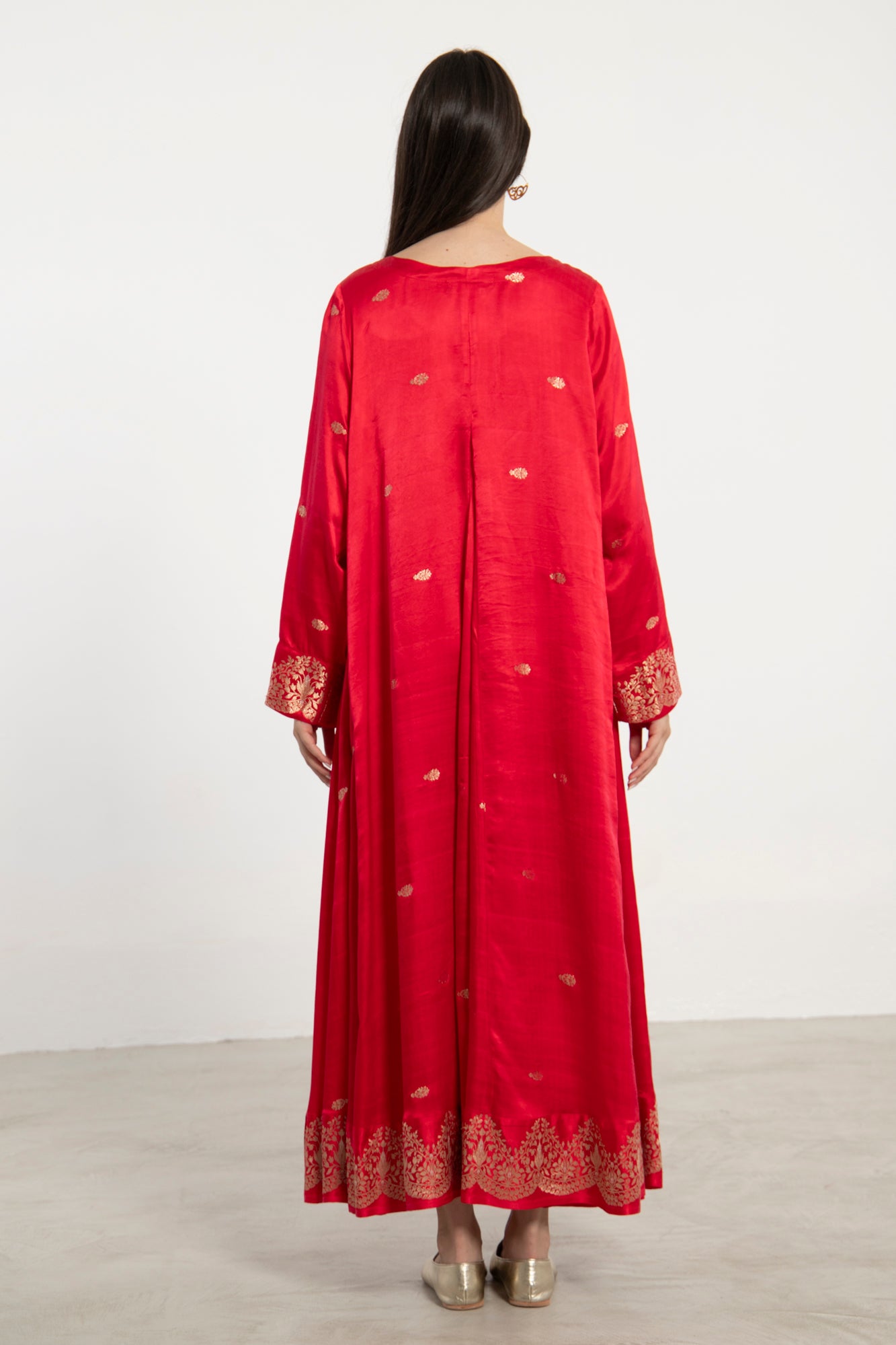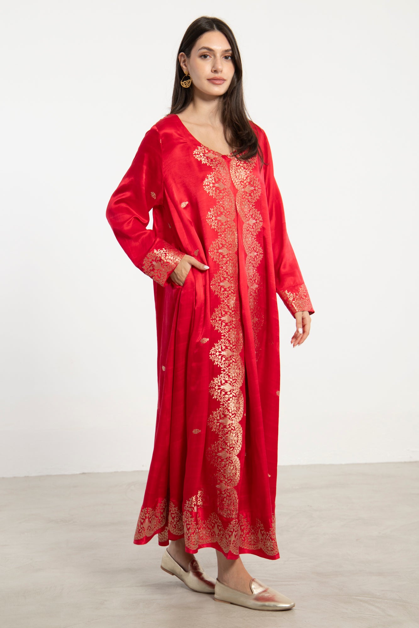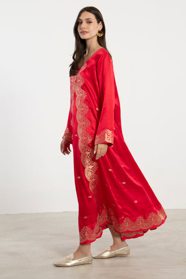 A striking one-of-a-kind piece, the Souraya dress is crafted from lustrous red silk and detailed with intricate woven golden threads along the front, cuffs, and hem. Designed with a flowing silhouette and side pockets, it merges opulence with ease.