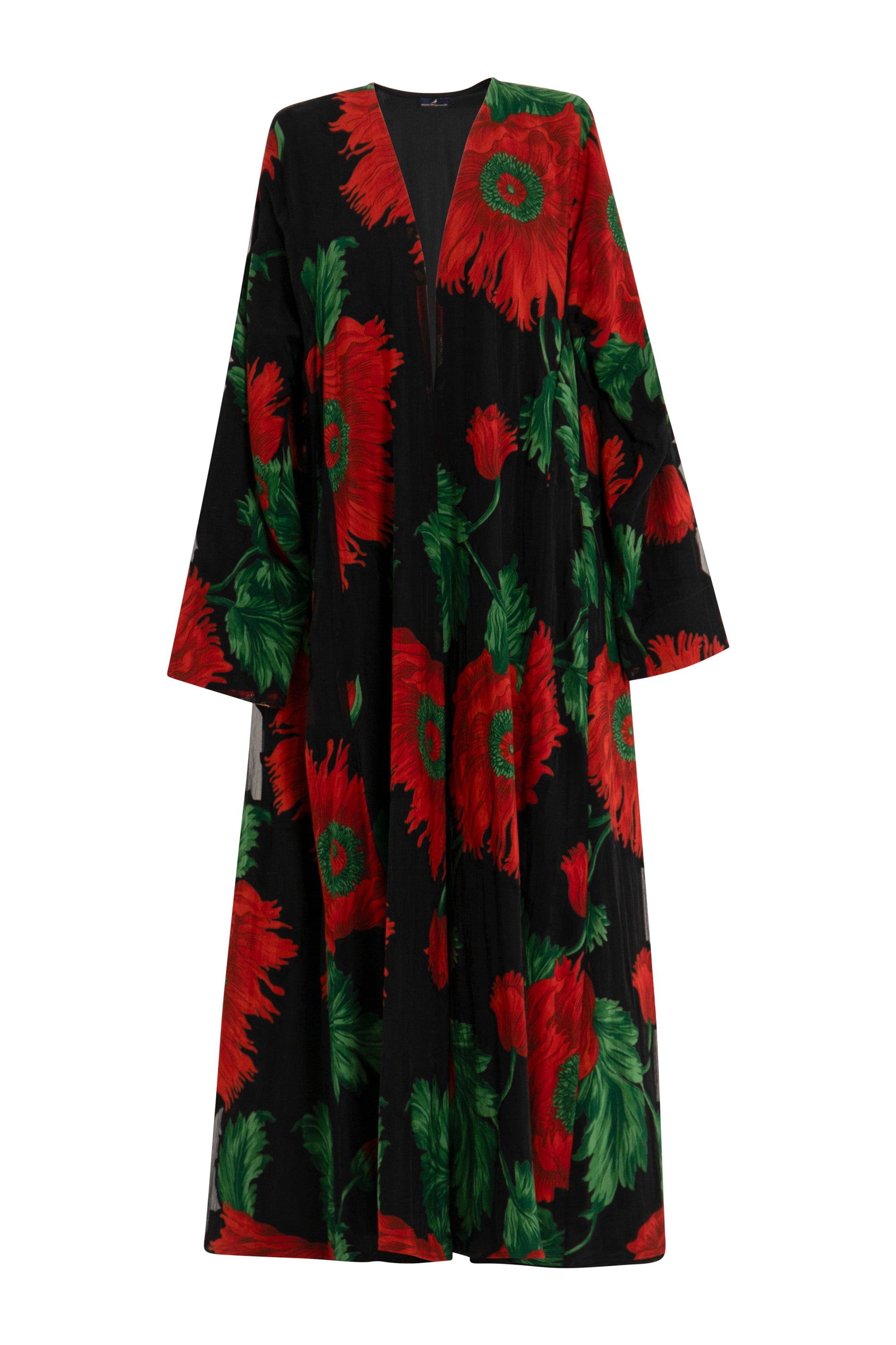 A statement long coat in bold floral cotton, accented with rich silk brocade bands in red and green. Its open-front design and fluid drape make it a versatile outer layer for both day and evening wear.